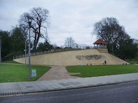 A motte and bailey castle erected c. 1100-1130; the castle sustained sieges in 1132, 1137, 1145 and 1153 prior to its demolition in 1224; this was thoroughly carried out and only a portion of the motte remains with a slight section of its surrounding ditch, together with a second mound to the north - now covered with buildings. (PastScape)