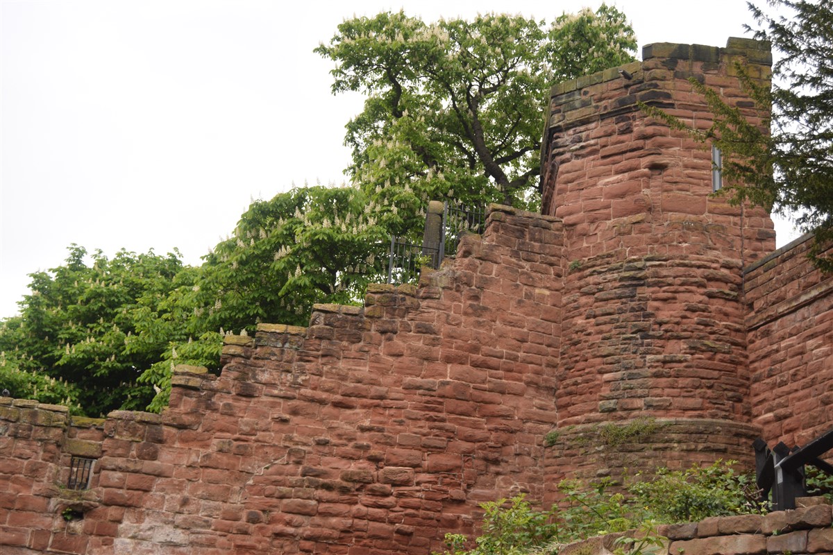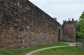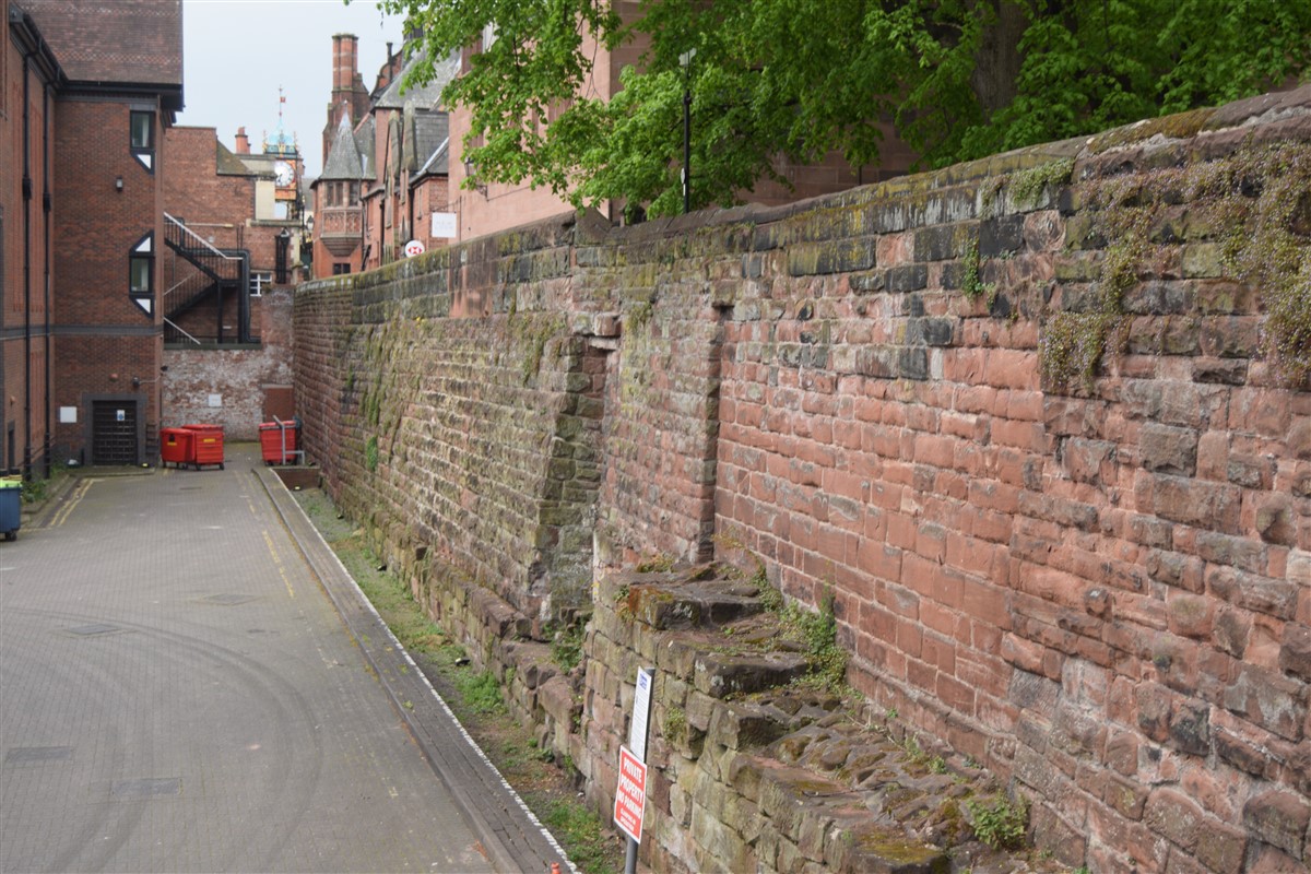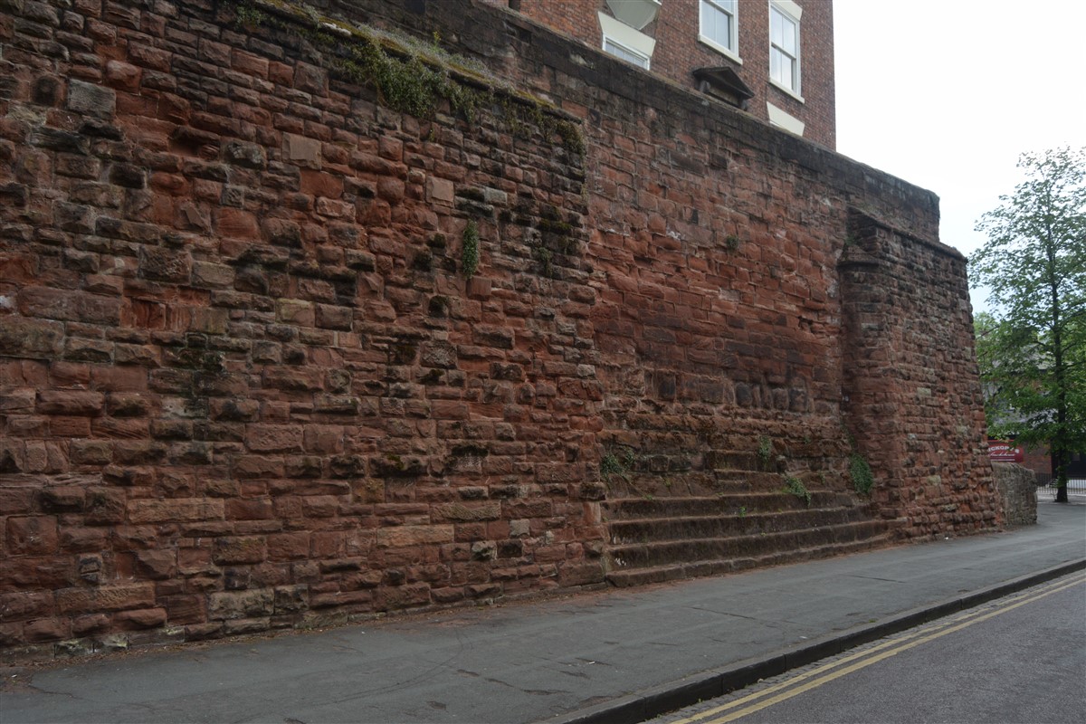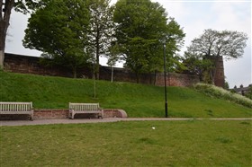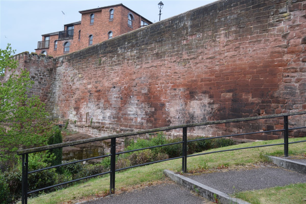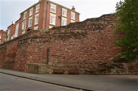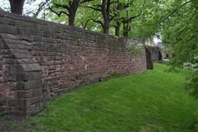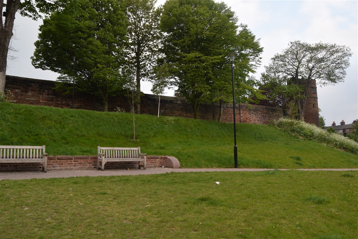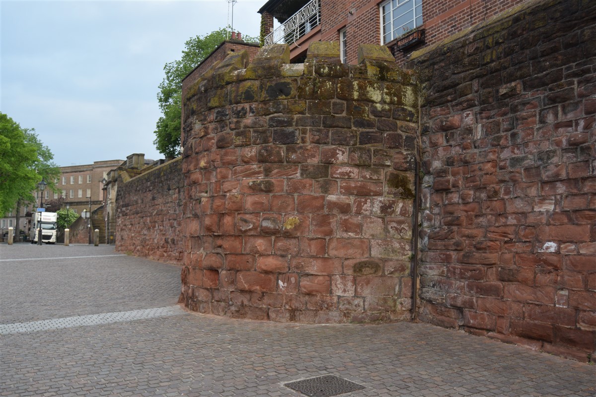 The present circuit of the City Walls is nearly two miles long and consists of four gates and several towers, all linked by a red sandstone wall. The north and east walls follow the original Roman foundations, which still remain in some cases, but the south and west walls were extended in the medieval period to include the castle to the south. The extension to the medieval walls must have taken place before 1121, as the Ship Gate is mentioned in the confirmation charter of St. Werburgh's Abbey. The present walls follow roughly the area of the medieval walled town, although most of the material above walk level is C18 or C19. The wall was probably originally defended by battlements to the outside, while the interior was protected by timber rails mounted on stone projections, which can still be seen at the Kaleyard gate. The north and east sides of the city wall were also protected by a ditch, which ran from Pemberton's parlour to just beyond the Newgate. Beyond this stretch, the slope of the ground was relied upon for protection. The repair and upkeep of the walls was a costly business, and was paid for by 'murage', a toll upon certain goods entering the city. The damage caused by the Civil War swept away much of the medieval work, and the walls were repaired during the reign of Queen Anne. In the C17 and C18 the ditches were filled in and the walls repaired, the medieval gates being replaced. The walls continued to be rebuilt and repaired so that the wall-walk could be maintained as a promenade. Most of the walls visible above ground level today are C18 or C19. (Cheshire HER)