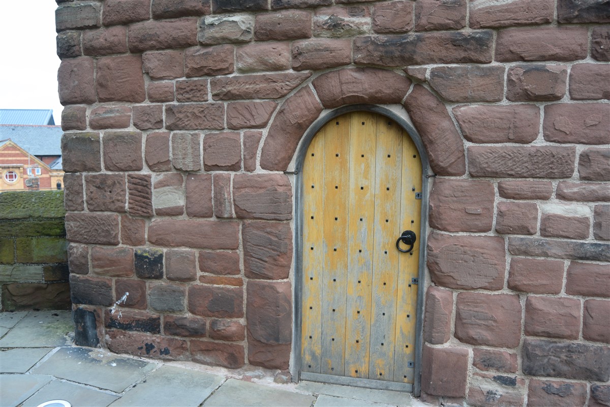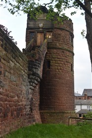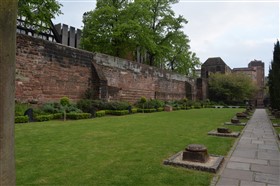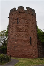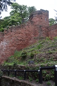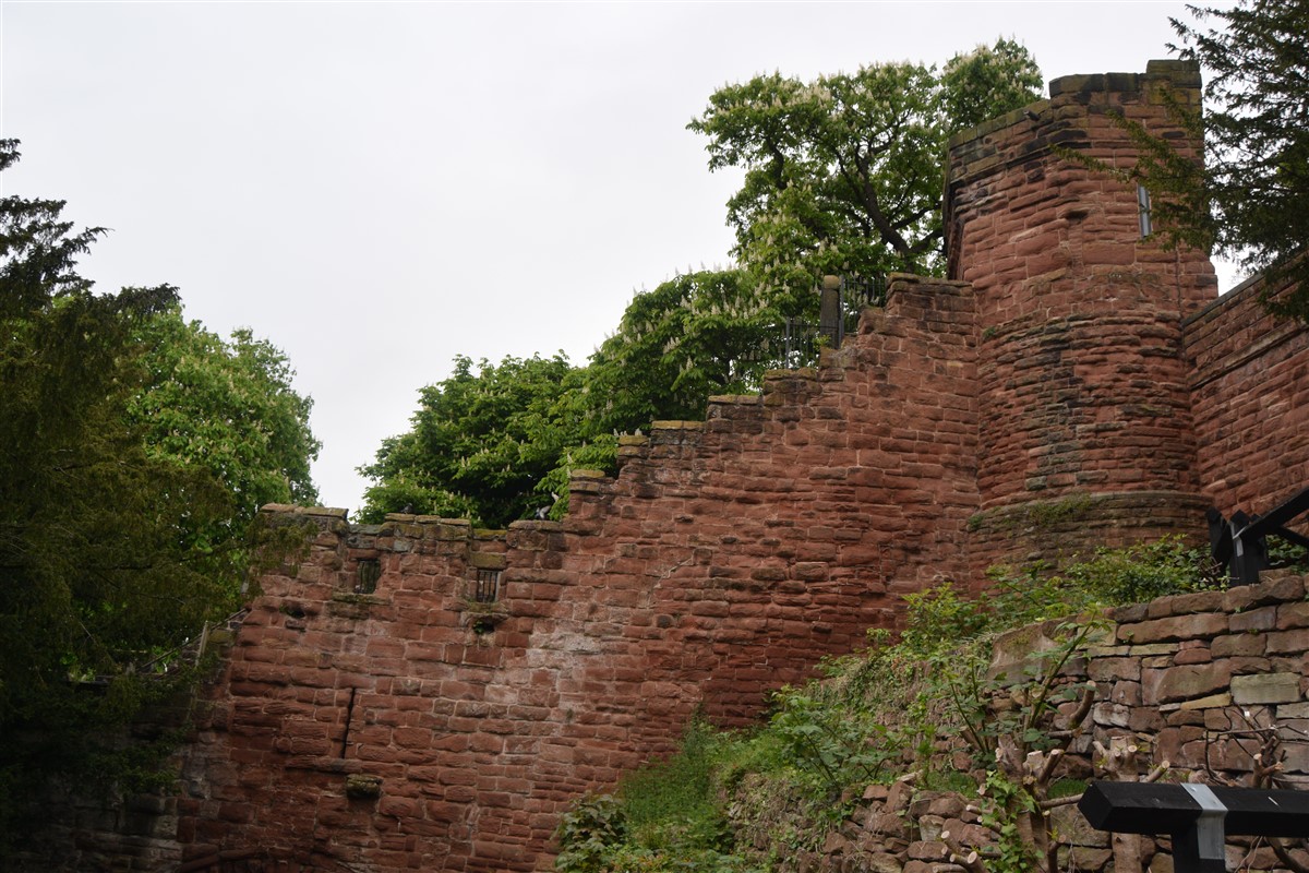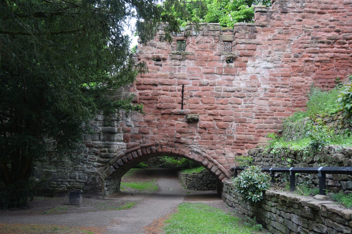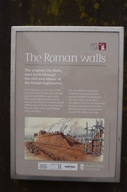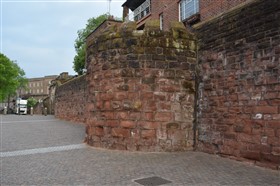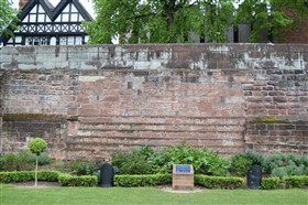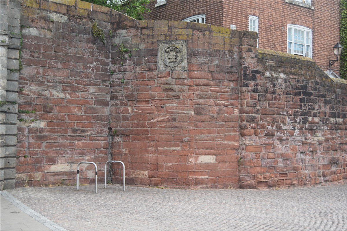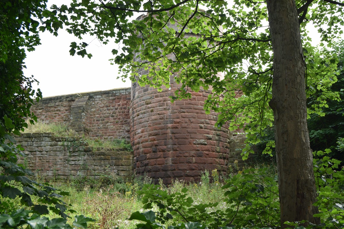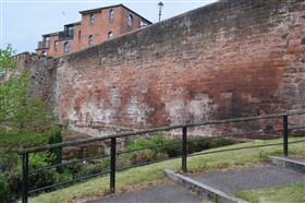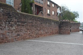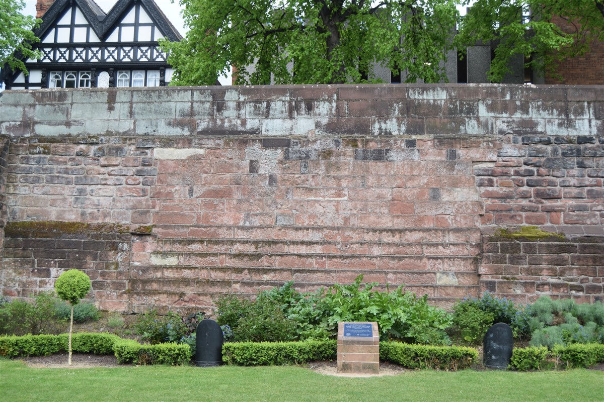 The present circuit of the City Walls is nearly two miles long and consists of four gates and several towers, all linked by a red sandstone wall. The north and east walls follow the original Roman foundations, which still remain in some cases, but the south and west walls were extended in the medieval period to include the castle to the south. The extension to the medieval walls must have taken place before 1121, as the Ship Gate is mentioned in the confirmation charter of St. Werburgh's Abbey. The present walls follow roughly the area of the medieval walled town, although most of the material above walk level is C18 or C19. The wall was probably originally defended by battlements to the outside, while the interior was protected by timber rails mounted on stone projections, which can still be seen at the Kaleyard gate. The north and east sides of the city wall were also protected by a ditch, which ran from Pemberton's parlour to just beyond the Newgate. Beyond this stretch, the slope of the ground was relied upon for protection. The repair and upkeep of the walls was a costly business, and was paid for by 'murage', a toll upon certain goods entering the city. The damage caused by the Civil War swept away much of the medieval work, and the walls were repaired during the reign of Queen Anne. In the C17 and C18 the ditches were filled in and the walls repaired, the medieval gates being replaced. The walls continued to be rebuilt and repaired so that the wall-walk could be maintained as a promenade. Most of the walls visible above ground level today are C18 or C19. (Cheshire HER)