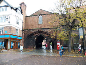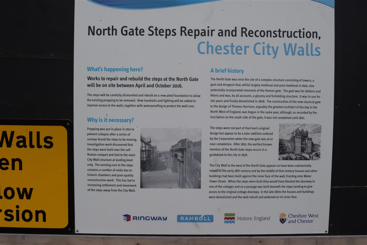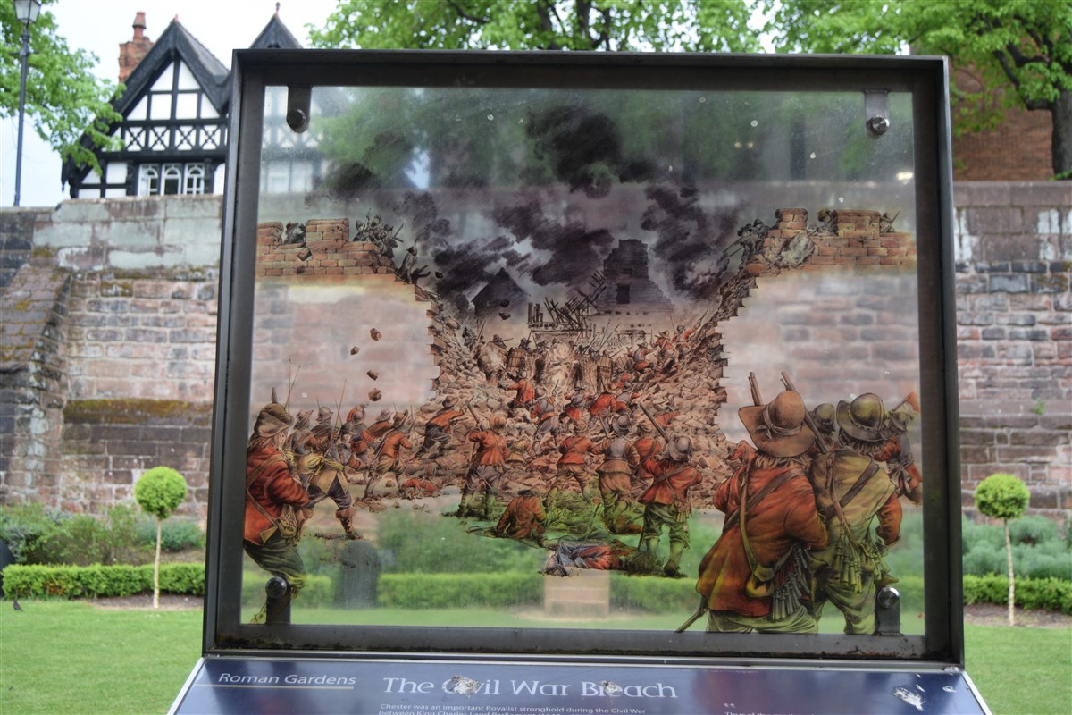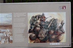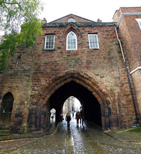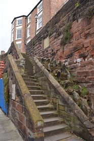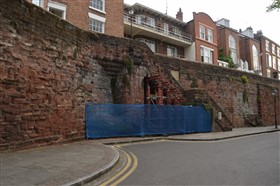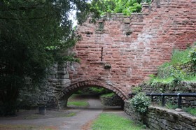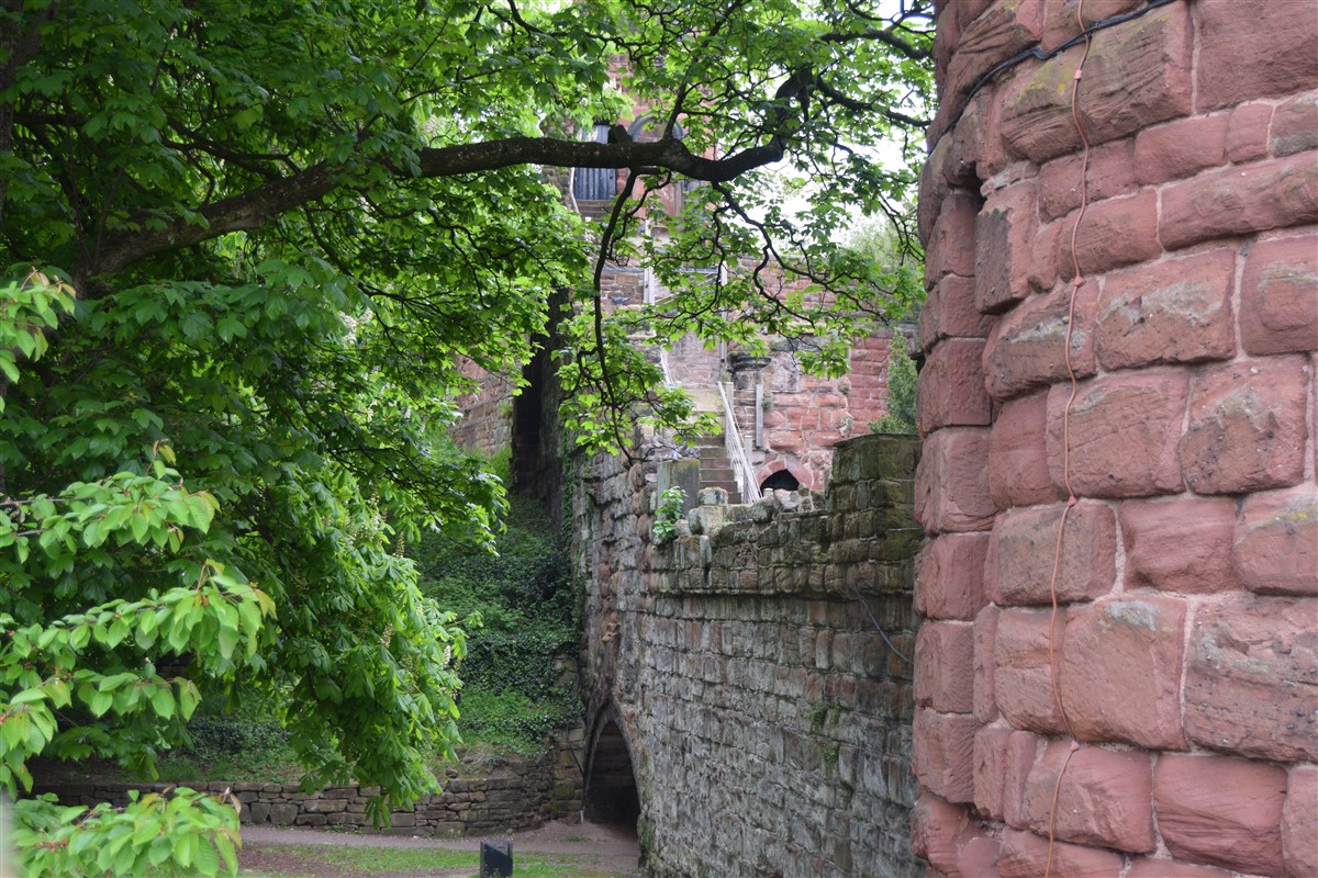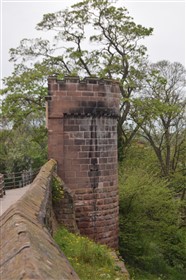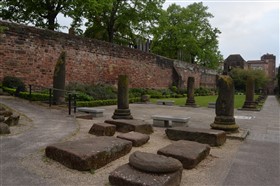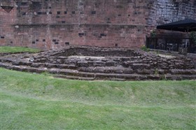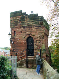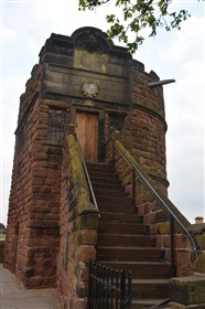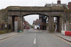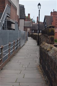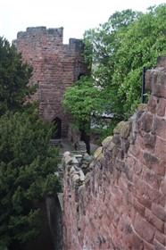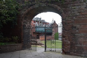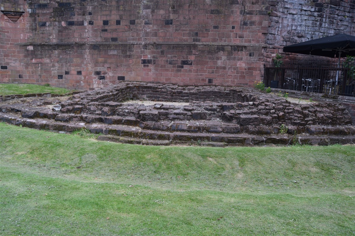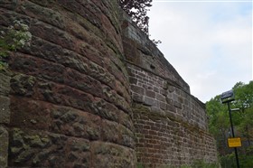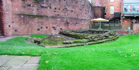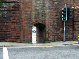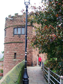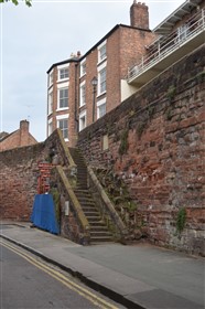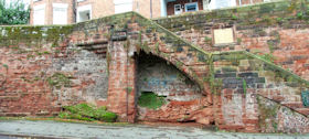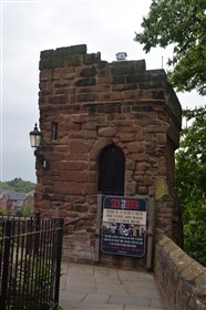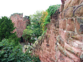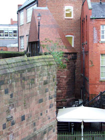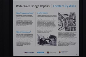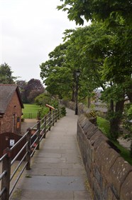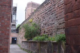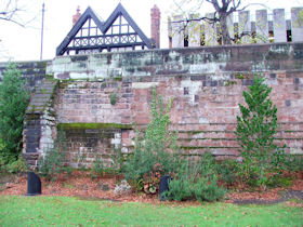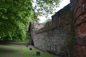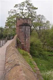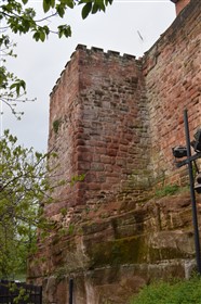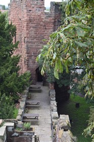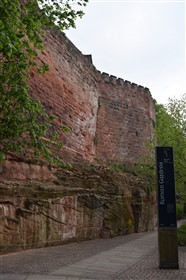 The present circuit of the City Walls is nearly two miles long and consists of four gates and several towers, all linked by a red sandstone wall. The north and east walls follow the original Roman foundations, which still remain in some cases, but the south and west walls were extended in the medieval period to include the castle to the south. The extension to the medieval walls must have taken place before 1121, as the Ship Gate is mentioned in the confirmation charter of St. Werburgh's Abbey. The present walls follow roughly the area of the medieval walled town, although most of the material above walk level is C18 or C19. The wall was probably originally defended by battlements to the outside, while the interior was protected by timber rails mounted on stone projections, which can still be seen at the Kaleyard gate. The north and east sides of the city wall were also protected by a ditch, which ran from Pemberton's parlour to just beyond the Newgate. Beyond this stretch, the slope of the ground was relied upon for protection. The repair and upkeep of the walls was a costly business, and was paid for by 'murage', a toll upon certain goods entering the city. The damage caused by the Civil War swept away much of the medieval work, and the walls were repaired during the reign of Queen Anne. In the C17 and C18 the ditches were filled in and the walls repaired, the medieval gates being replaced. The walls continued to be rebuilt and repaired so that the wall-walk could be maintained as a promenade. Most of the walls visible above ground level today are C18 or C19. (Cheshire HER)
