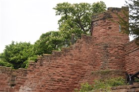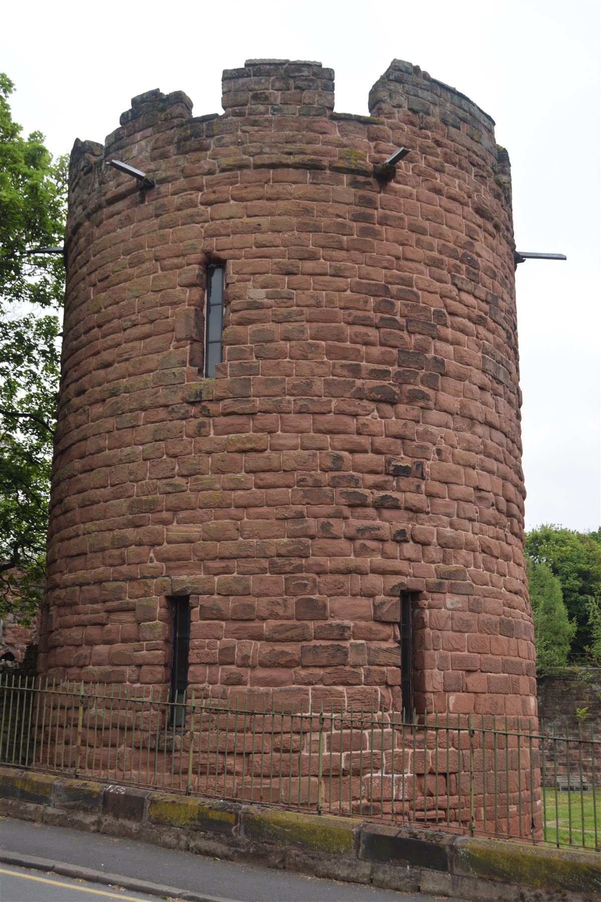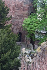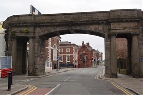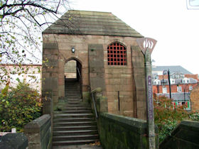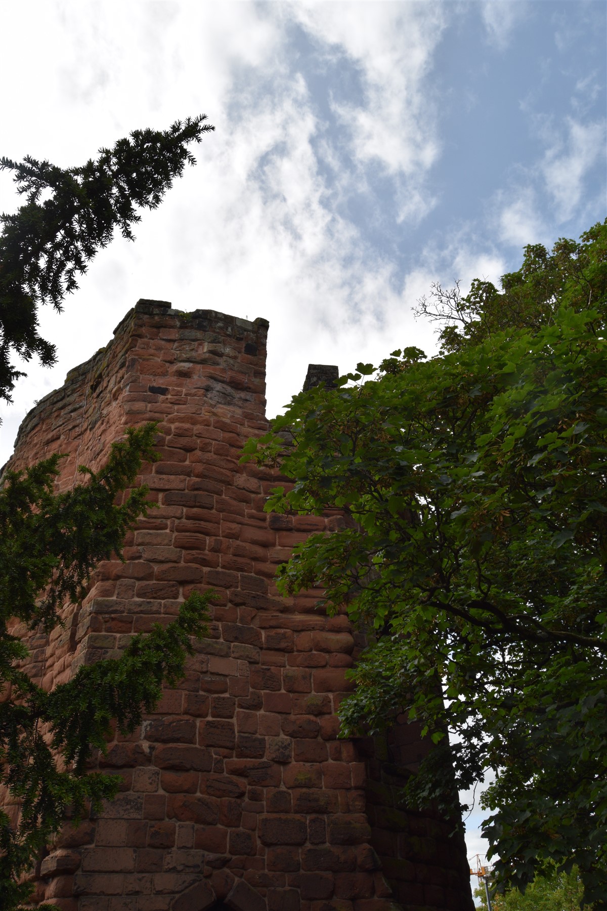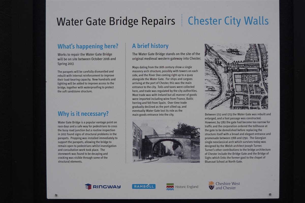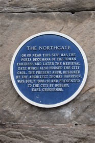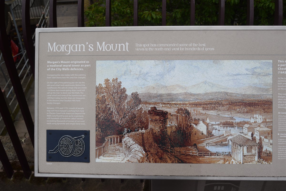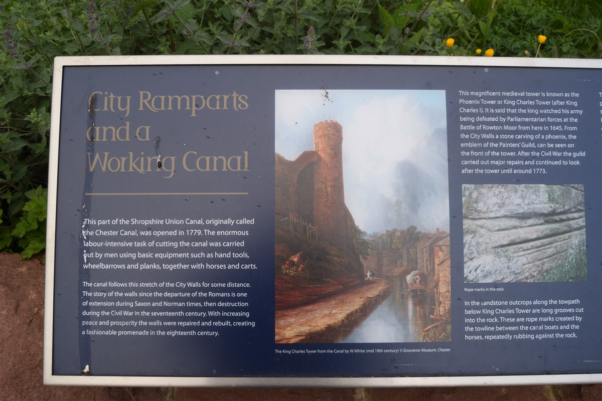 The present circuit of the City Walls is nearly two miles long and consists of four gates and several towers, all linked by a red sandstone wall. The north and east walls follow the original Roman foundations, which still remain in some cases, but the south and west walls were extended in the medieval period to include the castle to the south. The extension to the medieval walls must have taken place before 1121, as the Ship Gate is mentioned in the confirmation charter of St. Werburgh's Abbey. The present walls follow roughly the area of the medieval walled town, although most of the material above walk level is C18 or C19. The wall was probably originally defended by battlements to the outside, while the interior was protected by timber rails mounted on stone projections, which can still be seen at the Kaleyard gate. The north and east sides of the city wall were also protected by a ditch, which ran from Pemberton's parlour to just beyond the Newgate. Beyond this stretch, the slope of the ground was relied upon for protection. The repair and upkeep of the walls was a costly business, and was paid for by 'murage', a toll upon certain goods entering the city. The damage caused by the Civil War swept away much of the medieval work, and the walls were repaired during the reign of Queen Anne. In the C17 and C18 the ditches were filled in and the walls repaired, the medieval gates being replaced. The walls continued to be rebuilt and repaired so that the wall-walk could be maintained as a promenade. Most of the walls visible above ground level today are C18 or C19. (Cheshire HER)