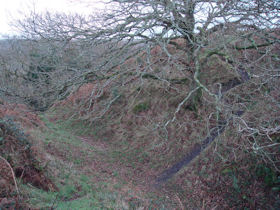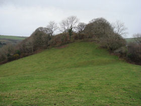 It is likely that the motte and bailey castle at Kilkhampton was built in between 1066 and the end of the 12th century AD. No documentation is available relating directly to the castle, so a more exact date is not possible. The site now exists as a series of earthworks, apart from some footings remaining on the motte. It is sited on top of an elongated knoll, from which the ground falls very steeply to deep valleys on the north and south, and is approached by a narrow neck of land from the east. The castle consists of a motte with two baileys: one of two known examples in Cornwall (the other being East Leigh Berries . The oval motte is situated at the western end of the castle. It is 18m in length east to west, and 8m from north to south. A V-shaped ditch below the motte separates it from the inner bailey. The inner bailey is rectangular and measures 30m east to west, and 25m north to south