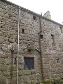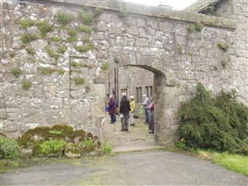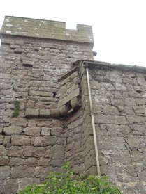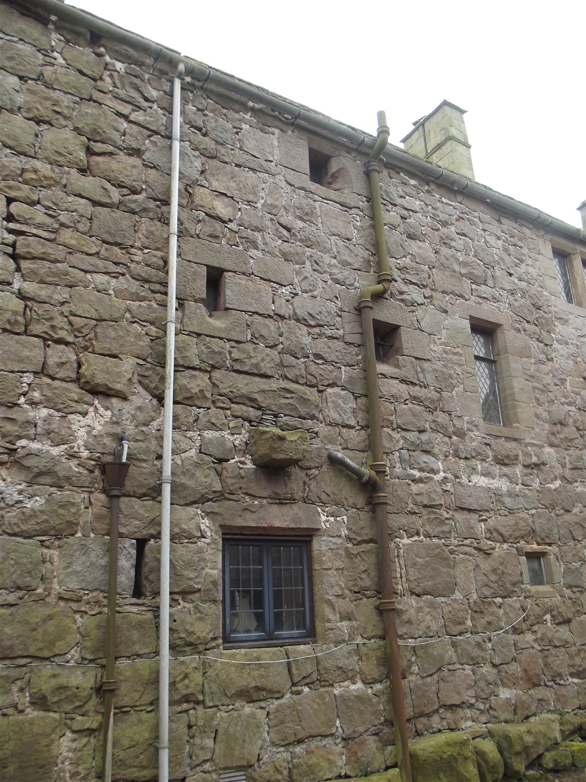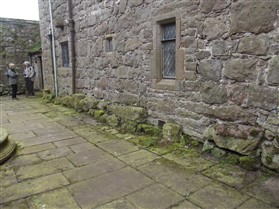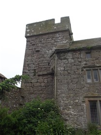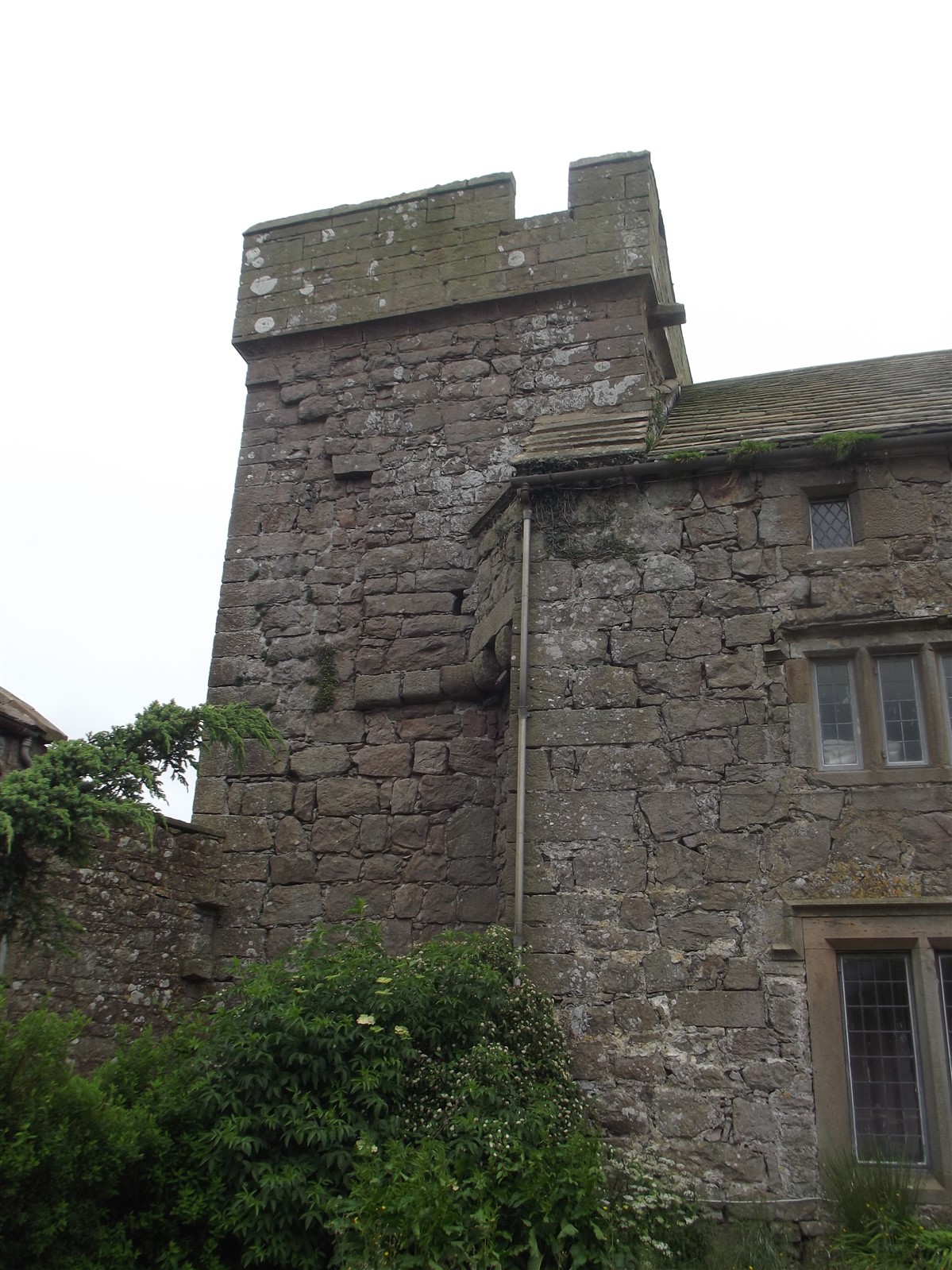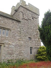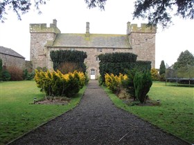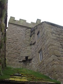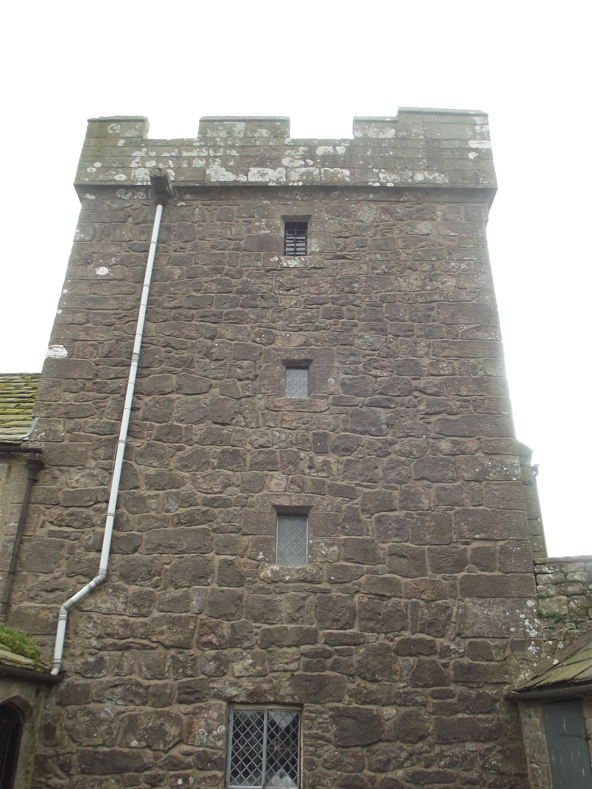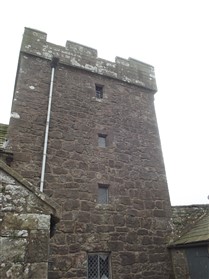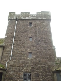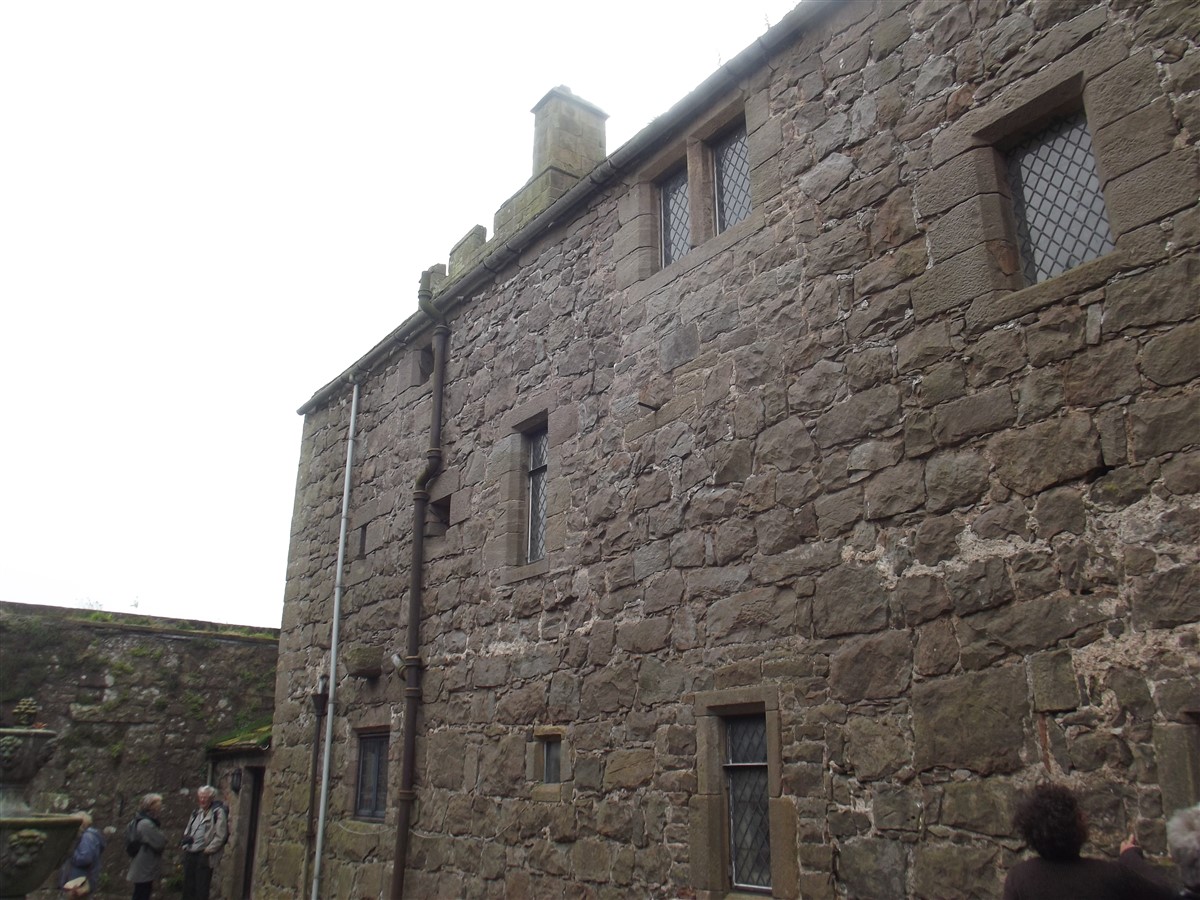 Early C14 with C15 alterations; late C15 and early C16 additions for Thomas, Lord Dacre, with further additions of late C16; C19 alterations by Anthony Salvin and 1922 alterations by Edmond Warre. Large blocks of calciferous sandstone rubble on projecting plinth stones; graduated sandstone slate roof, flat lead roofs on towers, ashlar chimney stacks. 3-storey, 4-bay, C14 former tower house (now gabled) with flanking 4-storey, single-bay late C15 or early C16 towers; early C16 curtain wall enclosing courtyard to rear, C16 hall and barrack block in L-shape within courtyard. Central block has C20 door in chamfered surround with C20 pointed arch. Ground floor 2-light chamfered mullioned windows with hood moulds are C19 replacements. 2 original C16 3-light chamfered mullioned windows above; a third similar window to right is C19. 2 small square attic windows flank 2 two-light mullioned windows of 1922. Rear wall has blocked courtyard entrance; small chamfered-surround windows on various levels, some with iron grilles. Interior has C15 roof timbers. Tower to right has C19 ground floor window, smaller original windows above. Top courses of stonework project irregularly and may be rebuilt. Projecting battlemented parapet to both towers. Tower to left is set back with garderobe in the angle. Corbelled-out firebreast at first floor level. Parapet has early C16 stone inscribed T.D. (Thomas Dacre). Interior has garderobe on each level; windows between the adjoining hall and tower suggest hall is of later date; floor levels altered in 1922. Curtain wall forms outer wall of adjoining hall and barrack block. Hall has ground floor stone-mullioned windows of 1922; upper floor chamfered-surround windows are probably C16. End wall has 3-light window with trefoil heads. Slit vents to left light garderobes