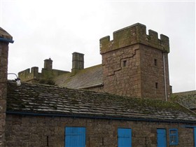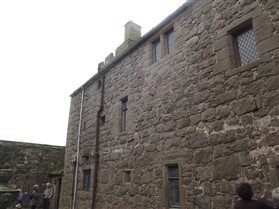 Interior has fireplace with inscription Thomas Carleton Junior 1576 (land serjeant); blocked door and stairs in thickness of end wall suggest a third tower and parapet walk around curtain wall; C16 roof timbers, tie-beams, kingposts with two-way braces and queenstruts. Barrack block has small C16 chamfered-surround windows on various levels, some with iron grilles and slit vents for garderobes. Wall to courtyard has 1922 windows, converted from later use as stables. Interior has 2 C16 fireplaces between modern floor levels. Curtain wall continues to enclose courtyard and has C19 rebuilt segmental arch. Blocked C16 window to left, suggests a porter's lodge with slight remains of steps to parapet walk. (Listed Building Report)