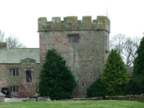 Fortified tower house, built circa 1460, to replace an earlier C12 tower house (see Catterlen Old Hall . In 1577 an Elizabethan wing was added to the south of the tower and in 1657 a Renaissance wing was added to the south end of the Elizabethan wing. The tower has thick pink sandstone block walls on projecting boulder plinth, with projecting battlemented parapets and stone water spouts. There is a flat roof which is not visible. The hall ranges have have similar, but thinner walls, under a graduated greenslate roof with large red sandstone chimney stacks. The tower is rectangular and of two storeys over a vaulted basement. (PastScape)