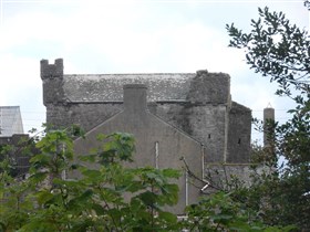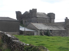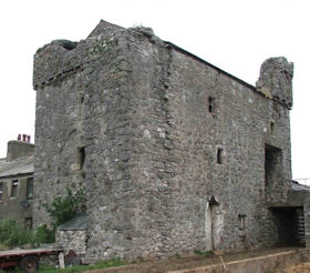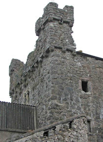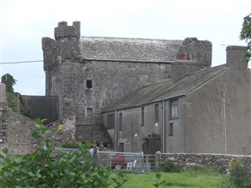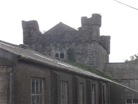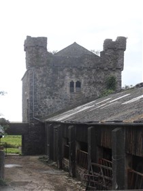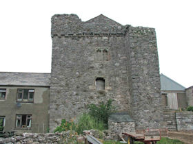 high has been made in the north end of the east wall at the first floor level, approached by a wooden bridge from the other farm buildings, and in many other ways the structure has suffered from its present use as a barn and stable. The roof is a modern one covered with blue slates, erected about 1870. The upper part of the walls is broken away except on the north side, where a portion of a corbelled parapet wall remains with a small square turret at each corner. The height of the tower to the corbel table is 30 ft. and the turrets rise about 7 ft. above this. The masonry of the garderobe tower is leaving that of the main building, a large crack showing from top to bottom, and the upper part of the tower has disappeared, but the corbel table remains on the east side and was probably continuous all round the building. The south-west corner, where the turret remains, is now completely covered up with a thick growth of ivy. There was formerly some coloured glass in the windows with the arms of Harrington, but it has all disappeared. Three diamond quarries, however, with the Stanley badge and crest of the eagle's claw and the eagle and child, and the initials possibly of Hugh Dicconson, are preserved in the adjoining farmhouse. (VCH)