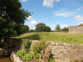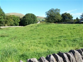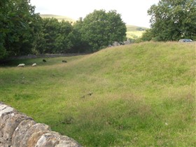 The earthwork remains of the medieval town defences of Castleton. The monument lies in two area towrads the outer limits of the town in the north west and south east corners. The construction of the bank and ditch are thought to have been connected with the foundation of the borough in 1196 after Henry II acquired Peveril Castle from the original owners, the Peverels. The monument survives as a linear earthwork which includes a bank and outer ditch. The bank is approximately 12 metres wide and the ditch is of a similar width. The section to the south east of the town measures 200 metres in length and runs east to west for 100 metres before turning to the north and running in this direction for a further 100 metres. The section to the north west of the town measures 105 metres in length and is aligned north to south but curves to the east at its northern end. This section of the monument is more clearly defined with the bank sloping down steeply to the west and north. A mill stream now occupies this section of the town ditch. The town was totally enclosed within the earthwork defences but elsewhere these have been levelled, infilled and encroached on by later development. Nevertheless, the original line of the town defences can still be traced from the surviving remains on the north west side to those on the south east side of the town. The mill stream marks the line of the ditch on the northern side of the town and the curve in Mill Lane follows the line around the north east corner. (PastScape)
