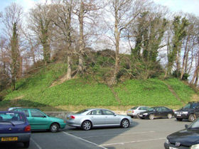 Castle, at the W end of the town, between the rivers Taw and Yeo. Motte and bailey, the very large motte towards the town. The bailey, now occupied by Castle Green, is bounded by land reclaimed from the estuary in modern times. A second bailey on the town side, suggested from documentary references, has never been proven. Excavations in the 1920's showed that the defensive ditches received water direct from the estuary. On top of the motte, foundations of a circular stone tower, 65ft in diameter with walls 10ft thick, surrounded by an outer wall of lighter build. The castle existed by the early C12th, when it was associated with Judhael, formerly of Totnes created Lord of Barnstaple by Henry I. In 1136, Alfred, son of Judhael, abandoned it because it was weak. The walls may date from the time of Henry de Tracey, who was granted the castle by King Stephen. In 1228 the defensive walls were reduced to a height of 10ft on royal orders; but a hall, chamber, kitchen, and other buildings were mentioned in 1274, a chapel in 1333. The castle was in some disrepair by 1326, and in ruins by Leland's day.(PastScape–ref. Pevsner, 1989)