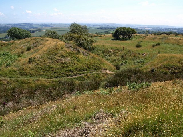 The earthwork remains of a medieval ringwork and bailey castle situated within the north western part of Blackdown Rings prehistoric hillfort (SX 75 SW 4). The ringwork, which occupies the highest ground available within the hillfort, is represented by a substantial penannular earthen bank surrounded by a ditch. The bank is about 35 metres in external diameter at the base, flat topped, and with sides that slope steeply both externally and internally to form a rampart up to 4 metres in height on its highest, northern, side. The bank would have originally supported a wooden palisade. The interior of the ringwork consists of a relatively small level area of some 7 metres in diameter, and is offset to the south east of the centre of the ringwork towards a narrow entrance through the bank. The bailey lies adjacent to the south east of the ringwork and occupies a level area of 0.2 hectares, measuring about 53 metres by 20 metres, enclosed by an earthwork rampart with an external ditch and counterscarp bank. The rampart consists of a steep-sided bank up to 8 metres wide and 2 metres in height. On its northern side the bailey rampart overlies the hillfort rampart and at this point is at its highest. The external face of the rampart slopes directly into a steep-sided ditch, about 6 metres wide and 1.2 metres to 2 metres deep. On the outer edge of the ditch there is a low counterscarp bank of about 4 metres width, which is up to 0.6 metres high were the bailey rampart joins the hillfort rampart. (PastScape)