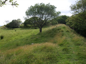 The hillfort is sited to the south of the hillcrest so that to the north its defences face onto slightly rising ground, to the east and west onto level ground, and overlooks the ground to the south. It occupies a roughly oval area of approximately 2.4ha, enclosed by an earthwork in the form of a rampart with an external ditch and a counterscarp bank. Material for the rampart and counterscarp was originally quarried from the ditch. The rampart is about 6m in width and between 1.2m and 1.7m in height above the internal ground surface. It has a gradual inner slope, flat top, and a near vertical outer face. Between the rampart and ditch there is a berm, consisting of a level area of up to 2m width, although in places it is absent and the face of the rampart is continuous with the inner side of the ditch. The ditch is about 8m wide and 2m deep with steep sides and a flat bottom, which in places is uneven, particularly on the north side of the hillfort, where it contains a number of large shallow hollows. On the outer edge of the ditch there is a counterscarp bank which is about 6m in width and 0.3m high. On the north side of the hillfort it is obscured by the road, and on the south side it is overlain by a substantial field bank. There are two original entrances into the enclosure, opposed in the east and west sides, each consisting of a causeway across the ditch and a gap in the rampart of about 8m width. The ends of the ramparts are curved inwards slightly, sloping down to end at low earth mounds. At the east entrance the causeway is offset slightly to the north of the gap in the rampart, and the counterscarp to the north of the entrance becomes a large curving bank, about 30m long by up to 9m wide, and 1.5m high at its northern end. In the north western part of the hillfort defences are the earthwork remains of a medieval castle, taking the form of a ringwork and bailey. The ringwork, which occupies the highest ground available within the hillfort, is represented by a substantial penannular earthen bank surrouded by a ditch. The bank is about 35m in external diameter at base (natural ground level), flat topped, and with sides that slope steeply both externally and internally to form a rampart up to 4m in height on its highest, northern, side. The bank would have originally supported a wooden palisade. The interior of the ringwork consists of a relatively small level area of some 7m diameter, and is offset to the south east of the centre of the ringwork towards a narrow entrance through the bank. At this point the bank is at its lowest at about 2m in height. The interior slope of the bank is very uneven, having been cut into several large scoops and gulleys. The outer face of the bank slopes directly into the encircling 'V' shaped ditch which is up to 7m wide and 2m deep. In its north west quadrant the ditch is contiguous with the ditch of the hillfort. There is a low causeway across the ditch opposite the entrance through the bank, and the southern quadrant of the ditch is subject to seasonal waterlogging. The bailey lies adjacent to the south east of the ringwork and occupies a level area of approximately 0.2ha, measuring about 53m by 20m, enclosed by an earthwork rampart with an external ditch and counterscarp bank. The rampart consists of a steep-sided bank up to 8m wide and 2m in height. On its northern side the bailey rampart overlies the hillfort rampart and at this point is at its highest. The external face of the rampart slopes directly into a steep- sided ditch, about 6m wide and 1.2m-2m deep. Material for the rampart was quarried from this ditch which interconnects with the ditches of the ringwork and hillfort. On the outer edge of the ditch there is a low counterscarp bank of about 4m width, which is up to 0.6m high where the bailey rampart joins the hillfort rampart. The south east facing aspect of the rampart has two narrow gaps at a point where the rampart is at its lowest, and the northern gap has been interpreted as the site of the original entrance into the bailey. There is an area of raised ground in the ditch opposite the entrance which may represent a causeway. Adjacent to the bailey are the slight earthwork remains of later field boundaries. On the highest part of the ringwork there is a slightly wider area of level ground, about 4.5m by 3.5m in size. This is the site of a beacon shown on a plan of the earthwork dated to 1752. It is considered to have been a Pole Beacon consisting of an upright timber post set into the ground and braced with a timber framework, to support one or more iron cages holding the combustible material, probably gorse and pitch. Access to the cage or cages would have been by a permanent ladder. (Scheduling Report)