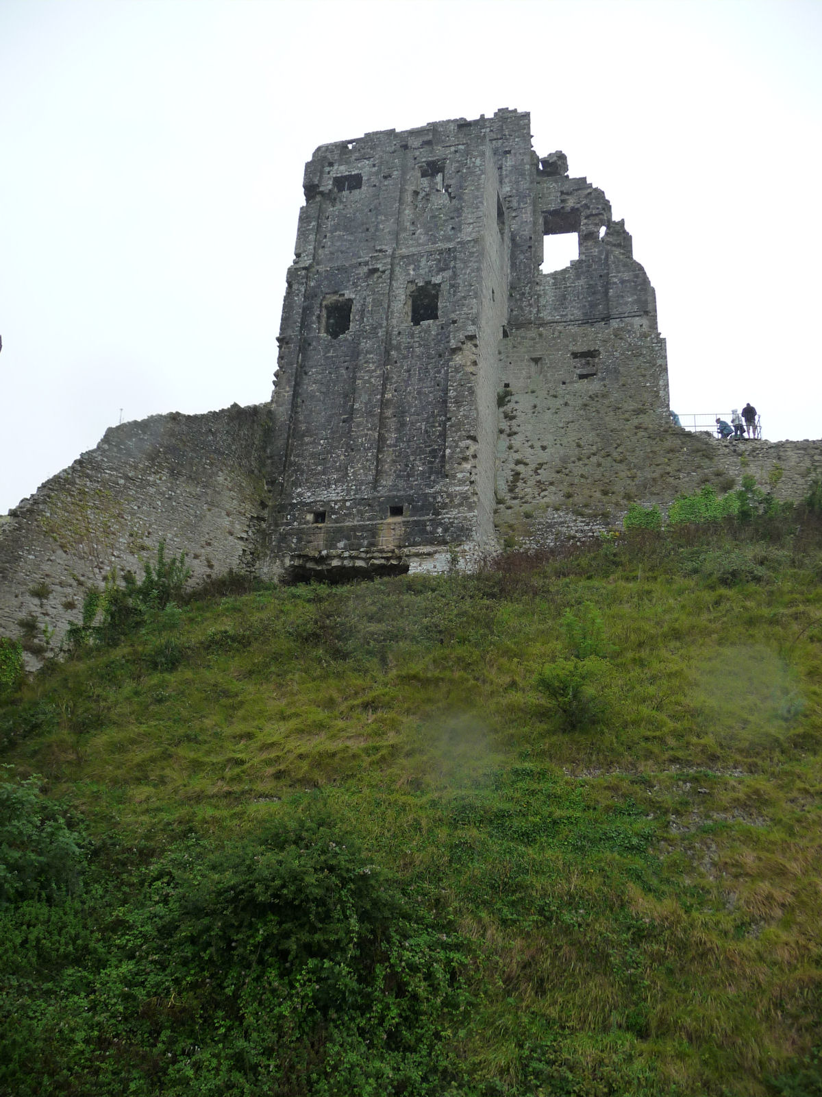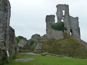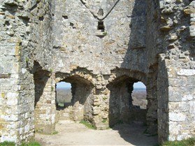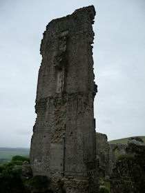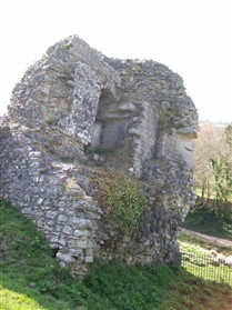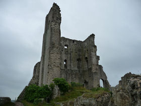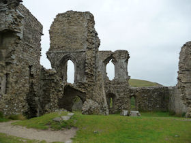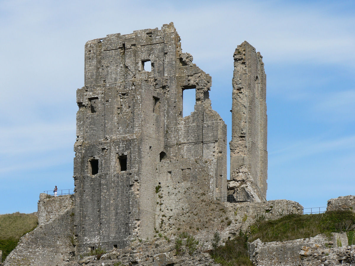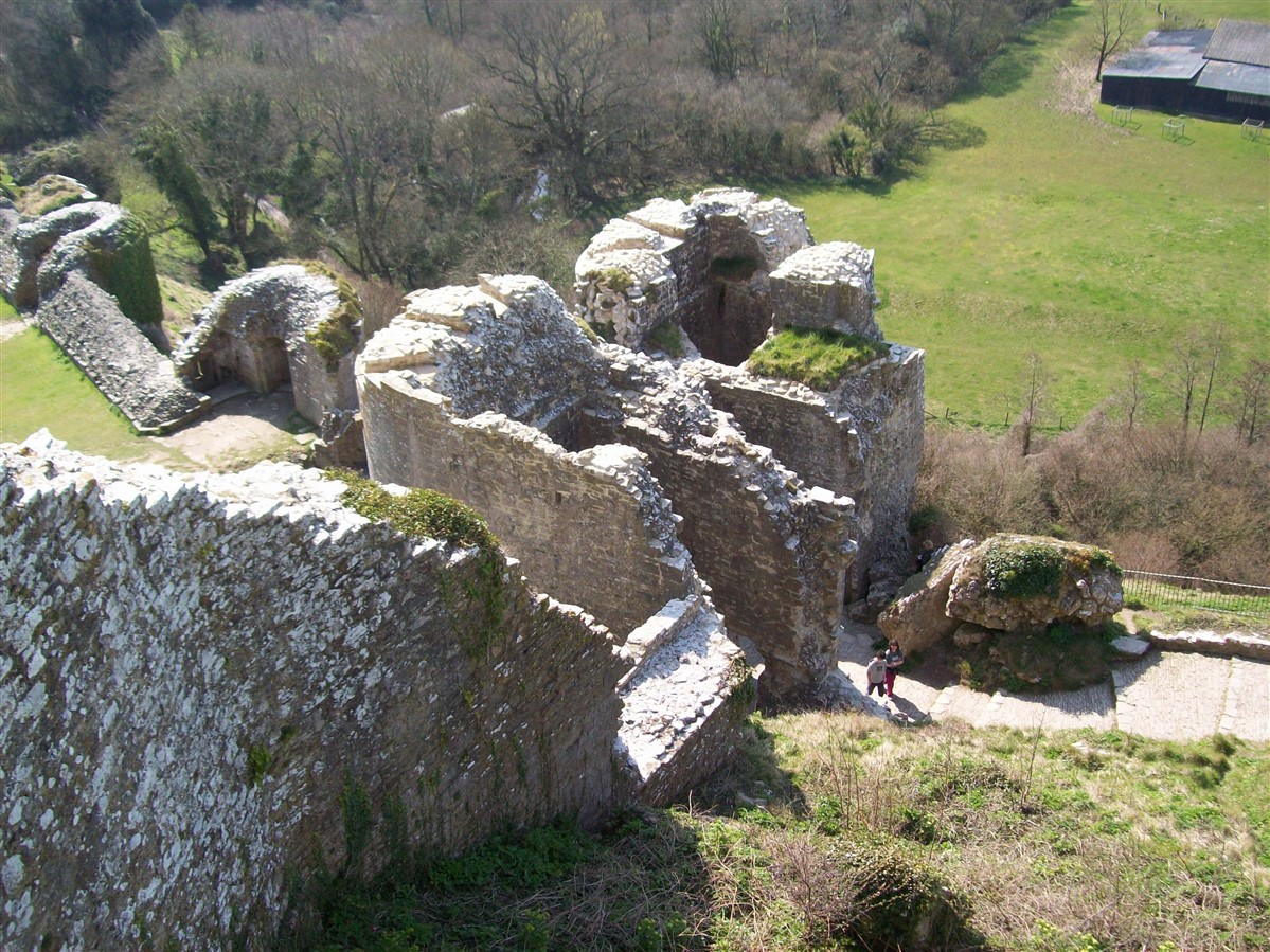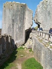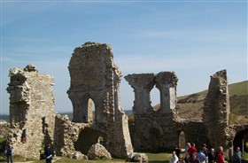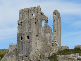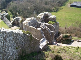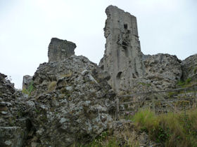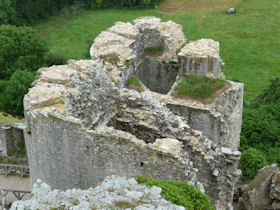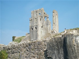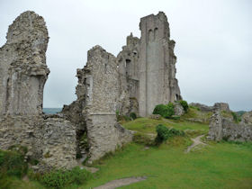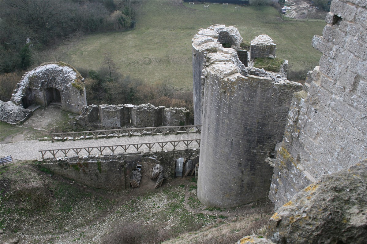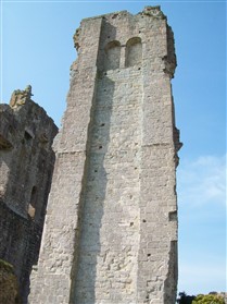 At north-west of the site, the remains of the Old Hall, late C11. Lower walls of this survive, with some herringbone masonry and part blocked round arched openings. At west end, remains of the Butavant Tower, early C13. Near the centre, the Keep, C12, square on plan, originally 3-storeyed - an extra storey inserted in C13. Altered in mid-C16 by Sir Christopher Hatton, - remains of Tudor windows and fireplaces survive. North of the Keep, large blocks of fallen masonry. West of the Keep, the Gloriette, a C13 first-floor hall house, with Hall and Solar over an originally vaulted undercroft. Several lancet windows survive, with deep roll mouldings. In spite of much destruction, still an impressive structure, dominating the village (listing description). Corfe was a major royal castle, not necessarily for its strategic value, but more for its convenience as a stronghold for the safe custody of political prisoners, important hostages and royal treasure (HKW). (PastScape)