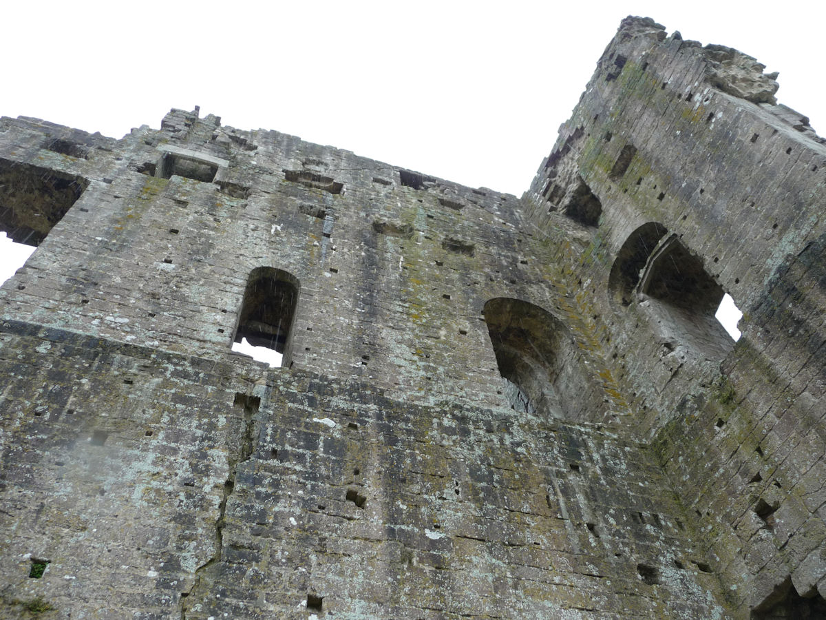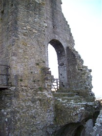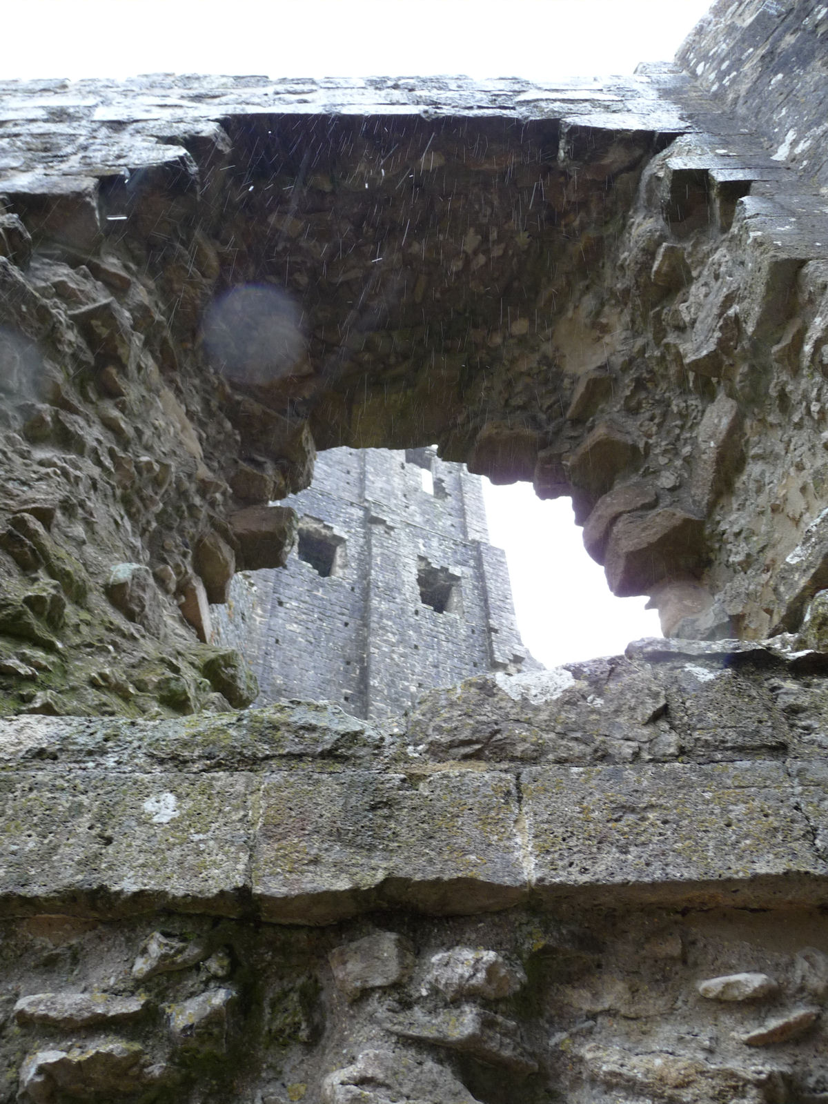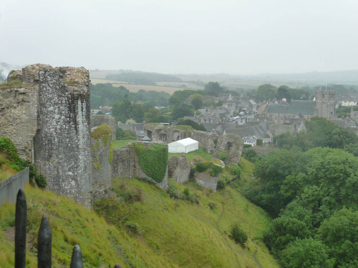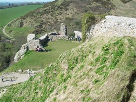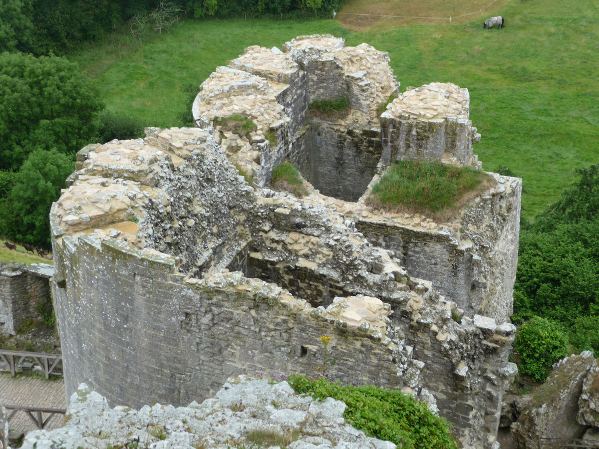 At north-west of the site, the remains of the Old Hall, late C11. Lower walls of this survive, with some herringbone masonry and part blocked round arched openings. At west end, remains of the Butavant Tower, early C13. Near the centre, the Keep, C12, square on plan, originally 3-storeyed - an extra storey inserted in C13. Altered in mid-C16 by Sir Christopher Hatton, - remains of Tudor windows and fireplaces survive. North of the Keep, large blocks of fallen masonry. West of the Keep, the Gloriette, a C13 first-floor hall house, with Hall and Solar over an originally vaulted undercroft. Several lancet windows survive, with deep roll mouldings. In spite of much destruction, still an impressive structure, dominating the village (listing description). Corfe was a major royal castle, not necessarily for its strategic value, but more for its convenience as a stronghold for the safe custody of political prisoners, important hostages and royal treasure (HKW). (PastScape)