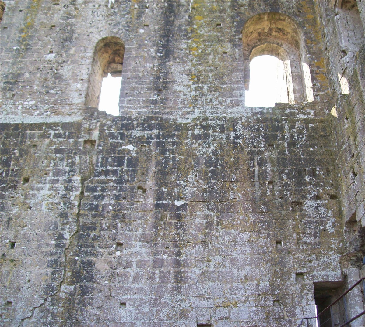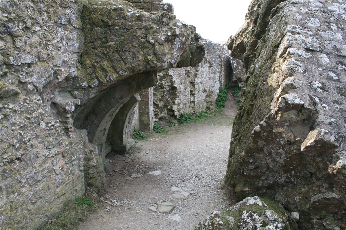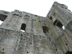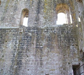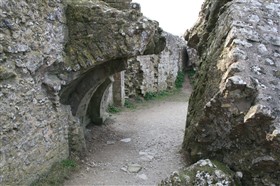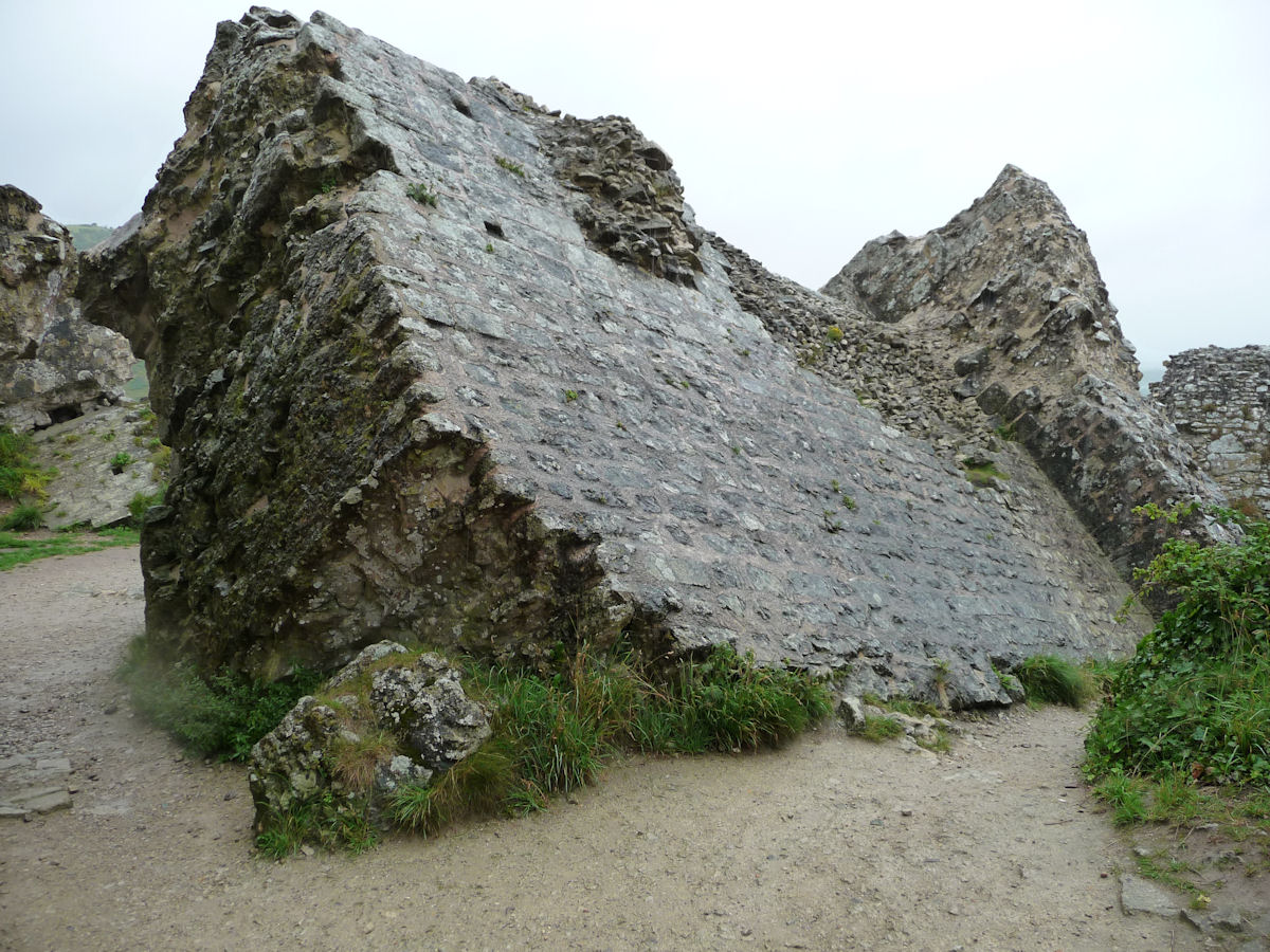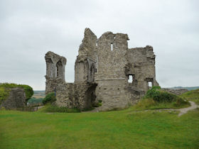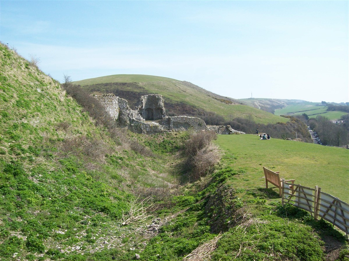 At north-west of the site, the remains of the Old Hall, late C11. Lower walls of this survive, with some herringbone masonry and part blocked round arched openings. At west end, remains of the Butavant Tower, early C13. Near the centre, the Keep, C12, square on plan, originally 3-storeyed - an extra storey inserted in C13. Altered in mid-C16 by Sir Christopher Hatton, - remains of Tudor windows and fireplaces survive. North of the Keep, large blocks of fallen masonry. West of the Keep, the Gloriette, a C13 first-floor hall house, with Hall and Solar over an originally vaulted undercroft. Several lancet windows survive, with deep roll mouldings. In spite of much destruction, still an impressive structure, dominating the village (listing description). Corfe was a major royal castle, not necessarily for its strategic value, but more for its convenience as a stronghold for the safe custody of political prisoners, important hostages and royal treasure (HKW). (PastScape)