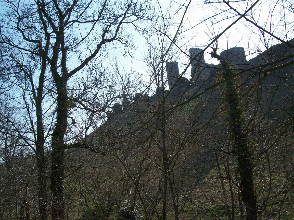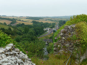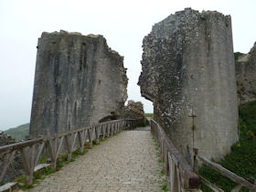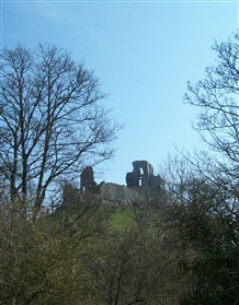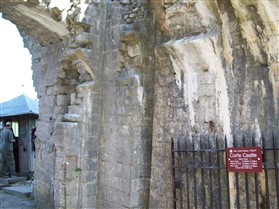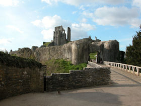 Corfe Castle. Ruins of former royal castle, built on a natural hilltop in a gap in the main Purbeck range. Late C11 origin - possibly on an earlier pre-Conquest site, altered and enlarged in C12, C13 and C14. The Keep refurbished as a house in mid-C16 and the whole structure slighted and largely demolished after the Civil War. The fortified enclosure roughly triangular in plan. The curtain walls survive in part, with the bases of semi-circular towers. Surviving walls part ashlar, part rough ashlar, part rubble. Outer Gatehouse, at south end, approached by a 4-arch stone bridge over the now dry moat. Gatehouse consists of a segmental archway flanked by bases of 2 circular towers, linked to curtain wall. Inner, south-west Gatehouse, south of the surviving structures, consists of 2 circular towers flanking a pointed segmental archway. On the left, this has dropped several feet following undermining after the Civil War
