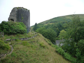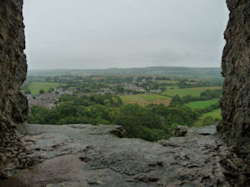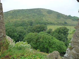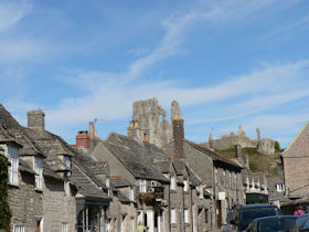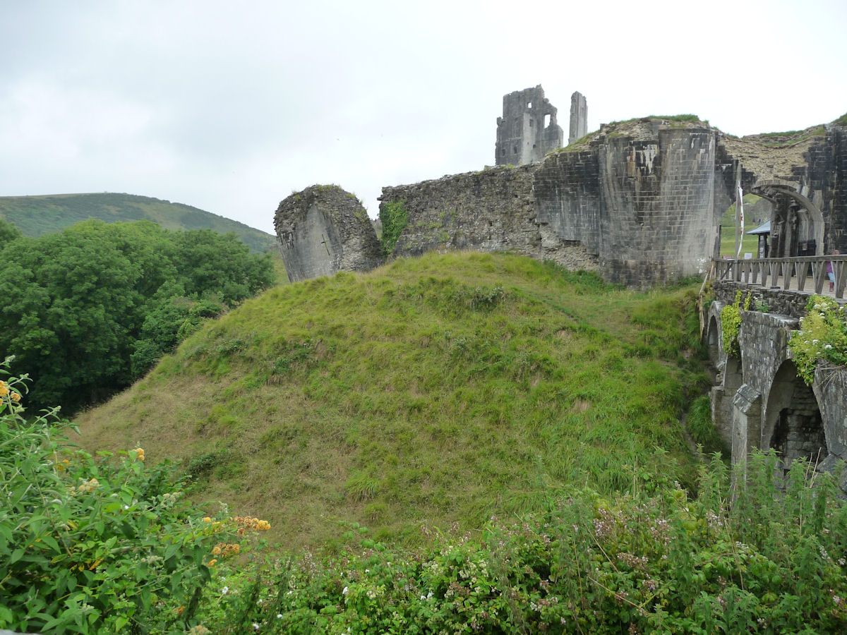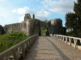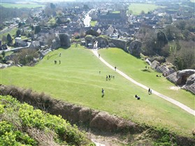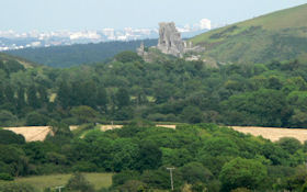 The monument includes a large enclosure castle built on a natural mound overlooking a gap in the Purbeck Hills and situated immediately north of the town of Corfe. The castle is separated from the town by a deep ditch cut across a narrow natural tongue of land. The castle is built of Purbeck stone, ashlar and rubble, generally with flint in the core. It has an inner ward, west bailey and outer bailey. The inner ward, on the summit of the hill, belongs to the original phase of the castle and is defined by a late 11th century curtain wall. This encloses a pear shaped area containing the remains of the keep, a range of buildings known as the 'Gloriette' with traces of an intervening kitchen range, and other buildings. The ashlar built keep is dated to c.1105. The 'Gloriette' is an early 13th century courtyard mansion with 15th century additions, which was built to supplement or replace accommodation in the keep. The west bailey occupies a relatively level, triangular spur of the hill, below and to the west of the inner ward. The curtain wall, along the north and south sides of the west bailey, and the three towers which comprise its defences, were part of the defensive works of King John in the early years of the 13th century. Within the west bailey are late 11th century fragments of a hall. These, together with the wall surrounding the inner ward are the earliest visible features of the castle. The outer bailey, to the south east of the west bailey, lies on land which is nearly flat from west to east but rising to the north. This area retains a defensive system of walls and mural towers mainly of early and late 13th century date. There are four towers on the eastern curtain wall and two on the west. Within the outer bailey is the south west gatehouse, the great ditch and the outer gatehouse. The south west gatehouse guards the narrow approach to the west bailey. The great ditch, quarried in 1207, removed the south wall of the presumed south west bailey. The outer gatehouse gives access from the outer bailey to the bridge which spans the ditch between castle and town. The bridge has four spans of uneven width with plain semi-circular arches, the oldest part of which dates to the 12th or early 13th century. The foundations of a suggested pre-Conquest building were revealed during excavations in the west bailey in 1950-52. These are thought to represent either a 'hospitium' belonging to Shaftesbury Abbey, a royal residence associated with King Edward, who was murdered at 'Corfegeat' in AD978 or the 'domus' of Queen Elfrida. During excavation a single sherd of Romano-British pottery was found near to the spot where a sherd of the same period was previously discovered. Documentary sources provide additional evidence for the construction and development of Corfe Castle. For example, in the Domesday record there is a reference to the building of a castle at Wareham, although it is generally accepted that this was an error, and that the castle was, in fact, Corfe. The enclosure wall of the inner ward and the 'Old Hall' in the west bailey can be attributed to the reign of William I. In the reign of Henry I Corfe is mentioned as being the place of imprisonment of Robert Duke of Normandy, by which time the keep had been built as a secure place of imprisonment. During the civil wars between Stephen and Matilda there was military activity at Corfe in 1138 and 1139. The siegeworks known as 'the Rings', to the west of the castle were built by Stephen's forces as part of this attack. The reigns of Henry II and Richard I were periods of minimal activity and repair, while King John's reign ushered in intensive building operations and the castle saw a great deal of use as a treasury, prison and royal residence. Work during Edward I's reign included the completion of the outer bailey defences. The castle then fell into disrepair until Edward III commissioned a survey, and extensive repairs were carried out between 1356 and 1377. Following that no further major works were undertaken until 1496 when Henry VII prepared the castle as a residence for his mother Margaret, Countess of Richmond. In 1572 Corfe Castle passed out of the hands of the Crown and the following steward Ralph Treswell carried out surveys, the plans of which survive. Eventually the estate was sold in 1635 to Sir John Bankes. Corfe Castle again saw military activity during the English Civil War. In May 1643 Parliamentary forces failed to take the castle by suprise, and by June the castle was under siege. This first siege lasted for 6 weeks. By October 1645 Corfe was under siege once again until finally, in February 1646, the castle was taken by treachery and subterfuge. In March 1646 a vote was passed by the Commons for its demolition. This delibarate slighting was caused by explosions which scattered fabric to the slopes around the castle and into the valley bottom. Following this, the castle was retained by the Bankes Estate as a romantic ruin, a state which has been maintained in recent years by the National Trust. Immediately at the western end of the hill on which Corfe Castle is situated, is the 18th century Vineyard Bridge. This is a single arched stone structure of coursed Purbeck stone rubble with ashlar dressings. The close proximity of this to a castle deliberately slighted at the time of the Civil War, makes it likely that the bridge will incorporate earlier medieval fabric in its construction. (Scheduling Report)