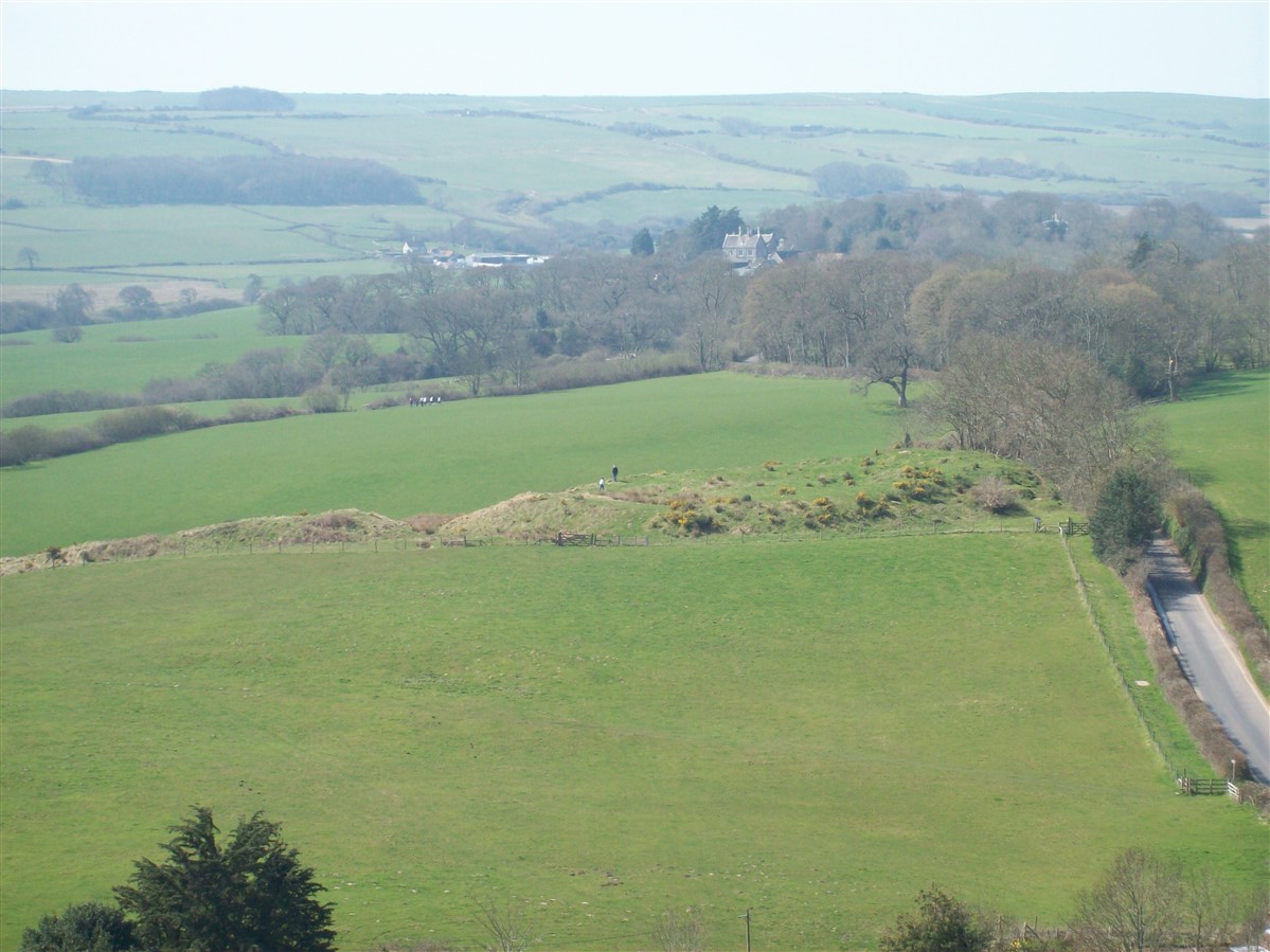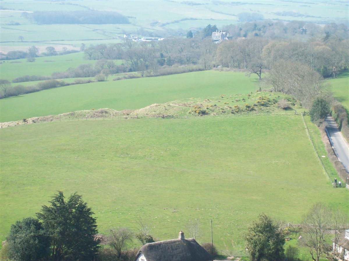 The Rings earthwork remains of a 'ring-and-bailey' castle, lie some 320 yards SSW of the nearest point of Corfe castle. Their position commanding the town, the castle and a main approach route supports the view that they are remains of a siege castle thrown up by King Stephen in 1139 when he unsuccessfully besieged Corfe. They stand apart from the town and were apparently never integral with it. Traditionally a battery was sited here in the 17th century Civil War (Dorset Procs. XLVIII (1927),xlix), and the Tithe Map (1844) calls the 'Rings' 'Cromwell's Battery'. A rampart-walk inside the bank could belong to this phase (cf. the ramps, though different in form, inside Maumbury Rings. The earthwork is set at the E end of a low chalk ridge running parallel to the much higher West Hill to the N and sloping S; the ground falls away from it on all sides but the NW., giving an excellent field of view, particularly from the 'ring'. This last, alternative to a motte, consists of a massive rampart still up to 13ft. high above the bottom of the surrounding ditch with a platform just inside it; the platform, up to 10ft wide and about 2 1/2ft below the crest, is best preserved on the SW and gives the impression of a rampart-walk. The rest of the interior, about 40 yards across and 1/4 acre in area, slopes gently SE. Two gaps occur in the rampart: that to the E. is modern, while the other, to the S., which is very narrow and cuts the bank diagonally, seems unlikely to be original. The bank and ditch of the bailey seem to have been of similar proportions to those of the 'ring', but the interior, of about 1/2 acre, slopes more steeply and to the S as if deliberately tilted away from Corfe castle. The 'ring' is covered with bent grass, bramble and bracken; the present road runs virtually in the ditch on the NW and has encroached on the rampart which, with the rampart-walk, has been eroded on the N.E