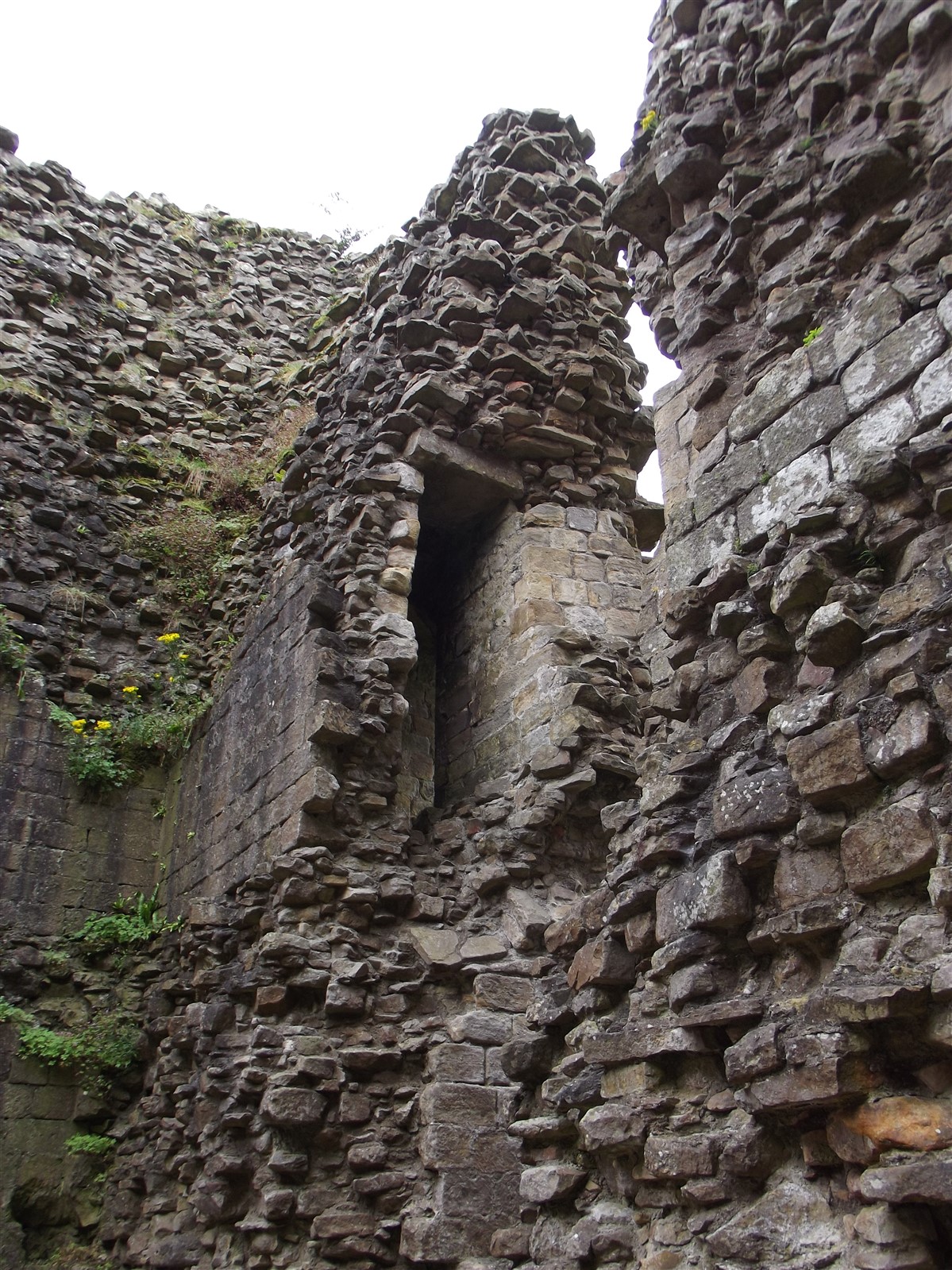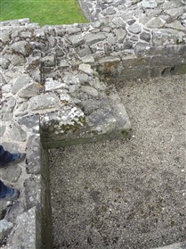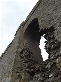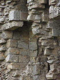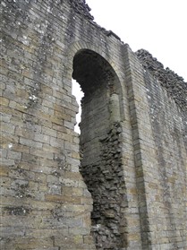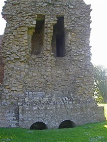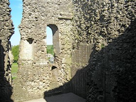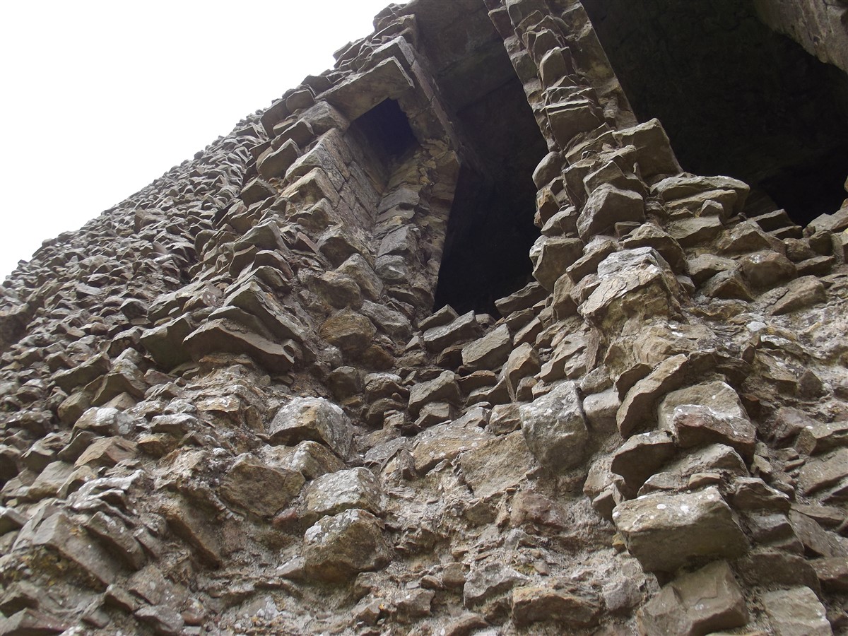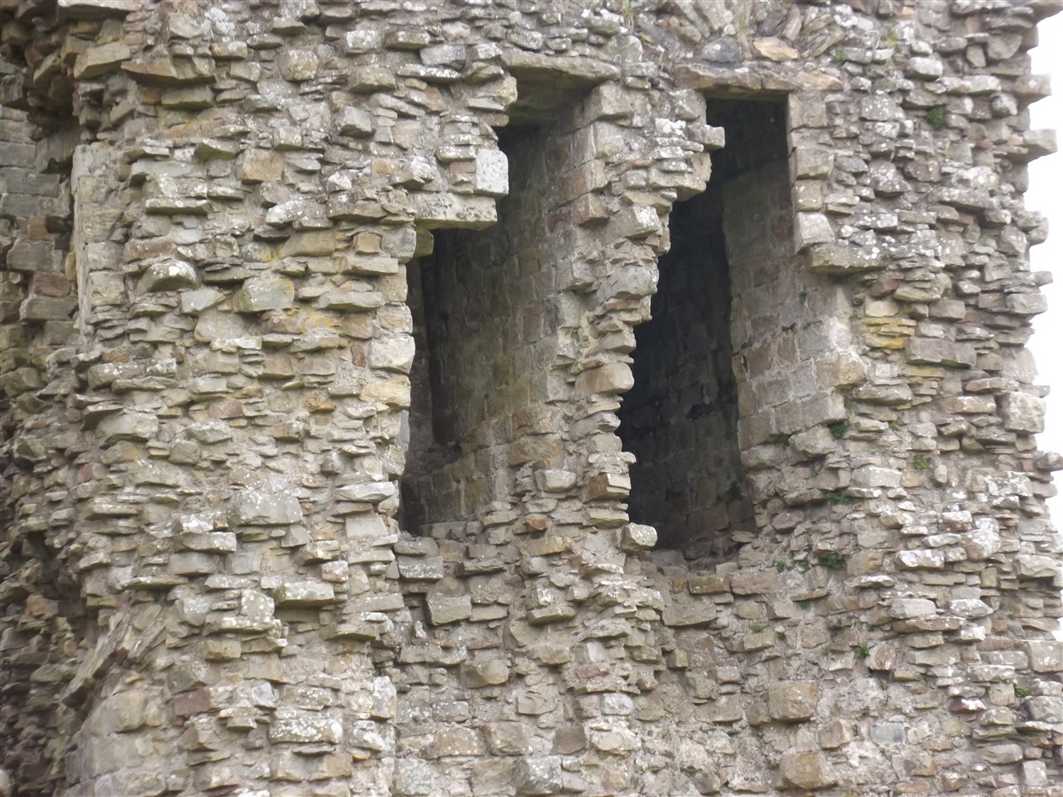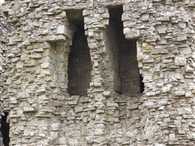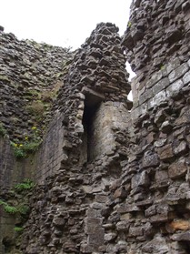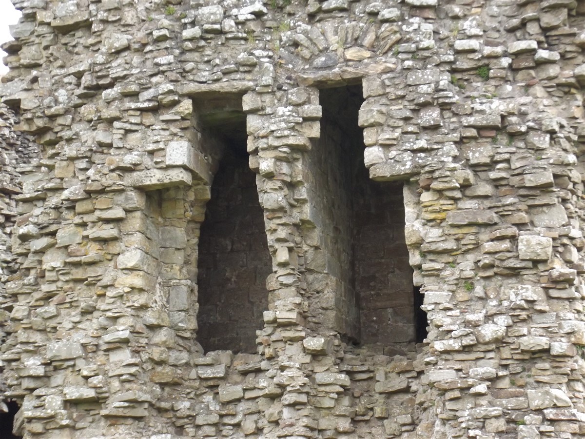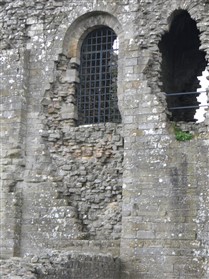 East front: remains of forebuilding with triple-chamfered plinth to north; first-floor round-arched north doorway has set-back voussoirs and is flanked by small round-arched openings. South-east corner has slits and contains partly- reconstructed spiral stair. South front: first-floor round-arched hall window of 2 orders (inner order chamfered)to east; several round-headed loops to west. Badly-damaged west front: exposed mural passages and a first-floor garderobe chute to south; projecting section at foot of chute has 2 round-arched openings; fragmentary large windows to north. North front: large round-headed first-floor window with set-back rounded jambs. Interior: ground-floor has several springers for destroyed rib vaults; north-east corner contained first-floor kitchen with fireplace and a simple flue leading out through north wall. (Listed Building Report)