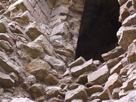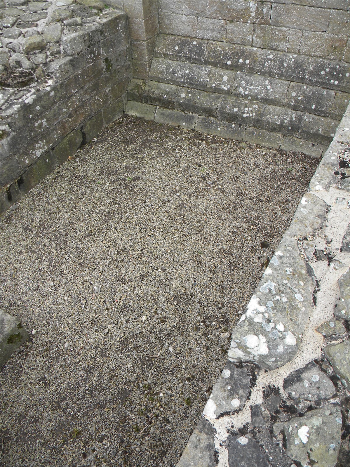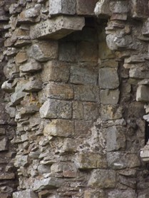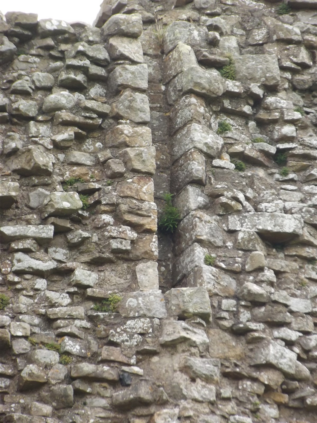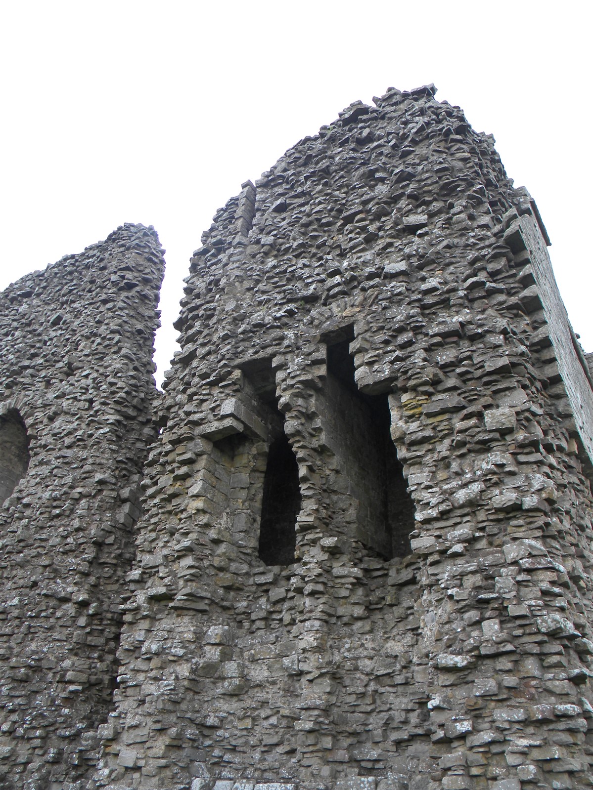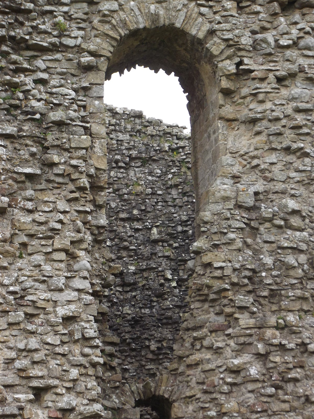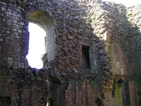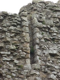 East front: remains of forebuilding with triple-chamfered plinth to north; first-floor round-arched north doorway has set-back voussoirs and is flanked by small round-arched openings. South-east corner has slits and contains partly- reconstructed spiral stair. South front: first-floor round-arched hall window of 2 orders (inner order chamfered)to east; several round-headed loops to west. Badly-damaged west front: exposed mural passages and a first-floor garderobe chute to south; projecting section at foot of chute has 2 round-arched openings; fragmentary large windows to north. North front: large round-headed first-floor window with set-back rounded jambs. Interior: ground-floor has several springers for destroyed rib vaults; north-east corner contained first-floor kitchen with fireplace and a simple flue leading out through north wall. (Listed Building Report)