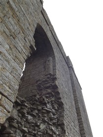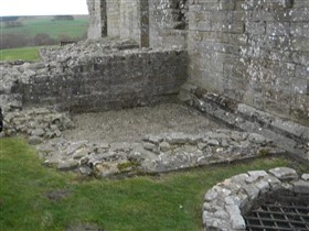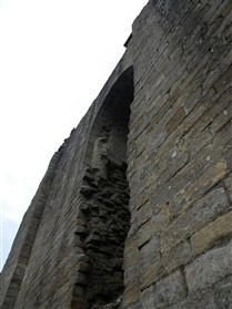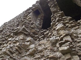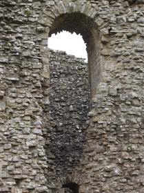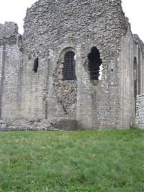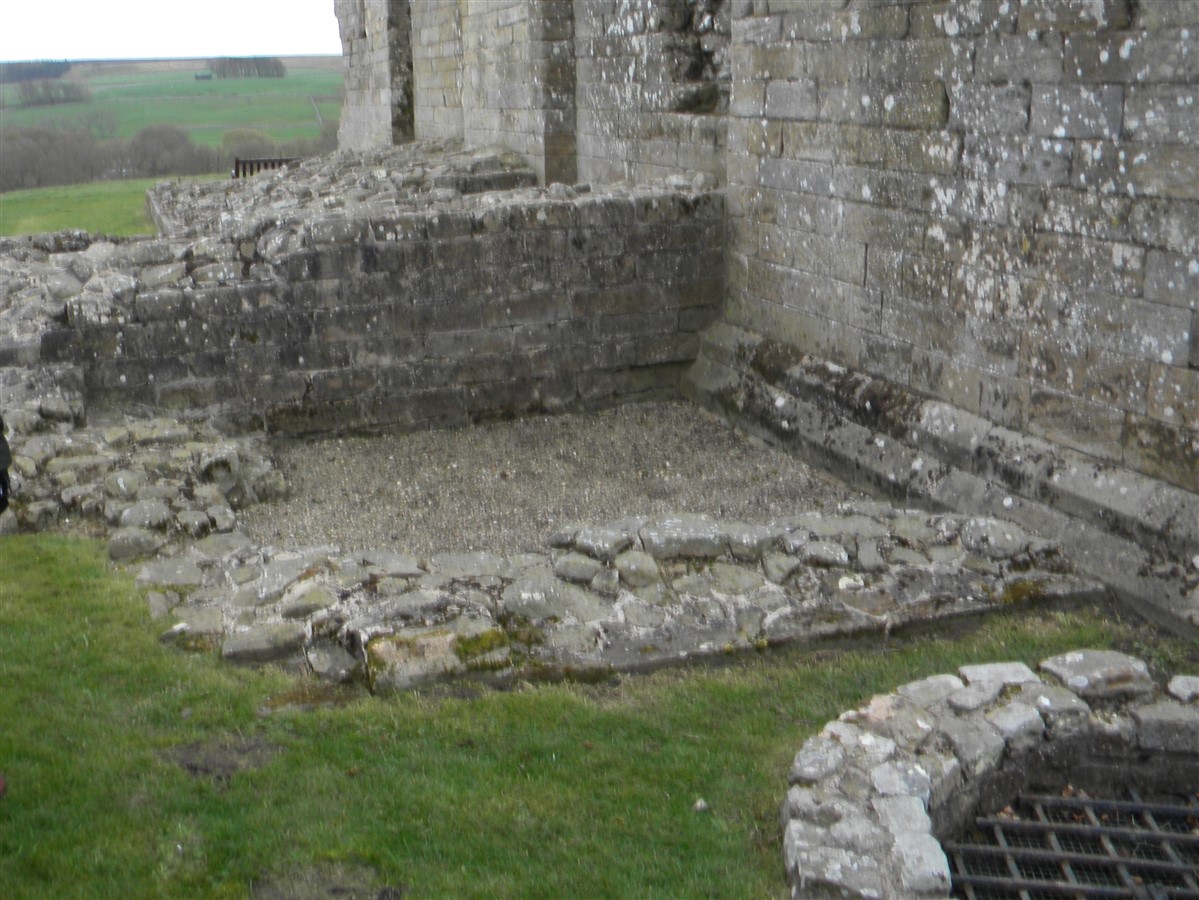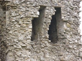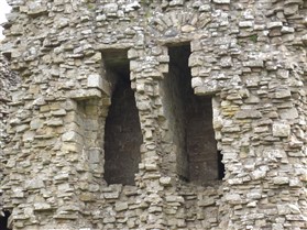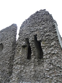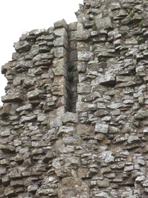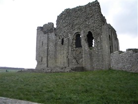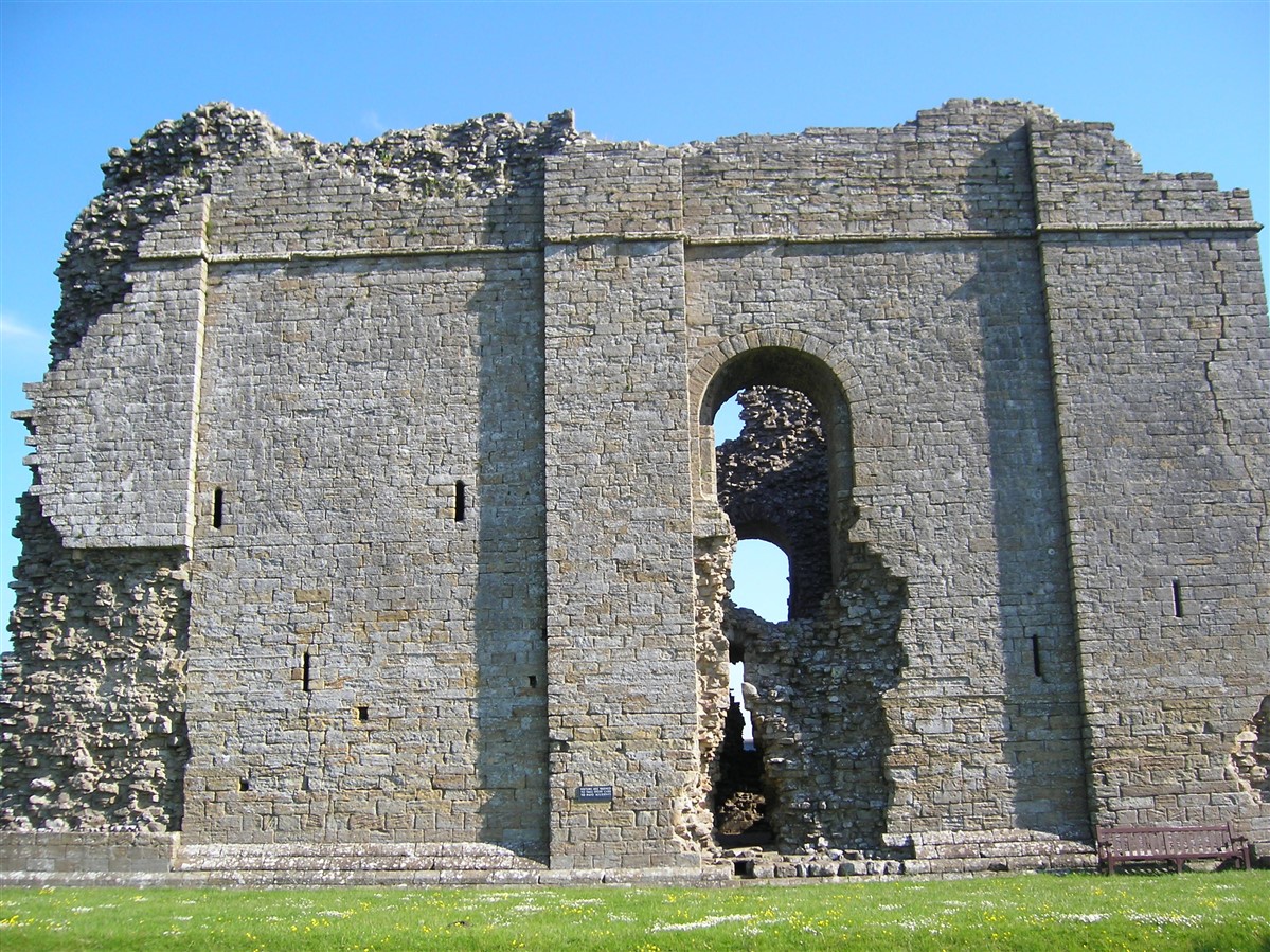 Keep with foundations of forebuilding to east. Circa 1171-87 by Richard the engineer for King Henry II. Sandstone rubble core faced with ashlar and incorporating some Roman masonry. Square plan. 2 storeys standing and ruinous third storey. Double-chamfered plinth. Each face has projecting corners and a broad flat central buttress with set-back wall panels between. Fragmentary roll-moulded band above first floor
