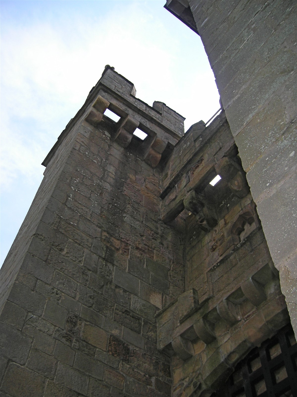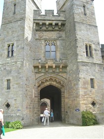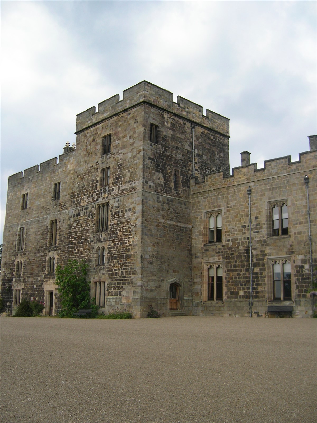 North elevation on left return has heavily machicolated curtain wall linking Clifford's and Kitchen towers, with wide low-2-centred arch inserted. South elevation on right return has 2-storey 4-bay range with paired lights linking Joan's Tower with Octagon, Burn's 1845 construction replacing Carr's incomplete round tower, on site of medieval south tower destroyed by fire mid C18. Burn's high 5-light transomed window in dining room to right of Octagon, and ante- library extruded addition to left; and at east end the 5-stage tapered Bulmer's Tower with left stair-turret, which has shouldered head to ground-floor entrance, and varied fenestration.