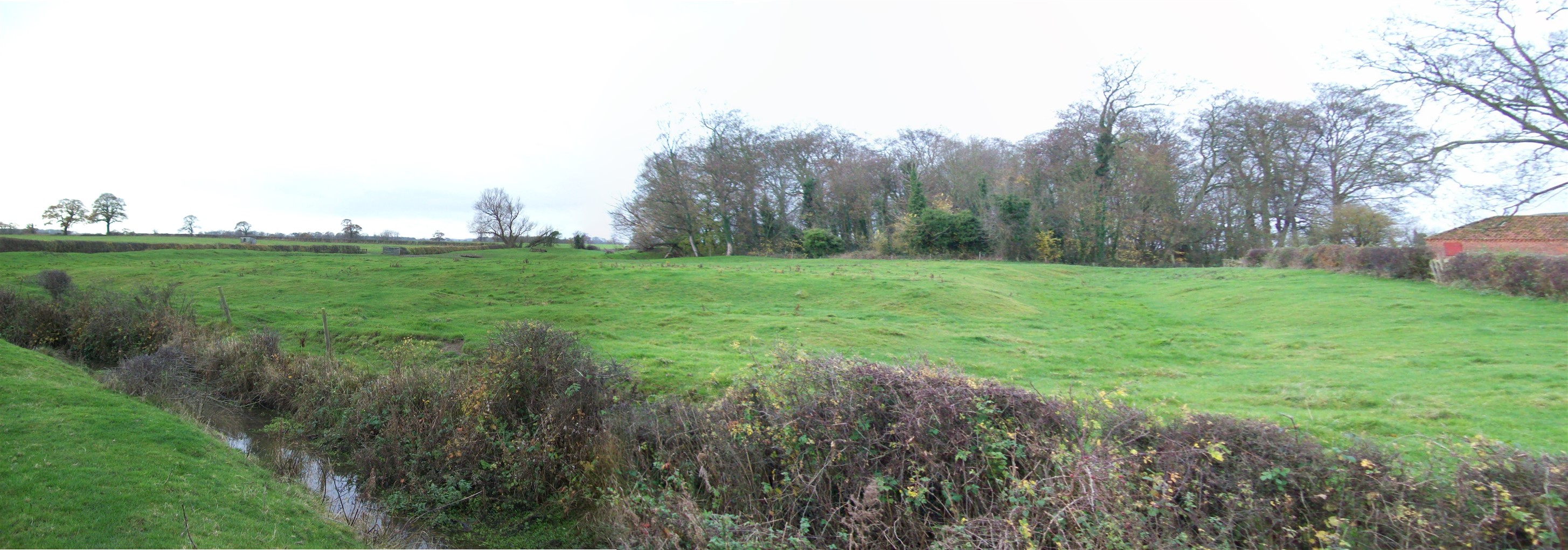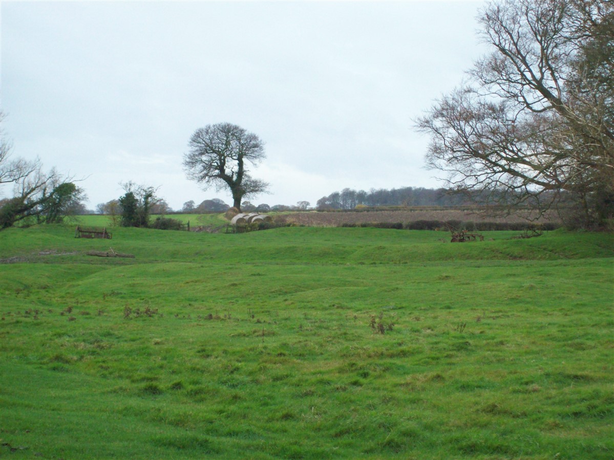 On the western side there is a substantial outer bank up to 20m wide and standing 2.5m high which decreases in size to the east so that at the eastern side there is no outer bank,allowing access to the bailey on this side. The ditch measures a maximum of 6m wide. The area of the bailey lies immediately to the east of the motte, however its original dimensions are unclear as the surviving remains have been obscured by the later moated site constructed within the bailey. The moated site includes an irregularly shaped platform centred on NGR TA99894655 surrounded by a ditch on all but the western side. The platform measures 50m north to south by a maximum of 40m east to west and the surrounding ditch measures 0.7m deep and is up to 6m wide. At the south east of the moated platform a pair of parallel linear ditches extend southwards. The easternmost of these joins the ditch surrounding the moated platform and is 40m in length and up to 4m in width. The western ditch extends southwards as far as the field boundary and then curves to extend north eastwards for some 60m. Both these ditches are interpreted as fishponds used for the cultivation of fish and as designed garden features. The moated site and motte lay within a wider enclosure or precinct in which a range of ancillary functions associated with the wider agricultural and economic functions of the manorial centre would have taken place. This is enclosed by a raised bank measuring up to 4m wide and standing up to 1m high which extends along the eastern, southern and western field boundaries defining the monument. At the northern side it extends along the southern side of the farm track as far as the complex of farm buildings. The line of the precinct boundary would originally have extended further east and south to complete the circuit, however the current farm complex has disturbed and obscured remains in this area and consequently it is not included in the monument. Within the north west corner of the precinct and to the west of the motte there are a series of significant earthworks taking the form of linear banks and rectangular platforms thought to be the buried remains of boundaries and buildings within the precinct. (Scheduling Report)