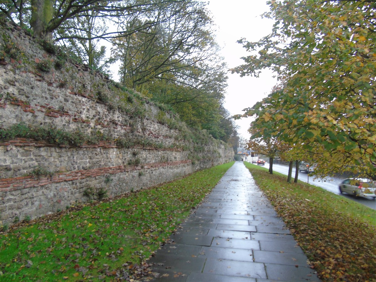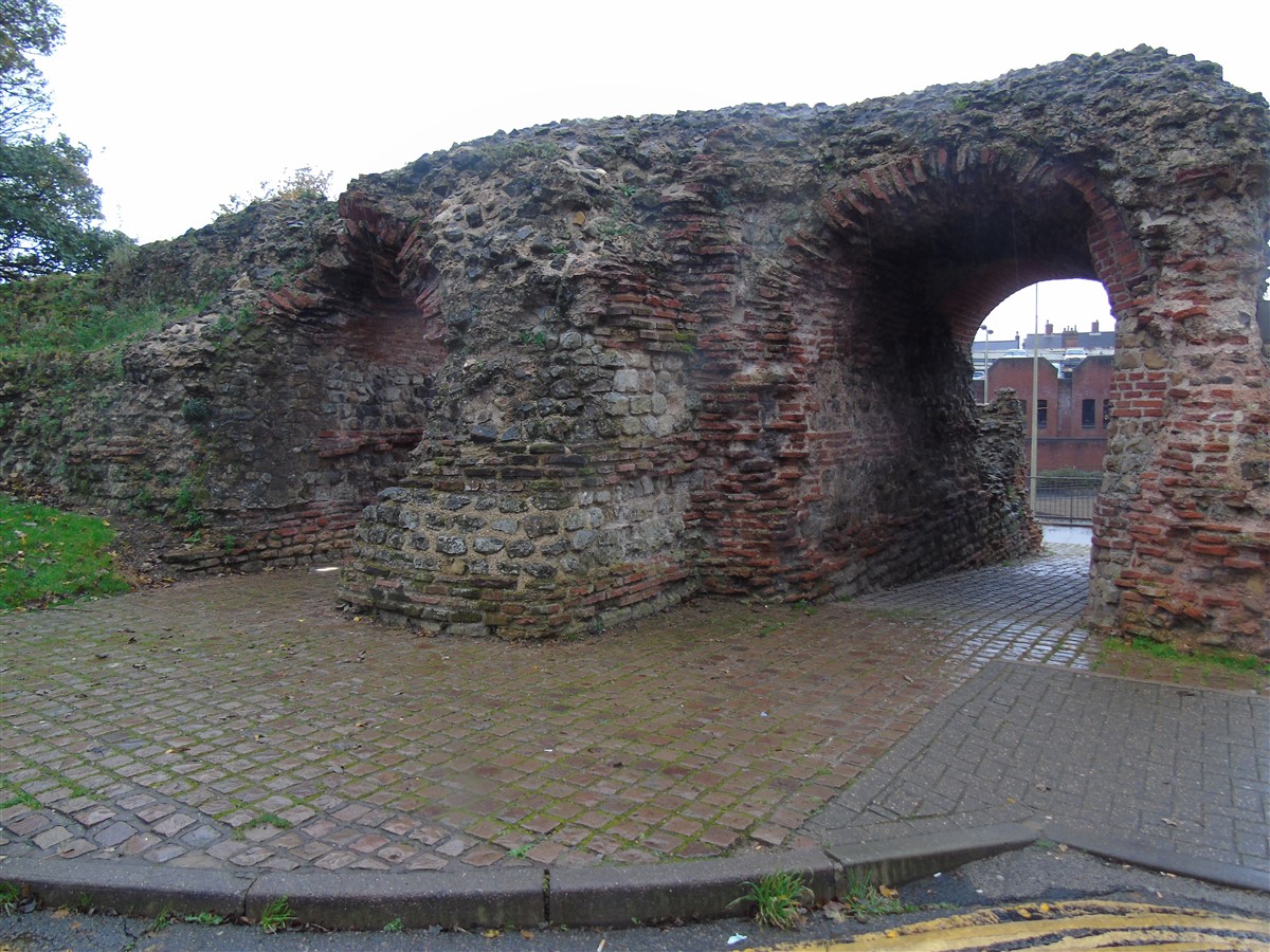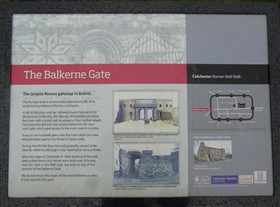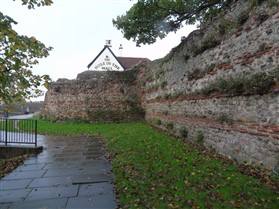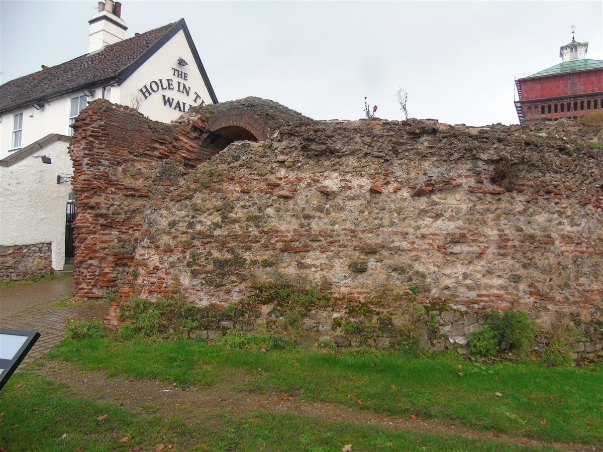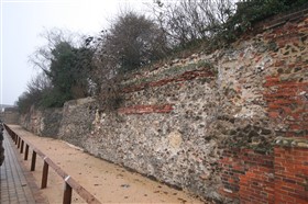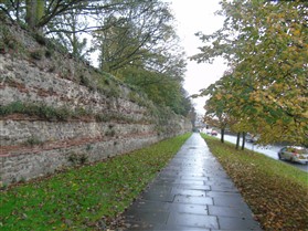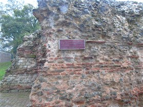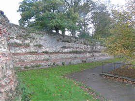 Late C3 Roman wall which remained in use through the middle ages. Substantially intact. Grant of timber received in 1215. Money for defences was uniquely provided by exemption town from duty to send a member to parliament and his expenses used in 1382, 1388, 1394, 1404 and 1410. Built of layers of septaria, interspersed with 4-fold course of brick, the lowest course going right through the wall, with a core of rubble and cement. Considerable lengths of the wall still reach a height of 15 ft, and it is on average 8 ft thick. The wall was strengthened in each corner and where it was met by the internal streets by an internal solid tower the base of one can be seen in the stretch on Balkerne Hill. The wall was extensively repaired during the reign of Richard II, 1389-1399 when it was strengthened by the addition of external semi-circular solid bastions, 4 of these remain in Priory Street. The wall was further considerably damaged in the 1648 siege.