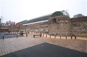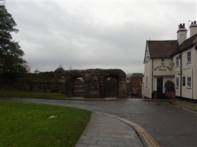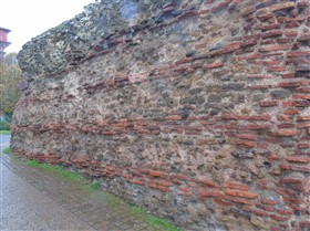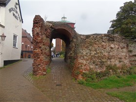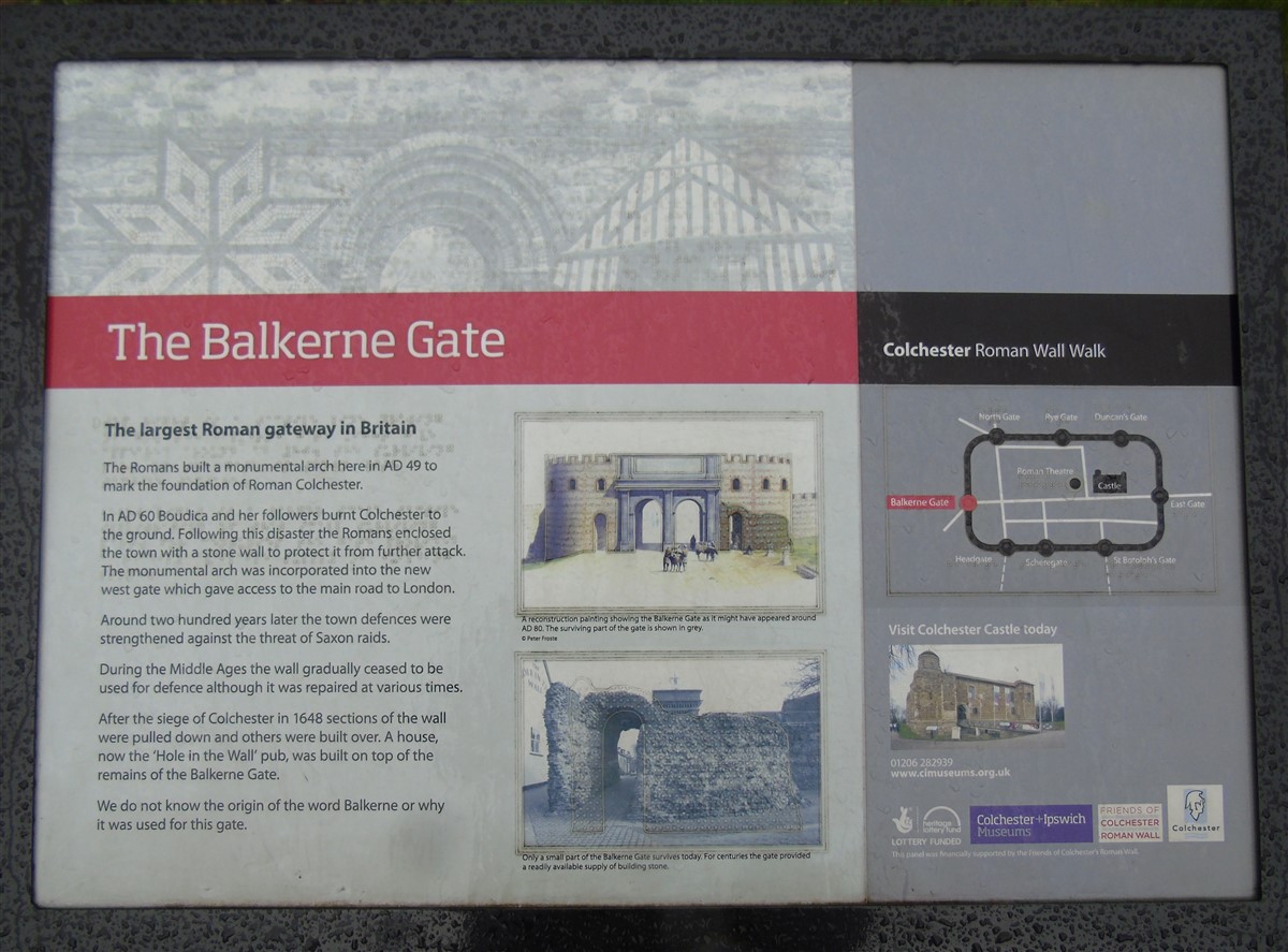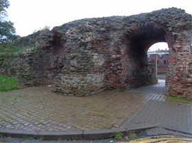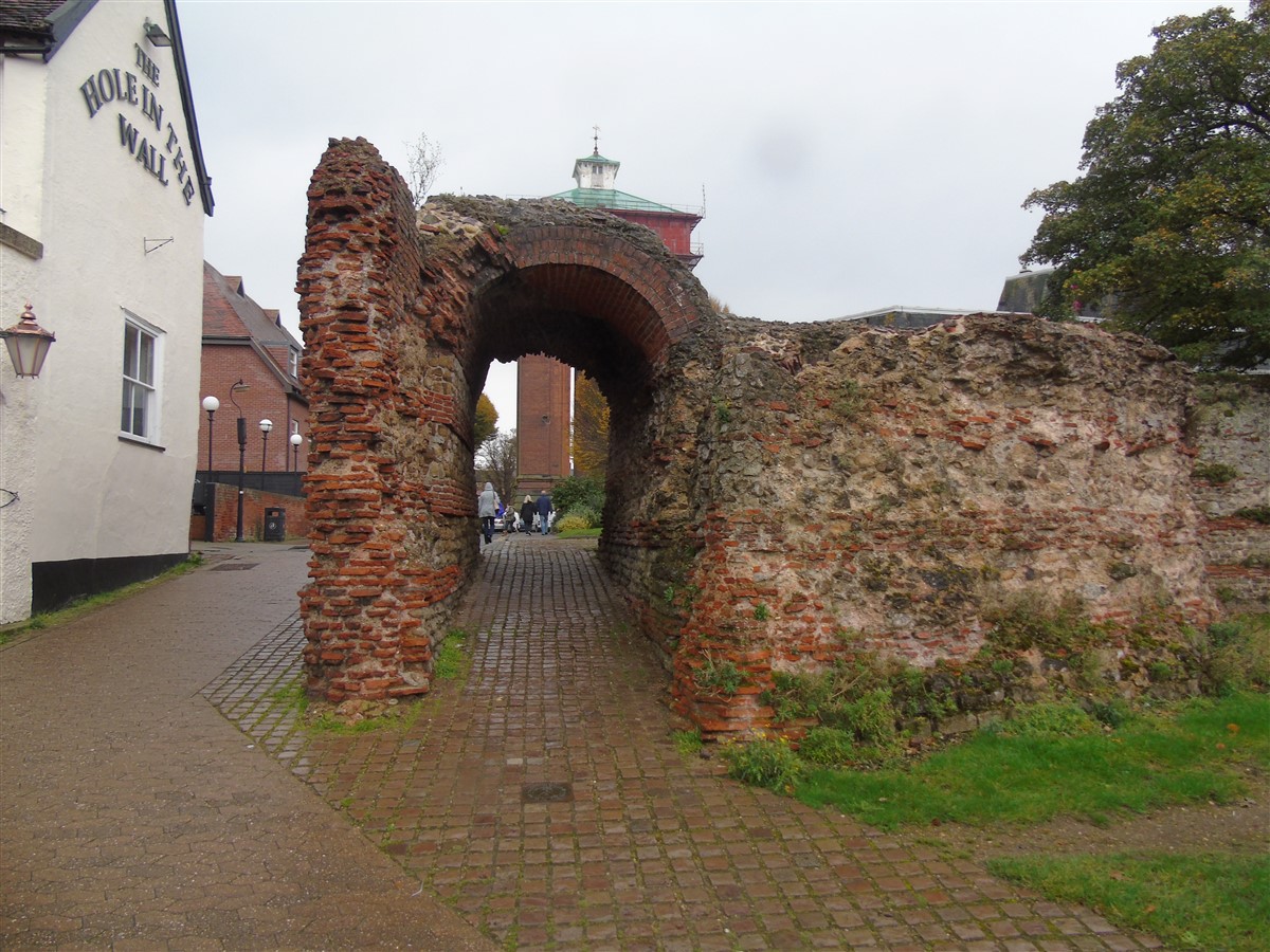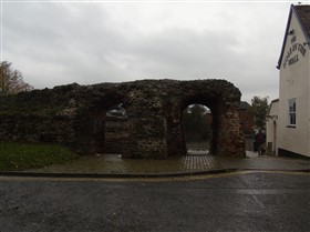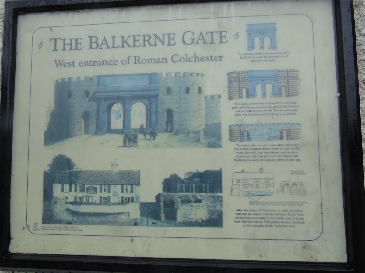 Late C3 Roman wall which remained in use through the middle ages. Substantially intact. Grant of timber received in 1215. Money for defences was uniquely provided by exemption town from duty to send a member to parliament and his expenses used in 1382, 1388, 1394, 1404 and 1410. Built of layers of septaria, interspersed with 4-fold course of brick, the lowest course going right through the wall, with a core of rubble and cement. Considerable lengths of the wall still reach a height of 15 ft, and it is on average 8 ft thick. The wall was strengthened in each corner and where it was met by the internal streets by an internal solid tower the base of one can be seen in the stretch on Balkerne Hill. The wall was extensively repaired during the reign of Richard II, 1389-1399 when it was strengthened by the addition of external semi-circular solid bastions, 4 of these remain in Priory Street. The wall was further considerably damaged in the 1648 siege.