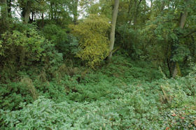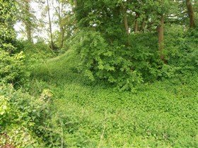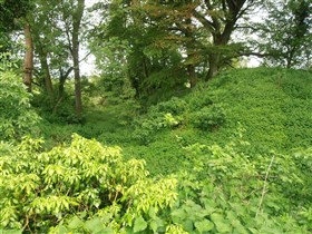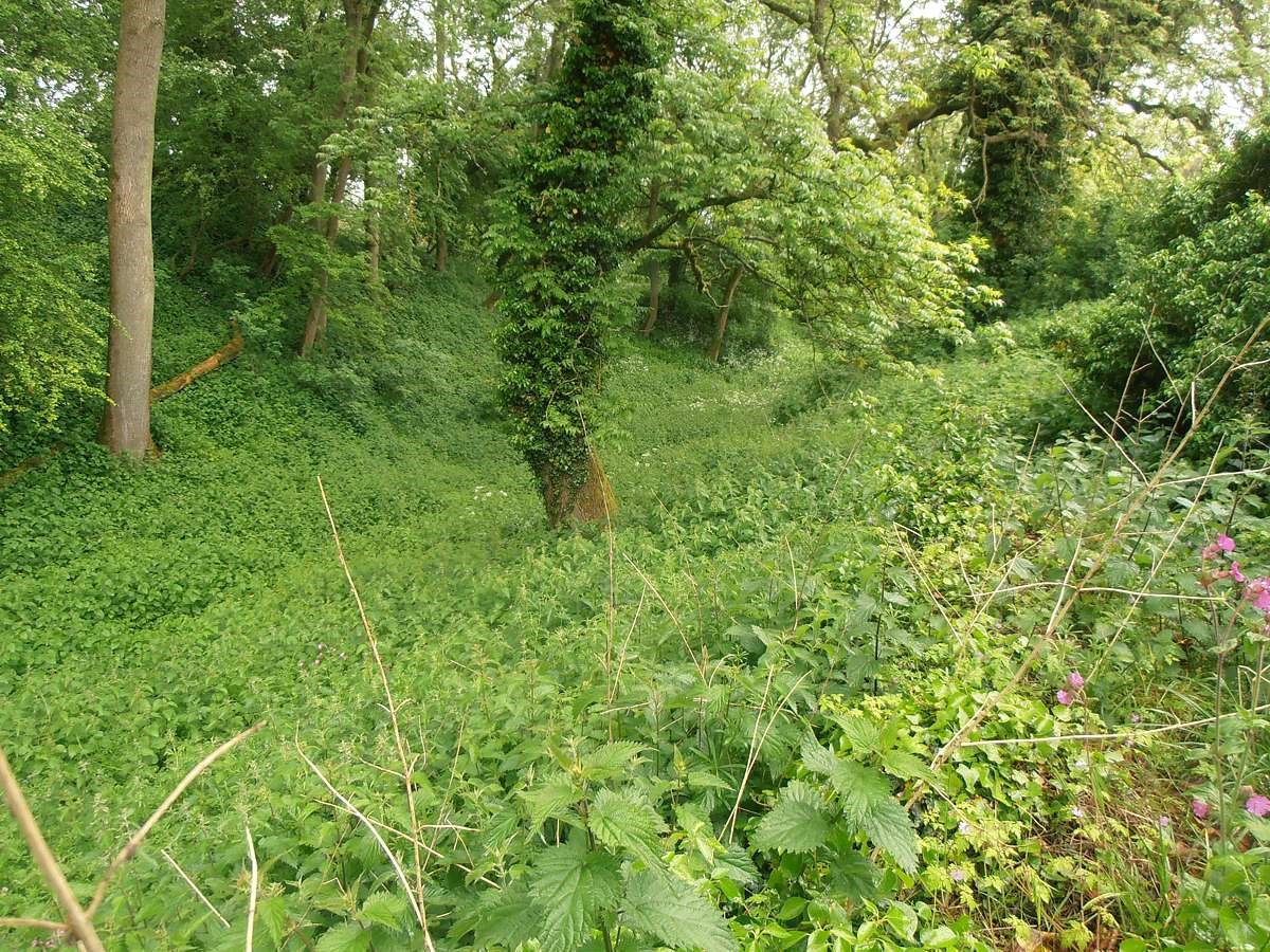 Brimpsfield Castle comprises a deep dry moat enclosing an area subdivided into three parts.