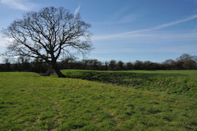 This monument includes an assortment of medieval defensive and settlement earthworks including a ringwork, motte and bailey, moated site with fishpond, a further fishpond, a swannery, church, buried settlement remains, ridge and furrow and civil war defences. The complex is situated within gently undulating countryside and lies on the southern side of a small stream. The presence of a ringwork is strongly suggested by the awkward fit of the later motte within its ditch, which on its western side extends much further than on its three other sides. The ringwork, which would have had maximum internal dimensions of 60m east to west by 41m north to south, was probably replaced by the motte relatively soon after or even perhaps during its construction. The flat topped circular motte mound is associated with at least two baileys. The bailey east of the motte contains earthworks of at least three buildings and the one to the west is very small, but more strongly protected. The moated site at SO 7498 2298 includes a raised roughly triangular platform surrounded by a ditch measuring up to 7m wide. A rectangular depression leading from the southern edge of the moat represents a small conjoined fishpond. The moat is situated within an area of ridge and furrow, which survives particularly well in the area to the west. The swannery is centred at SO 7471 2294 and is situated in an area marked as 'Swan Pools' on the 1840 Taynton Tithe Map. It includes an amorphous shallow depression measuring up to 157m long by up to 42m wide. A 10m diameter mound in the centre of the pond represents a nesting island and several channels within the eastern end of the depression probably link it with the stream to the north, and a leat, which extends for 28m to the south-east, is situated at SO 74712290. A second fishpond survives at SO 74812282 and a short distance north east of this are the earthwork remains of the church burnt down by Royalists in 1643