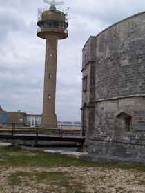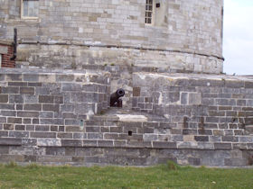 The monument includes Calshot Castle, a mid 16th century stone built artillery castle with 18th and 19th century alterations, lying on Calshot Spit on the southern shore of Southampton Water. The precise and symmetrical plan of the castle centres on a three storey gun tower or keep, separated from the surrounding curtain wall by a courtyard within which lie both accommodation buildings and later searchlight emplacements. The buildings of the castle are surrounded by a shallow stone-lined moat beyond which, on the seaward side, lie a stone-paved counterscarp and stone sea defences. The keep is approximately 16m in external diameter, but only 8m internally. The lower storey is octagonal in plan, but the upper two floors, while retaining an octagonal interior plan, are cylindrical on the outside. The external appearance of the upper part of the tower differs from the original only in having the parapet on the roof altered in the 18th century and concrete gun emplacements added in 1907. The 18th century alterations involved the replacement of the curved parapets with their embrasures for heavy guns with an unbroken parapet designed to protect troops. In 1907 the parapet was further modified on its east side by the addition of mass concrete to form emplacements for two 12 pounder guns. Internally the keep is divided into three levels below the roof. The basement may originally have been vaulted although, due to considerable alterations, little is known of its original form