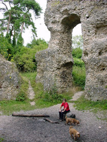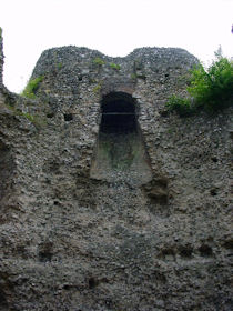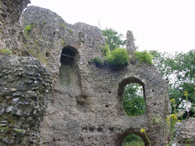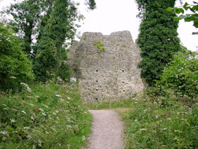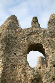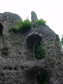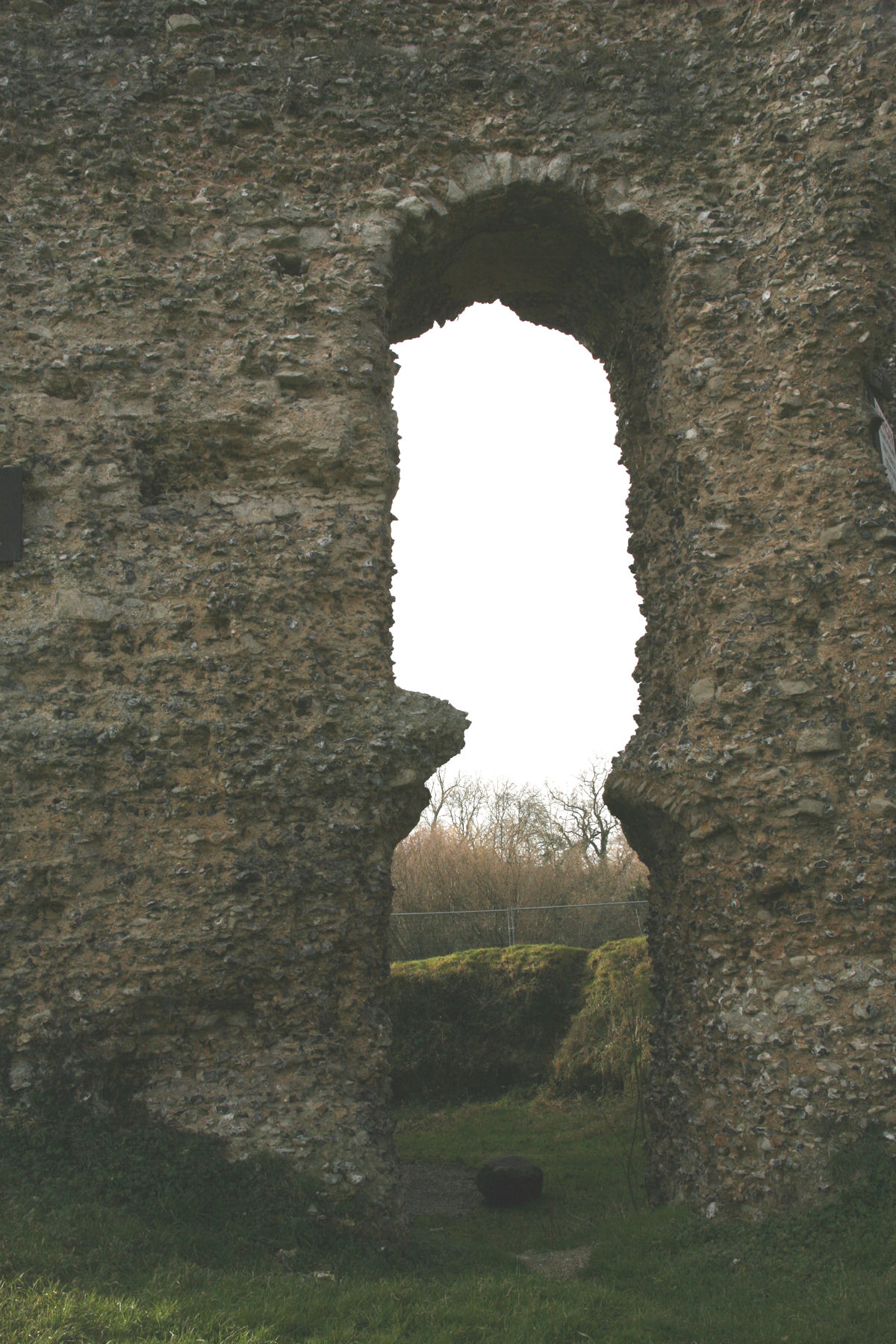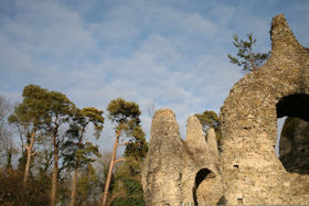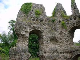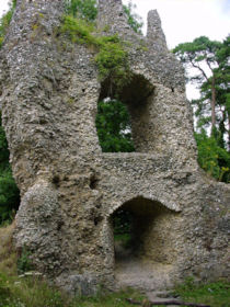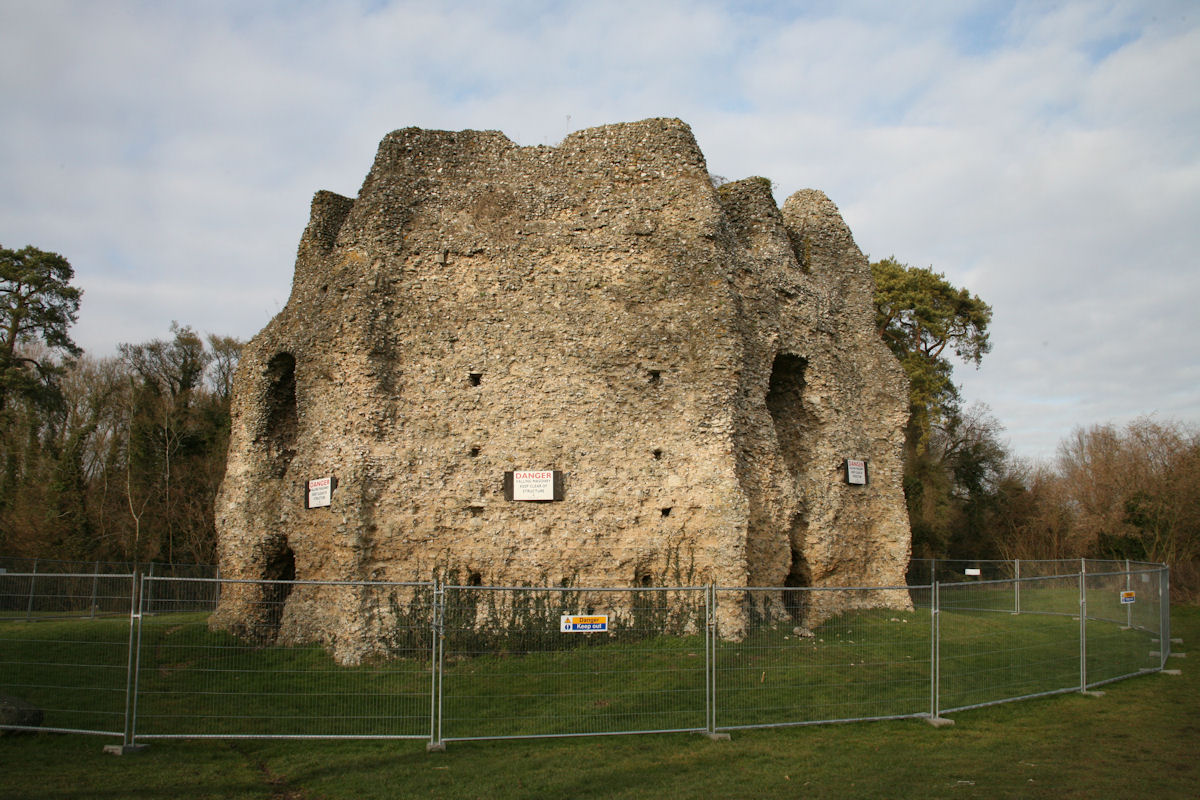 Odiham Castle, standing on an inner bend of the Whitewater, has two baileys, divided and defended all round by a moat. The buttressed, octagonal keep dating from c.1160, is in a ruinous condition but is still some 40 ft. high. The entrance has been destroyed but appears to have been at the second storey; both the second and third storeys have fireplaces and were well lighted (Toy 1953).