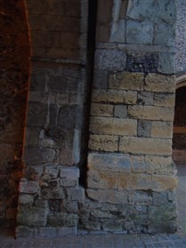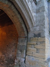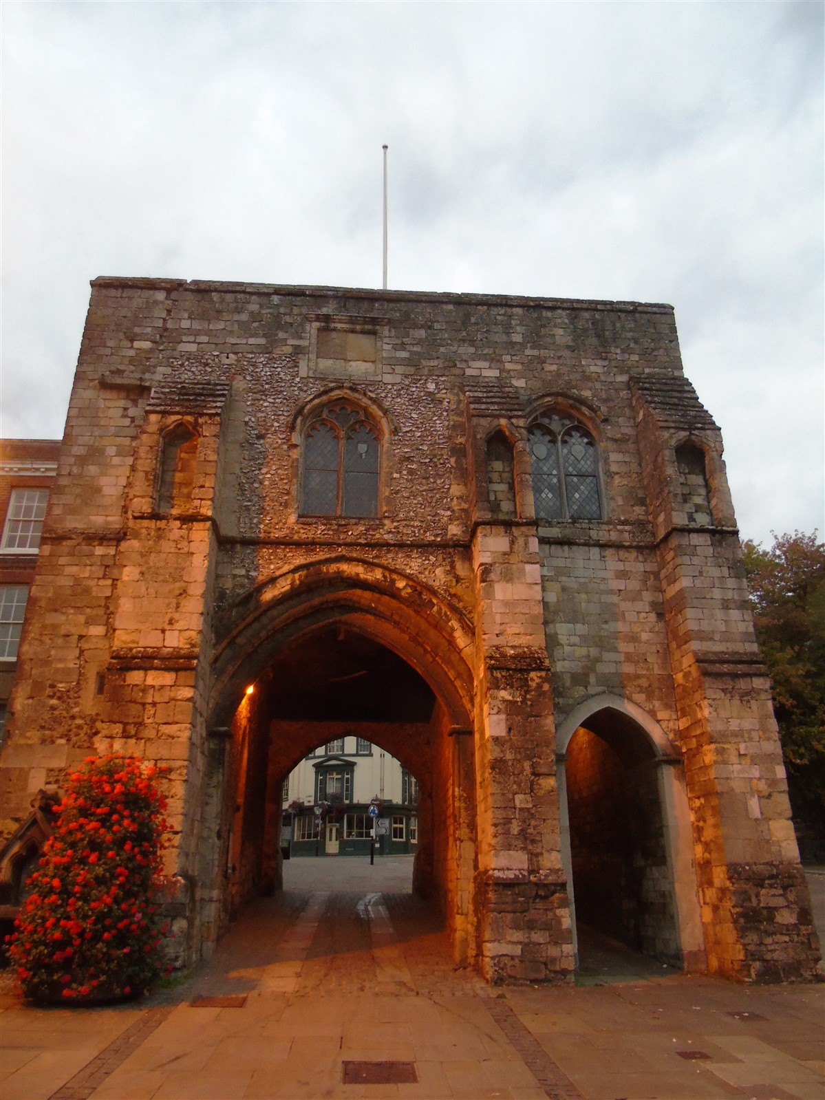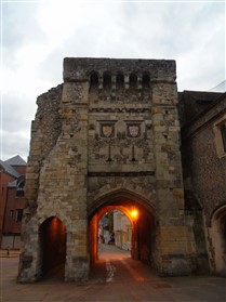 Kingsgate, over which is St. Swithun's Church, retains a few traces of 14th-century date, but appears to have been altered about the 15th century. It is pierced by three arches, that on the west being modern. The side arches are plain chamfered and much restored. The 14th-century central arch to the south is of two moulded orders and is set between small buttresses. On the north the central arch is of the same date and of two chamfered orders. There is no vaulting over the roadway or the footpaths.