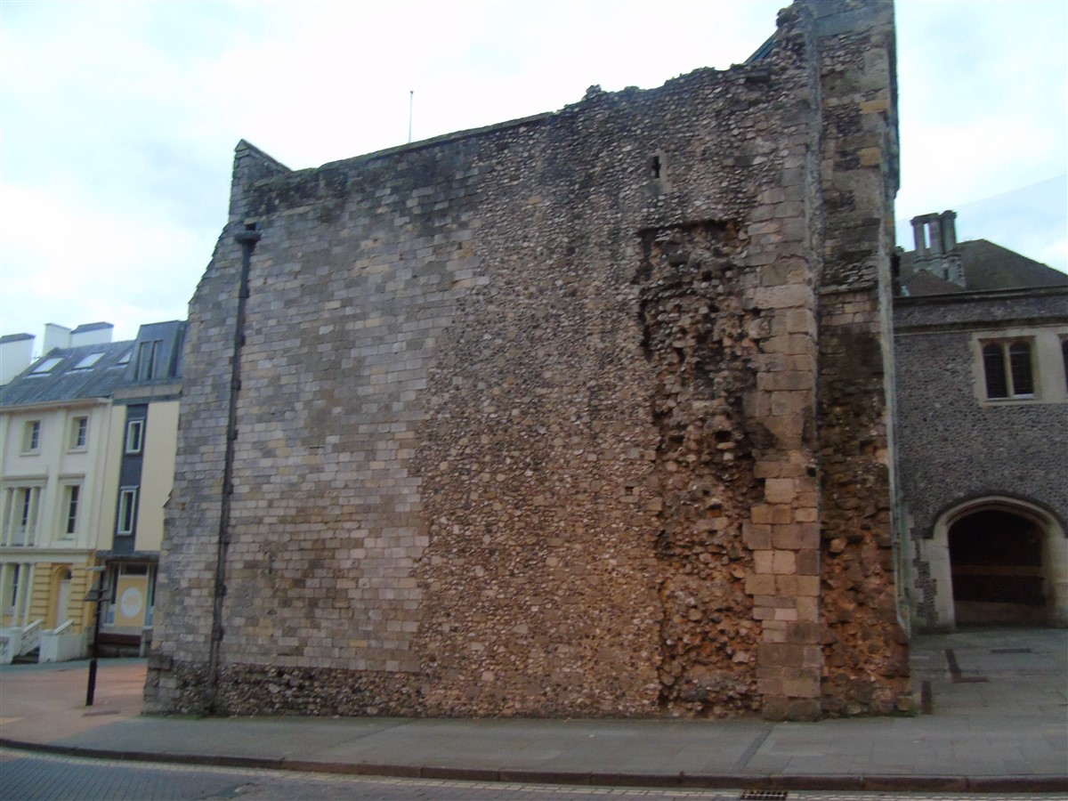 Thence the wall as it went west made a slight bend to the south, running along at the back of the modern houses on the south side of City Road as far as the Hermit's Tower (a modern erection on the old site of a drum tower), where it turned south, passing along the present Tower Street to Westgate. At Westgate the city wall became the castle wall, which curved round to the south-east to meet the city wall again at Southgate, which stood a few yards south of the point where Southgate Street and St. Swithun's Street meet. From Southgate the wall passed down behind the houses on the south side of St. Swithun's Street, running almost parallel with the Close wall as far as Kingsgate. From Kingsgate it passed east, as the good bits of remaining wall in some of the gardens plainly show, behind the houses on the north side of College Street to meet the Wolvesey Castle wall as it crossed the brook almost opposite the entrance to St. Mary's College. A ditch ran round the city, several traces of which can still be seen; but that part of the ditch round the royal castle was separate from the city ditch and was supplied with water from a different source.