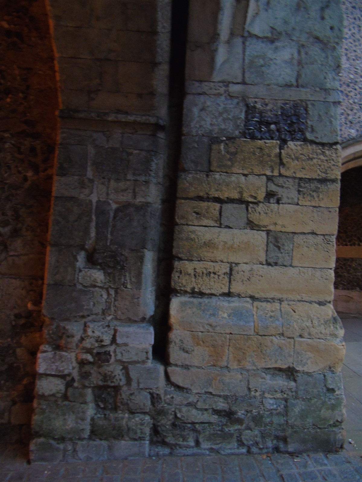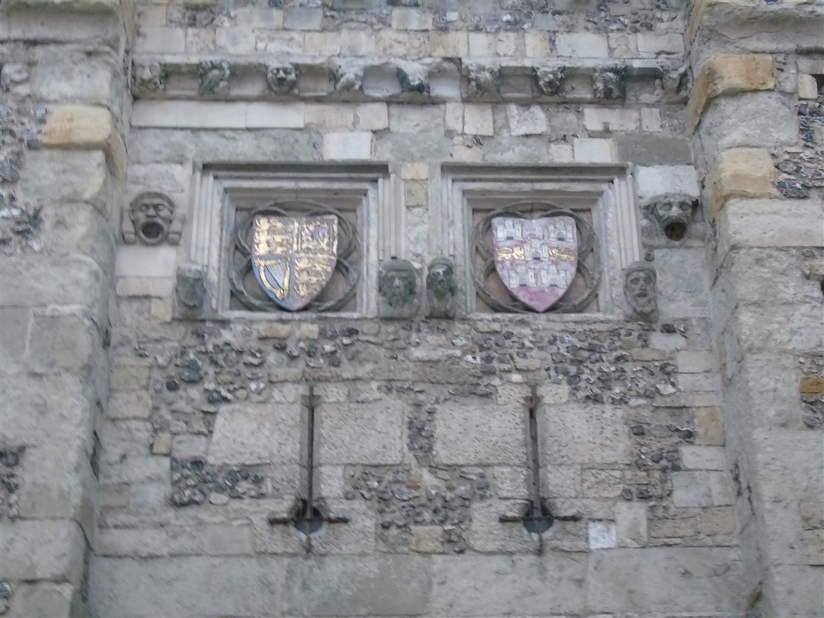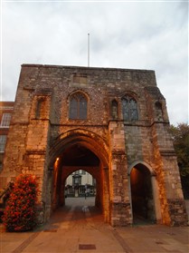 Westgate, to a considerable extent, retains its original form. It is of late 14th-century date and is of two stories. The central arch is original and is of drop two-centred form. On the west, the outside, it is of two continuous moulded orders. On either side the wall face is advanced, the projections being carried up to the parapet, which between them and over the entrance is overhanging and machicolated, with chamfered corbels supporting it. Behind the moulded orders is the groove of the portcullis, the recess for which is visible in the chamber over the roadway. Above the arch is a moulded and enriched string course, and below the machicolation a second string set with grotesque heads and foliated bosses. In the middle stage thus formed are a pair of loop-holes terminating at their foot in small circular openings. Above these are two square panels with labels, containing quatrefoils and shields. On either side of these are grotesque heads forming openings for the drawbridge chains. The eastern or inner face has been somewhat more restored. The arch is two-centred and of three moulded orders. Above it is a late 14th-century window with a twocentred moulded head with a label and moulded jambs, which, originally of two lights, has had the tracery knocked out and a wooden frame inserted. On either side are offset and weathered buttresses, in the top stage of which are trefoiled niches, and there is a third and similar buttress to the north on the other side of the modern arch over the footway. Above the latter is a second window similar in every way to the one above described. The south footway passes outside the old structure under modern buildings. On the flanking wall to the south is a door, completely restored, to the vaulted staircase leading up to the chamber over the roadway and from thence continued to the roof. The chamber is used as a museum of objects connected with the city and contains the old city chest, the bronze moot horn, some of the old standard weights and measures and a miscellaneous collection of arms, armour, &c. From the 17th to the early 19th century it was used as a debtors' prison, and the semi-dungeon into which the poorer debtors were thrown is beneath the museum and is indicated on the outside by a blocked-up window.