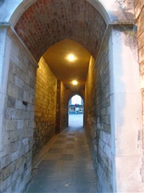 At the present day place-names alone, with the two gates of Westgate and Kingsgate and the Hermit's Tower, and traces here and there of foundations and materials, remain to mark the existence of the old city boundaries and walls. Yet it was not until 1791 that Eastgate, Northgate and Southgate were destroyed, and only then because their extreme decay, lowness and narrowness made them dangerous for traffic. Eastgate stood several feet west of the old Soke Bridge, the east wall running thence south to meet the wall of Wolvesey Castle, which formed the southeast corner of the boundary, and north to Durngate along the back of the modern Eastgate Street. Durngate, or the postern gate, was at the extreme north-east corner, where the bridge now crosses the river on the way to Winnall. Then the north wall went west along the present North Walls, its foundations being under the row of cottages which runs up the north side of the North Walls, some of those facing Trinity Church having been built within the last fifty or sixty years partly out of materials of the wall. Northgate, over which was the church of St. Mary, after the Reformation a porter's lodge, was at the north end of Jewry Street, just at the entrance to St. Bartholomew Hyde Street, about where the modern lamp-post stands