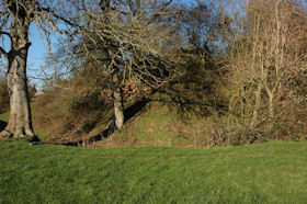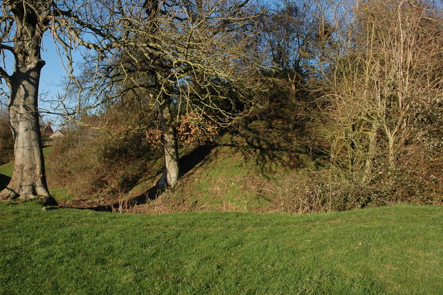 Remains of a Motte and bailey, extant by 1216 . The motte is 35m in diameter and 8m high. The ditch is from 1.3m deep on the south side to 2.5m deep on the north side below the bailey, and is 8m in width. The bailey is some 50m square and is bounded by a ditch on the east side, 12m in width and 2m in depth. there are also the remains of fishponds. (PastScape)