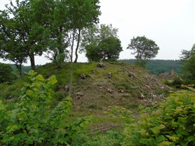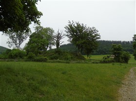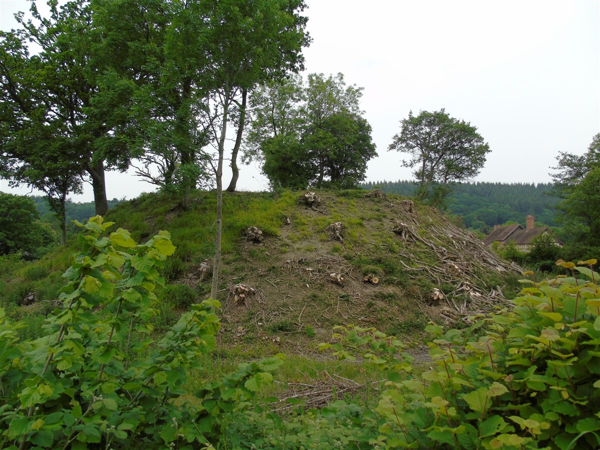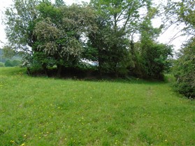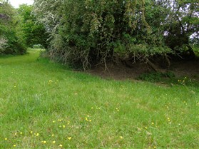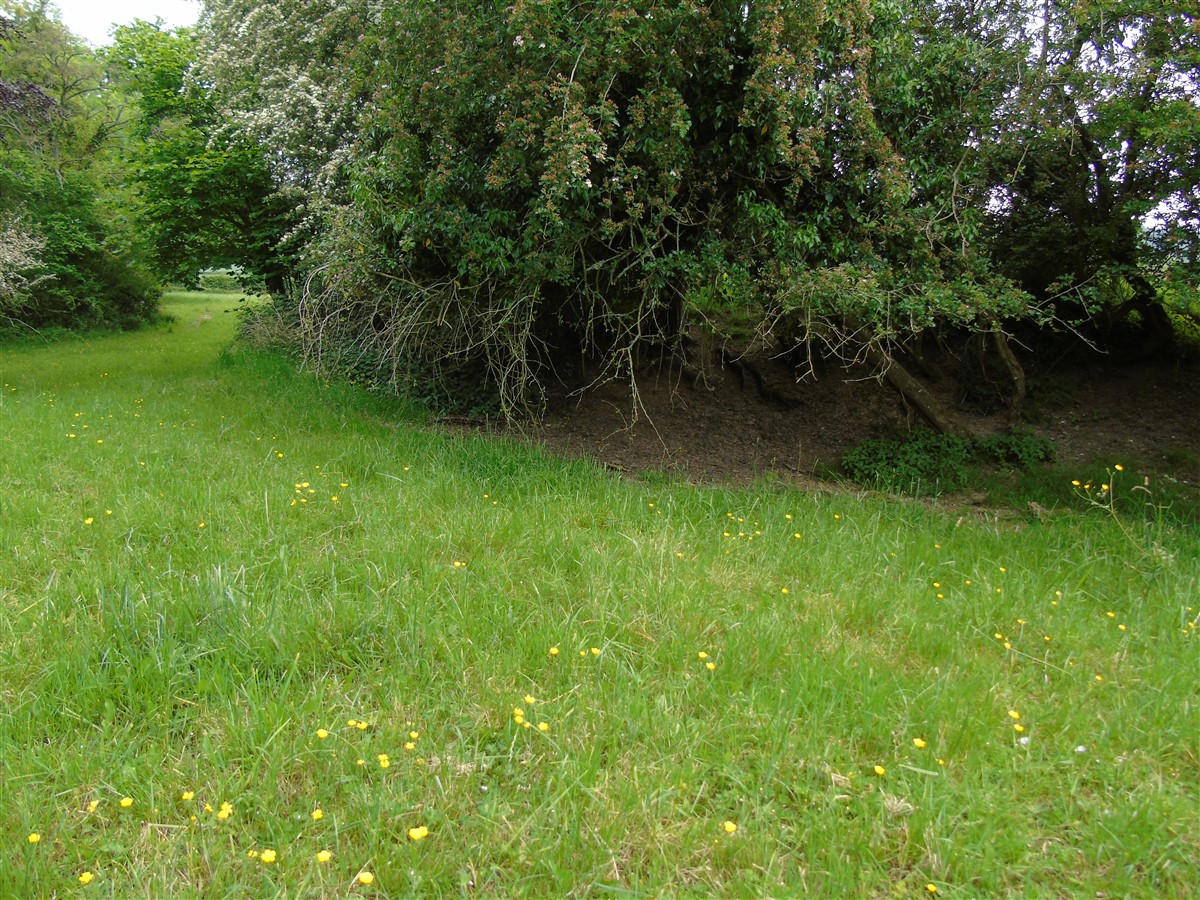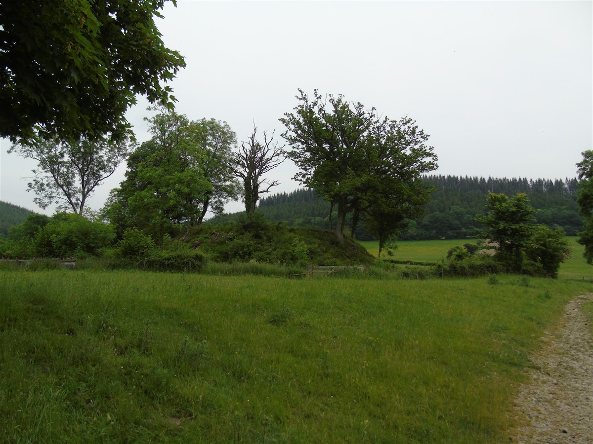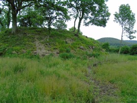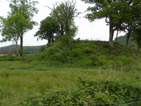 The earthwork remains of a moated motte mapped from aerial photographs. When field investigated in 1972 the earth and stone motte was 44m in diameter at the base and 22m in diameter on the summit. It rose 6m above the encircling moat. The marshy moat was 11m in width and from 0.5m deep on the south side to 1.5m deep on the north side. The moat was fed by a stream from the north east, leaving from the south west. (PastScape)
