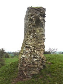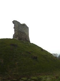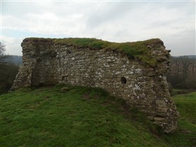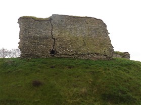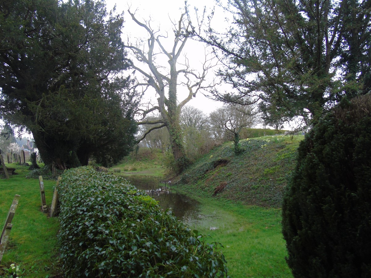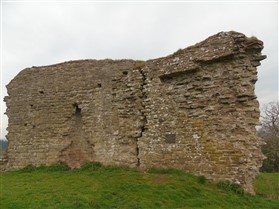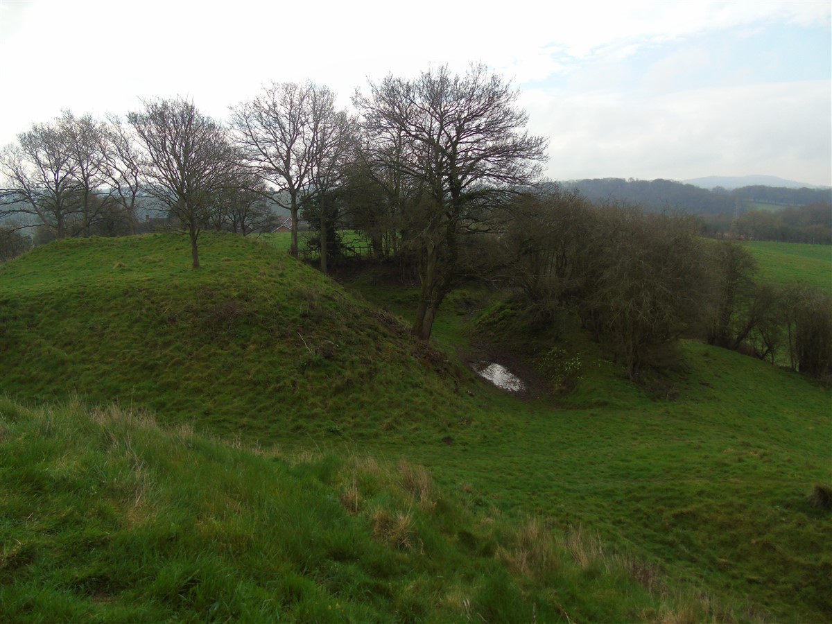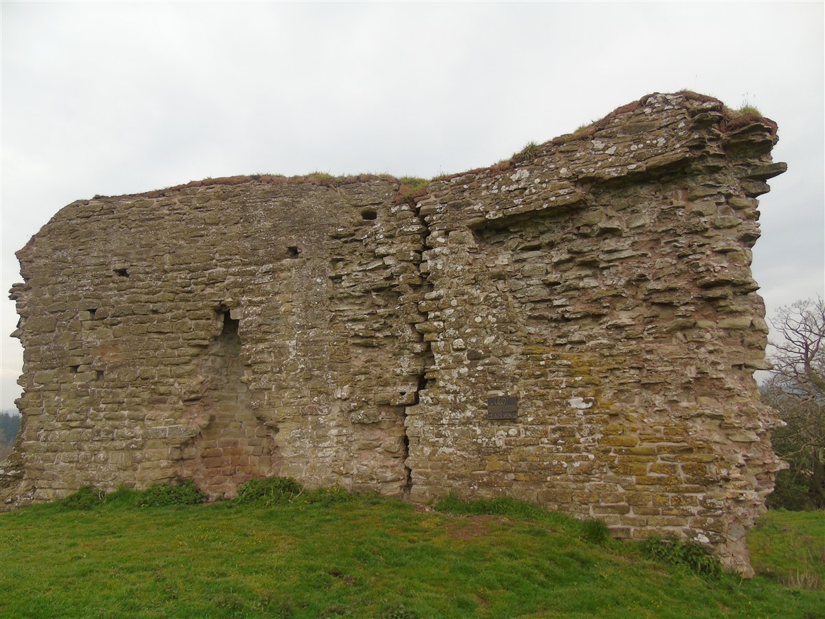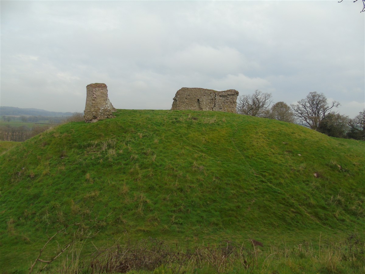The bailey is entered from the south-west, where there is a gap in the rampart surrounded by a small mound, which could cover the remains of a gatehouse. On the motte summit are two fragments of a shell keep wall about 2m thick and 5m high. The shell keep is thought to be polygonal in shape and perhaps large enough to have had a wall walk. This wall would have enclosed an area c.70m-80m in diameter. A deep well has also been discovered within. The remains of two round-backed fireplace flues, of the former internal lean-to buildings, are also visible within the wall fragments. On the west of the site a stream has been dammed by a continuation of the north bank of the western outer bailey; this was presumably intended to form a fishpond. (Herefordshire Through Time)