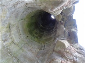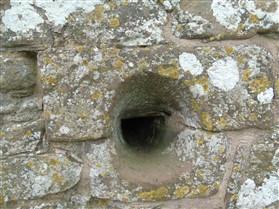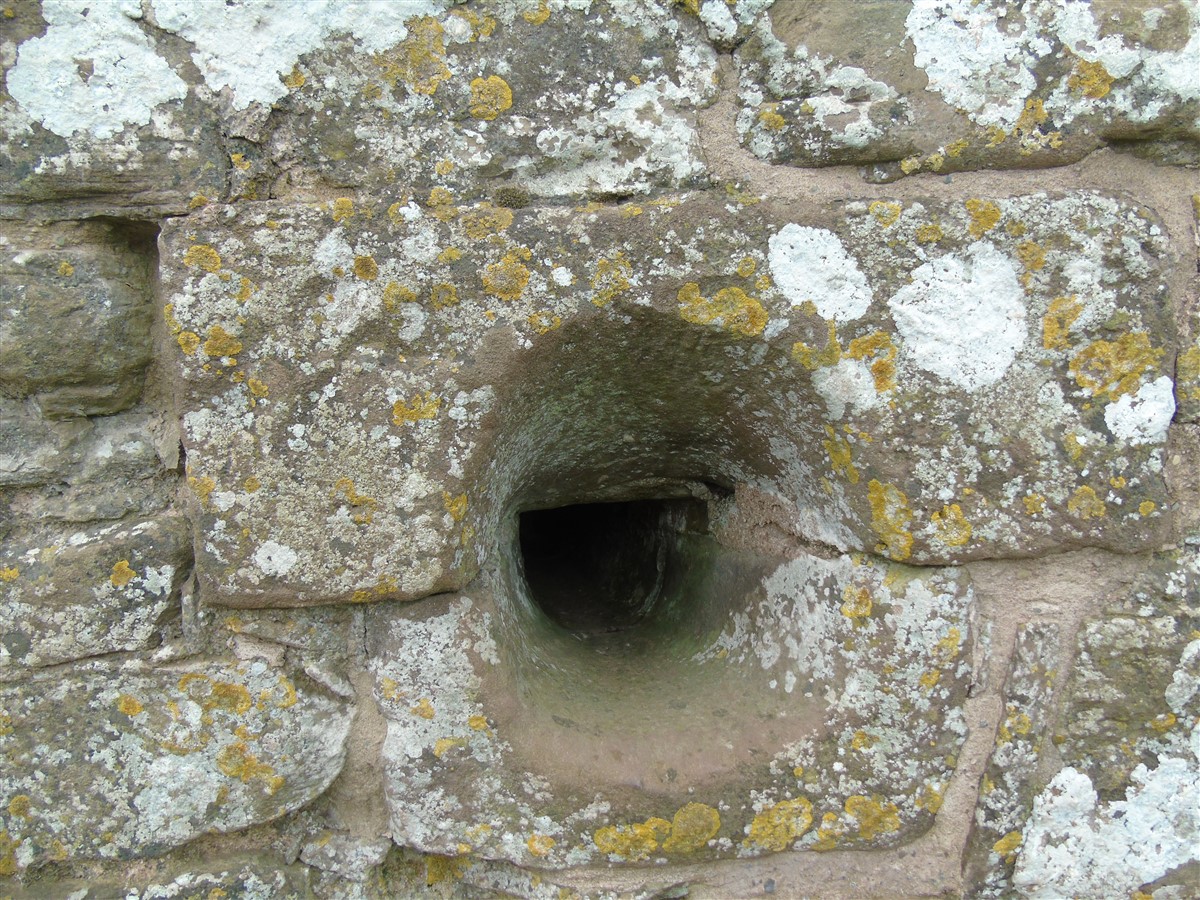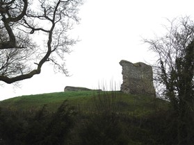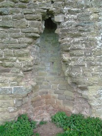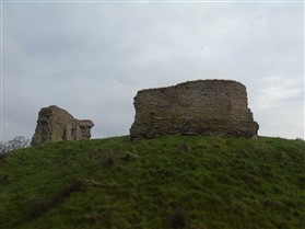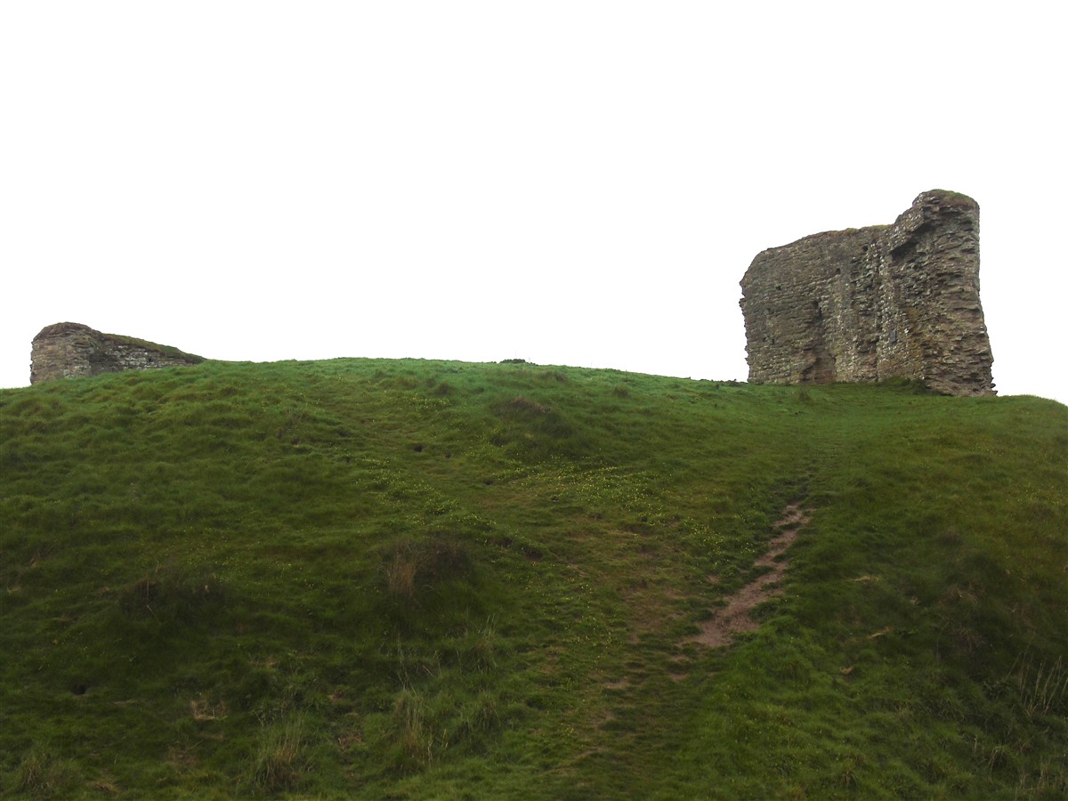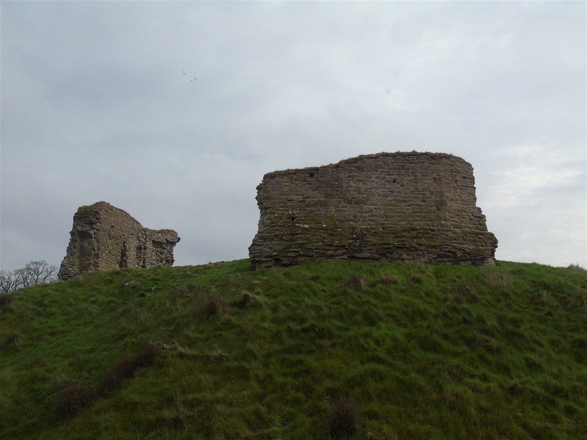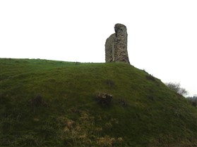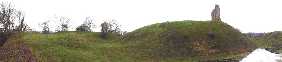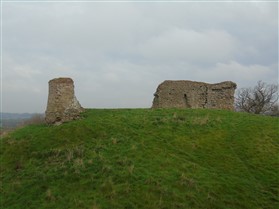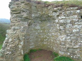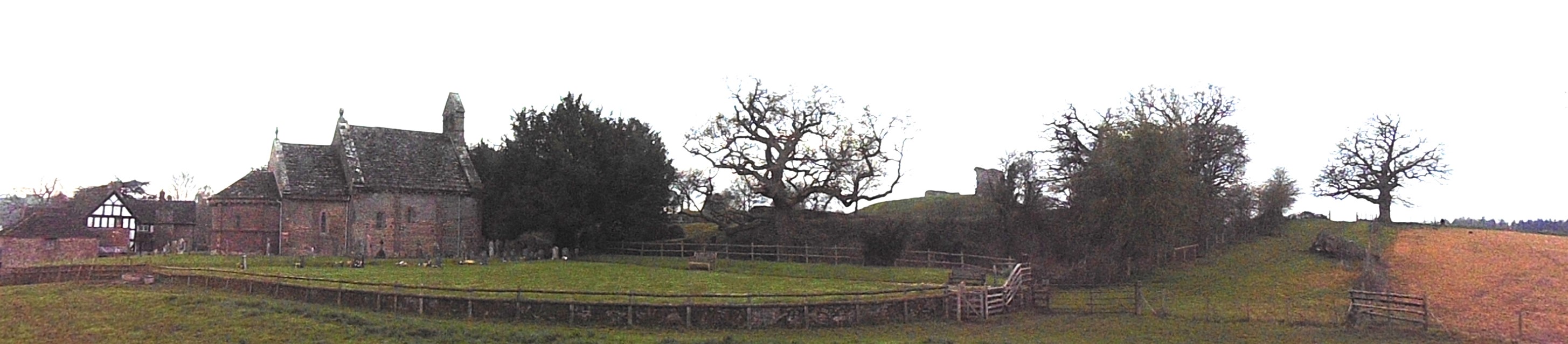 The bailey is entered from the south-west, where there is a gap in the rampart surrounded by a small mound, which could cover the remains of a gatehouse. On the motte summit are two fragments of a shell keep wall about 2m thick and 5m high. The shell keep is thought to be polygonal in shape and perhaps large enough to have had a wall walk. This wall would have enclosed an area c.70m-80m in diameter. A deep well has also been discovered within. The remains of two round-backed fireplace flues, of the former internal lean-to buildings, are also visible within the wall fragments. On the west of the site a stream has been dammed by a continuation of the north bank of the western outer bailey; this was presumably intended to form a fishpond. (Herefordshire Through Time)