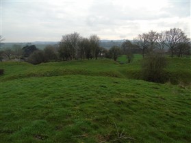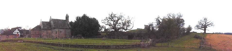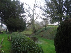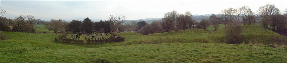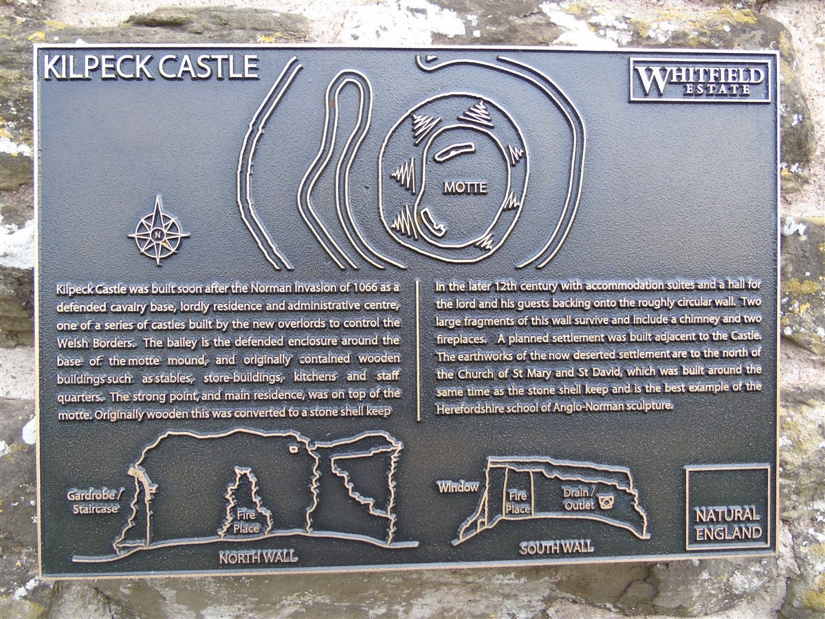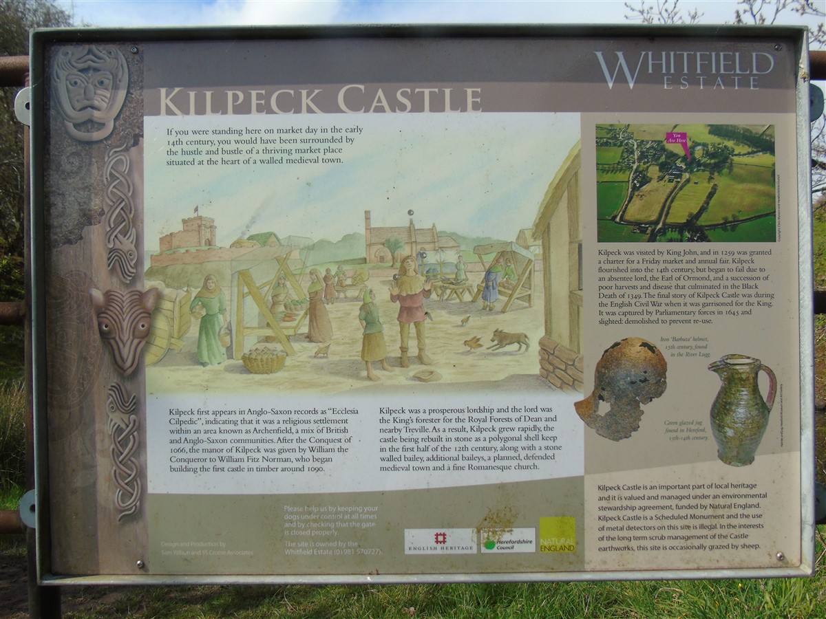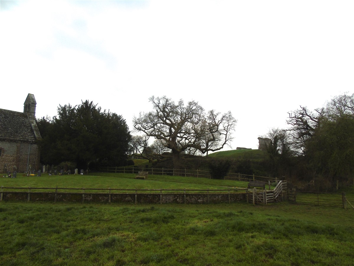 Kilpeck is 7-8 miles south-west of Hereford. The earthworks of the castle lie between the small ornate church of c. 1140 to the east and a hollow to the west. The graveyard of the nearby church is now beginning to encroach on the castle site. The earthworks consist of a motte with a base diameter of c. 50m, rising 8m to a summit 28m in diameter with a large kidney-shaped inner bailey to the east, between the castle and the settlement. The motte is completely surrounded by a ditch. The inner bailey has the remains of a rampart along its north and south sides. It was entered from the south-east where a gap in the rampart is flanked on one side by a small mound, perhaps once a small gatehouse. There are two outer baileys which survive on the south and west, surrounded by either ditches or scarps. The Royal Commission for the Historical Monuments of England (Inventory of the Historic Monuments of Herefordshire, Volume I: South-West, 1931, p. 158) noted a third outer bailey to the north when it surveyed the site, but this has since been destroyed. The outer bailey is roughly square and lies to the south. It has an outer ditch and the remains of a rampart on its north and south sides