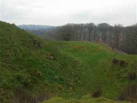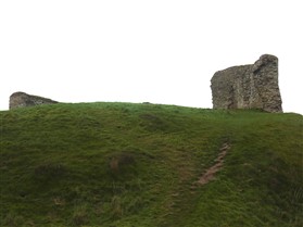 Motte and five baileys with strong counterscarp banks above combe to south, and flanking baileys to north-west and south-east and rectangular village enclosure of bank and ditch. Parts of a polygonal rubble shell-wall remain on the motte, with a round-headed fireplace and circular flue to the north, two drains to the east and an interior cross-wall. The shell may have been circular internally, it has a sloping external plinth. Trial excavations in 1982 revealed seven periods of occupation with pottery giving a date range from C12-C15. Excavation revealed evidence of both timber and stone buildings, and a metalled yard or trackway, overlying the tail of the rampart. (PastScape)