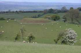 earthwork and buried remains of a motte castle, situated on the eastern tip of an east-west ridge, near the head of the Golden Valley. The ridge slopes steeply down to tributaries of Pont-y-Weston Brook to north and south. The remains include an earthen motte mound of circular form, c.32m in diameter at the base, whose steep sides rise c.3m to a top of roughly 22m diameter. An earthen bank runs around the rim of this otherwise flat top, barely visible in the eastern quarter but standing to a height of c.0.6m and c.2m wide to the west. This bank will have supported a timber palisade around the motte to enhance its defences. The motte is surrounded by a ditch which is now mostly infilled, but is clearly visible as an almost continuous circle of thicker and darker grass up to 4m wide. Around the north and west it remains as a depression c.0.3m deep, and is narrower around the south and east where the ground slopes steeply away. Where the ground slopes less steeply to the north, north east, and westwards along the ridge, an earthen bank has been cast up outside the ditch, to improve the defences of these more vulnerable areas. To the north west and east this counterscarp bank is visible as a slight rise some 3m wide, but to the north it survives up to 0.5m high, probably due to its incorporation into a later field boundary bank. To the ENE the ditch is interrupted by a causeway which continues as a hollow up the side of the mound. A small amount of masonry is visible in this hollow, at the foot of the mound to the right of it, and in the counterscarp bank near its junction with the causeway. This causeway probably represents the original access to the motte, the masonry perhaps being the remains of stairs or footings for a bridge. The motte castle 230m north west of Nant-y-bar is part of a concentration of medieval defensive monuments in the area