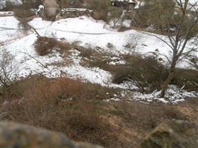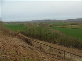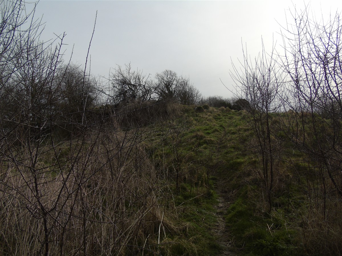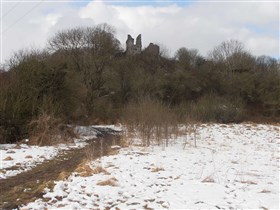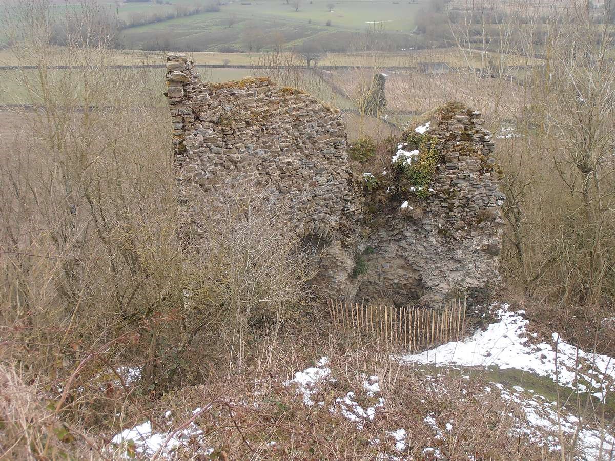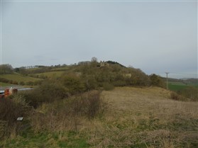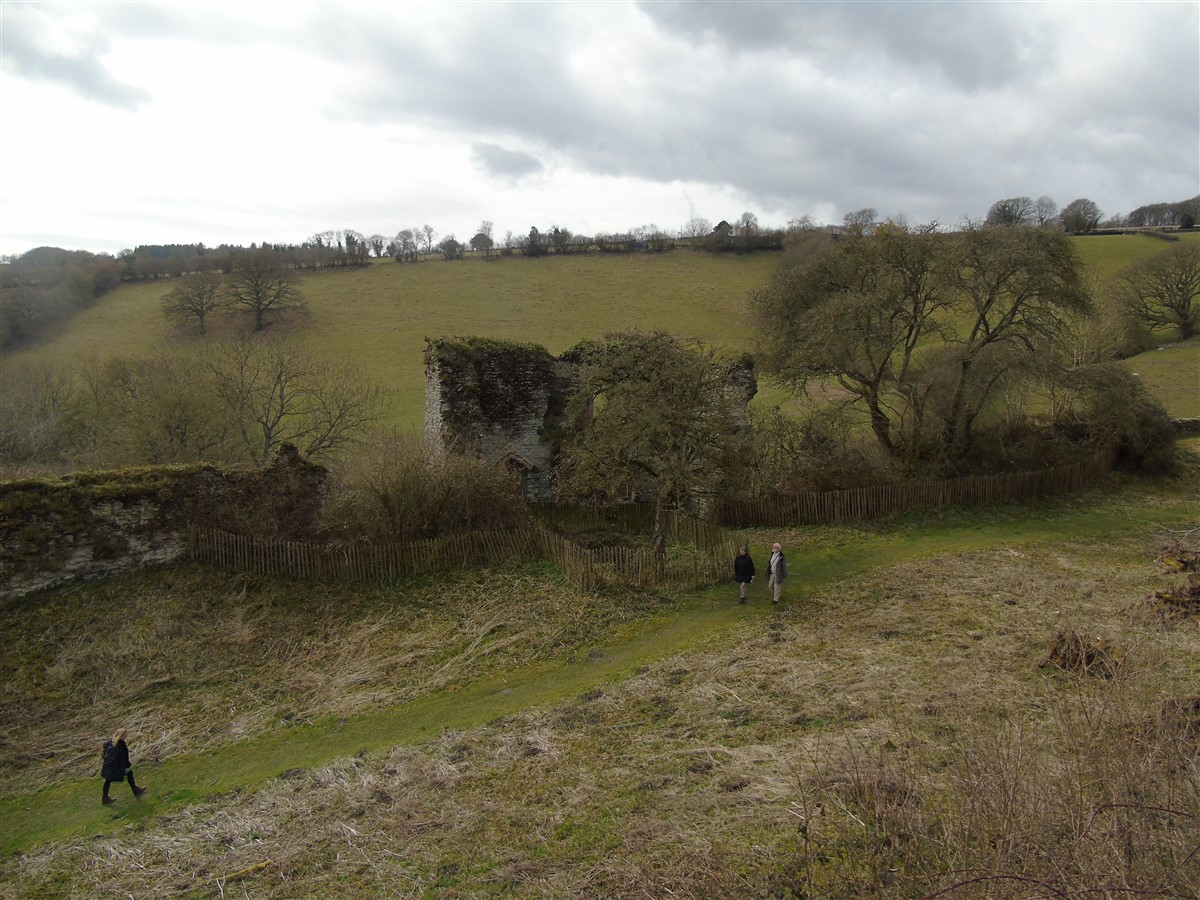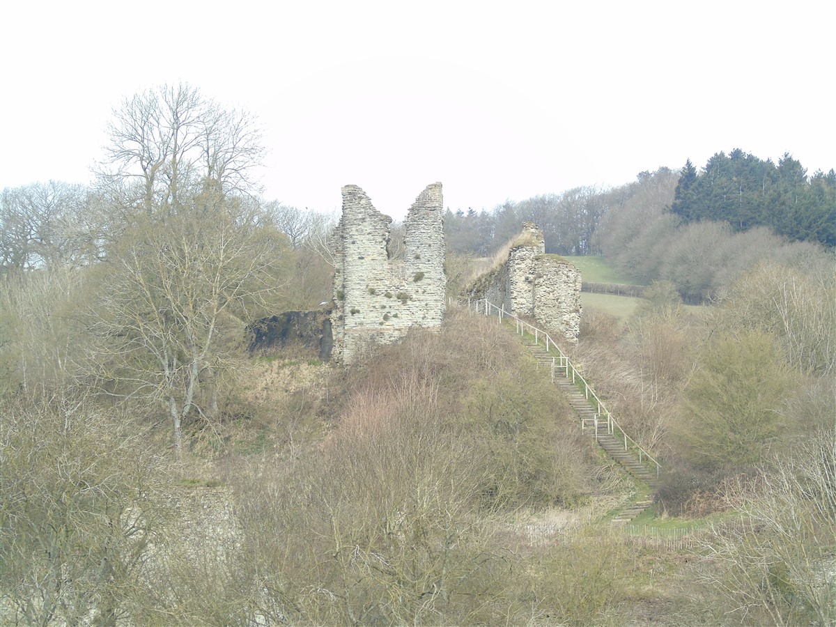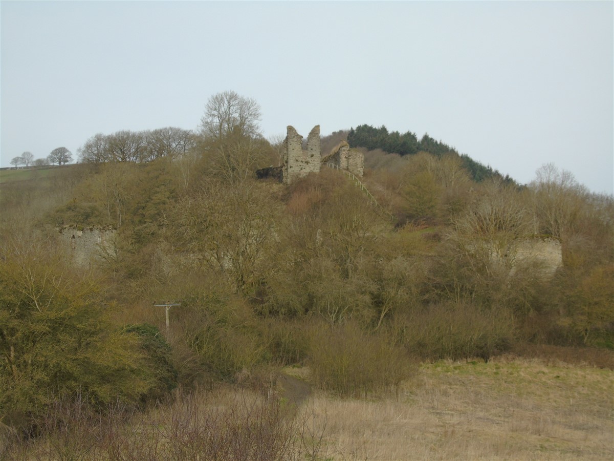 The Earthworks of the main castle have been formed by cutting a ditch across the spur to the N.W. and steepening the natural scarp to form the motte and by cutting two ditches with a medial rampart on the S.E. of the spur to form the bailey; the ditches die out towards the N. into the steep natural scarp, and both ditches are partly lost on the S. A causeway across the inner ditch forms the approach to the gatehouse, and a second causeway runs N.W. from the keep to the top of the spur beyond the keep-ditch, where a slight mound has been formed. S.E. of the bailey is a further enclosure defended by the scarp of the spur on the N.E., a ditch on the S.W. and a rampart on the S.E. The ridge to the S.E. of this enclosure is cut by four short ditches. To the N.E. of the scarp on that side of the castle itself a large enclosure is formed by two banks with ditches on their outward sides, running in a north-easterly direction. Both these works die out in the low-lying ground on that side. (RCHME 1934)