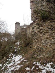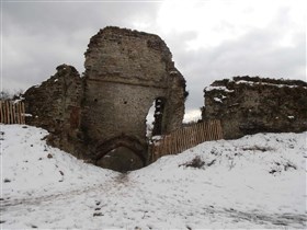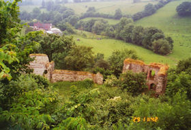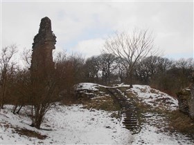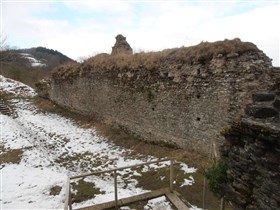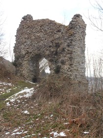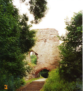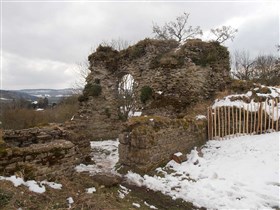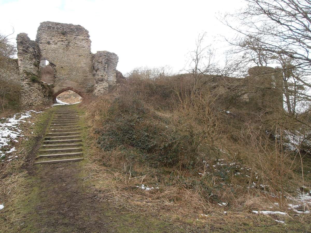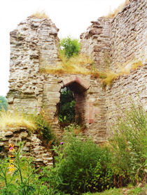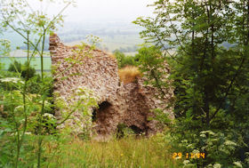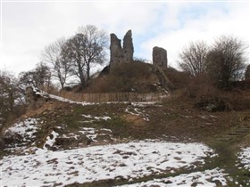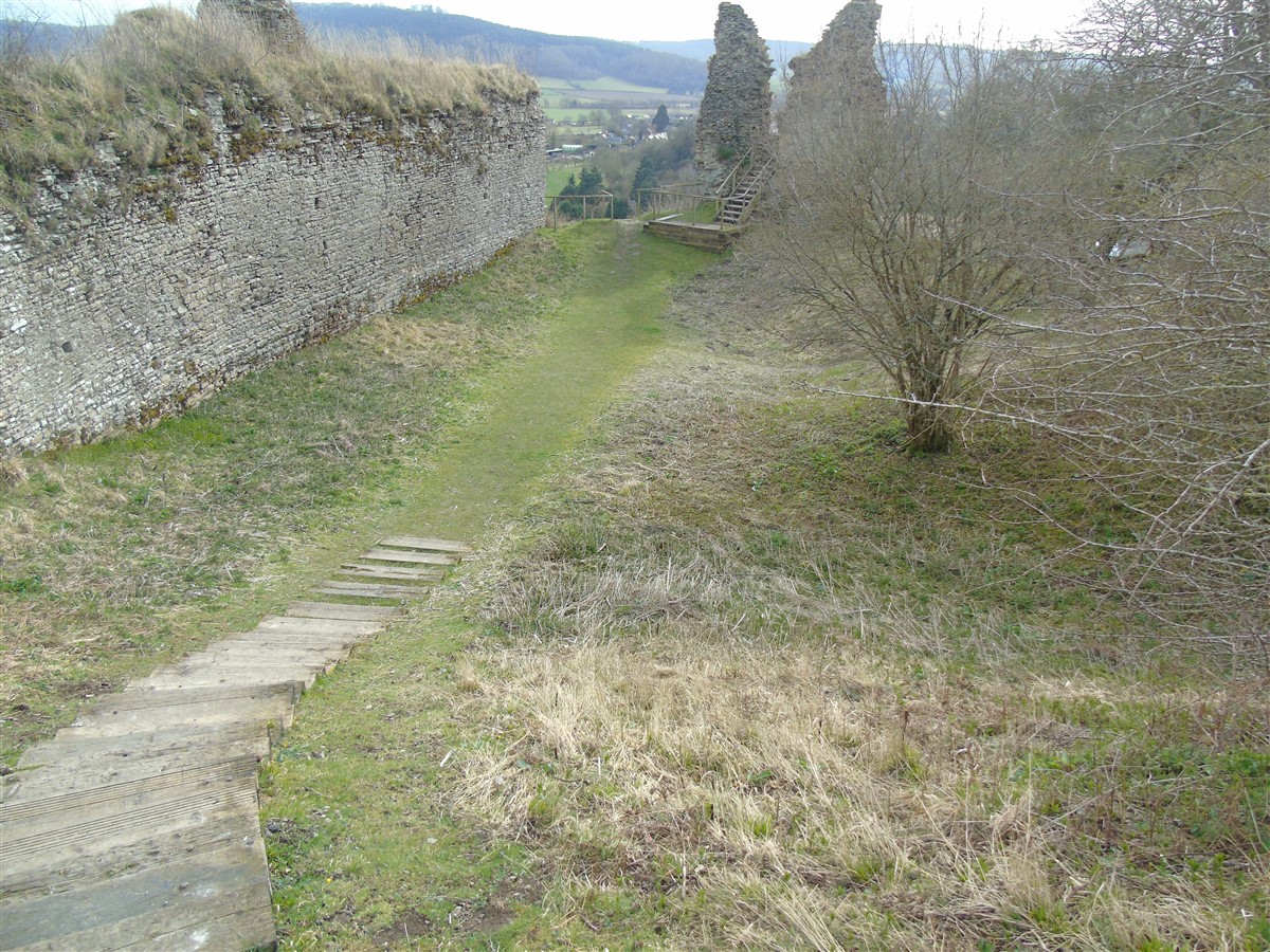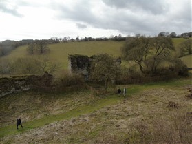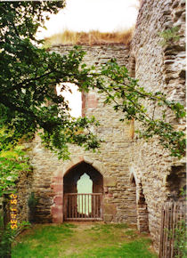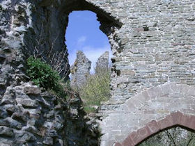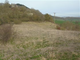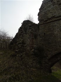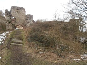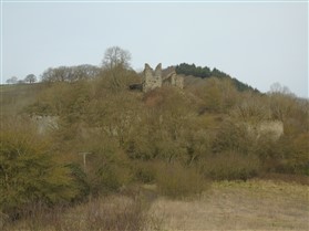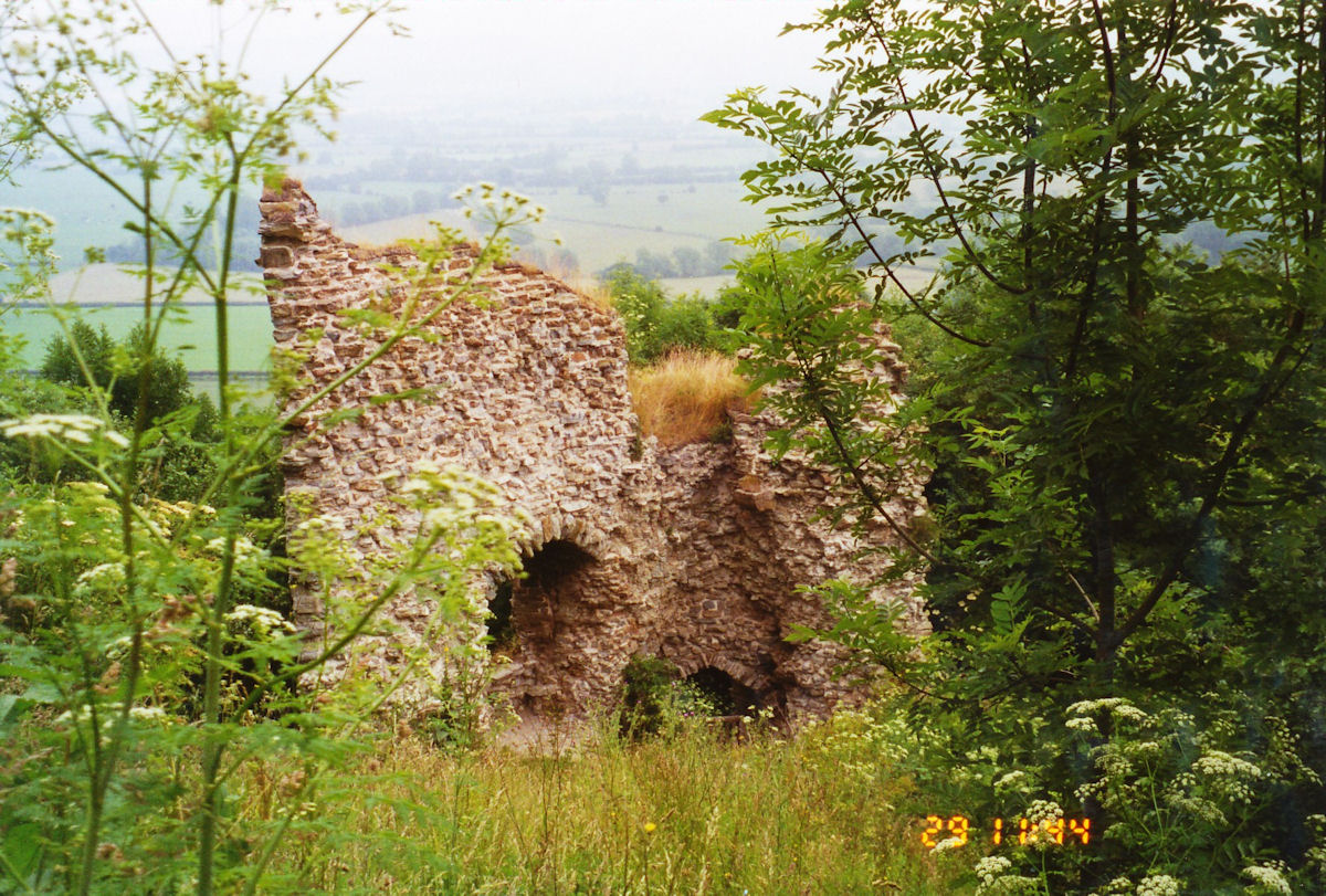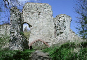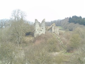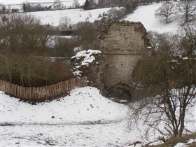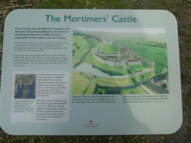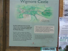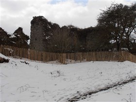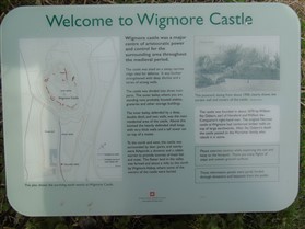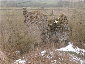 Wigmore Castle lies on the Welsh border and is one of the largest of its type. The original motte and bailey castle was built by William FitzOsbern, one of William the Conqueror's captains at the Battle of Hastings, in the mid 11th century. It soon came into the ownership of the powerful Mortimer family, and became their chief fortress from which they controlled large parts of central Wales. There is some 13th and 14th century masonry but the castle was rebuilt in the early 14th century by Roger Mortimer, who virtually ruled England after Edwards II's deposition and murder in 1327. Roger was subsequently executed by Edward III in 1330. The castle passed from the Mortimer family to the Duke of York in 1424, and ultimately to Edward IV, although it was rarely used and became partly ruinous. It was repaired in the late 16th century and used as a prison after Elizabeth I sold it to the Harleys of Brampton Bryan. The castle was partially dismantled in 1643 to prevent Royalist forces using it, and has been ruinous ever since. The castle was taken into guardianship in 1995 and repairs were completed in 1999, although much of the castle still remains buried up to first-floor level. Only earthworks of the outer bailey remain, and the gatehouse is half buried in its own fallen masonry. The early 14th century curtain wall extends from either side of the gatehouse, and includes three surviving residential towers. There are earthwork and stone remains of a huge rectangular hall, and a chamber block once lay at the far end. A half-octagonal tower completed this range. The inner bailey is situated on top of the motte; at the far west end is a keep, with only its stair turret visible above ground. The great ditch incorporates part of a natural feature and separates the castle from the ridge beyond. The castle is now in the care of English Heritage. (PastScape)