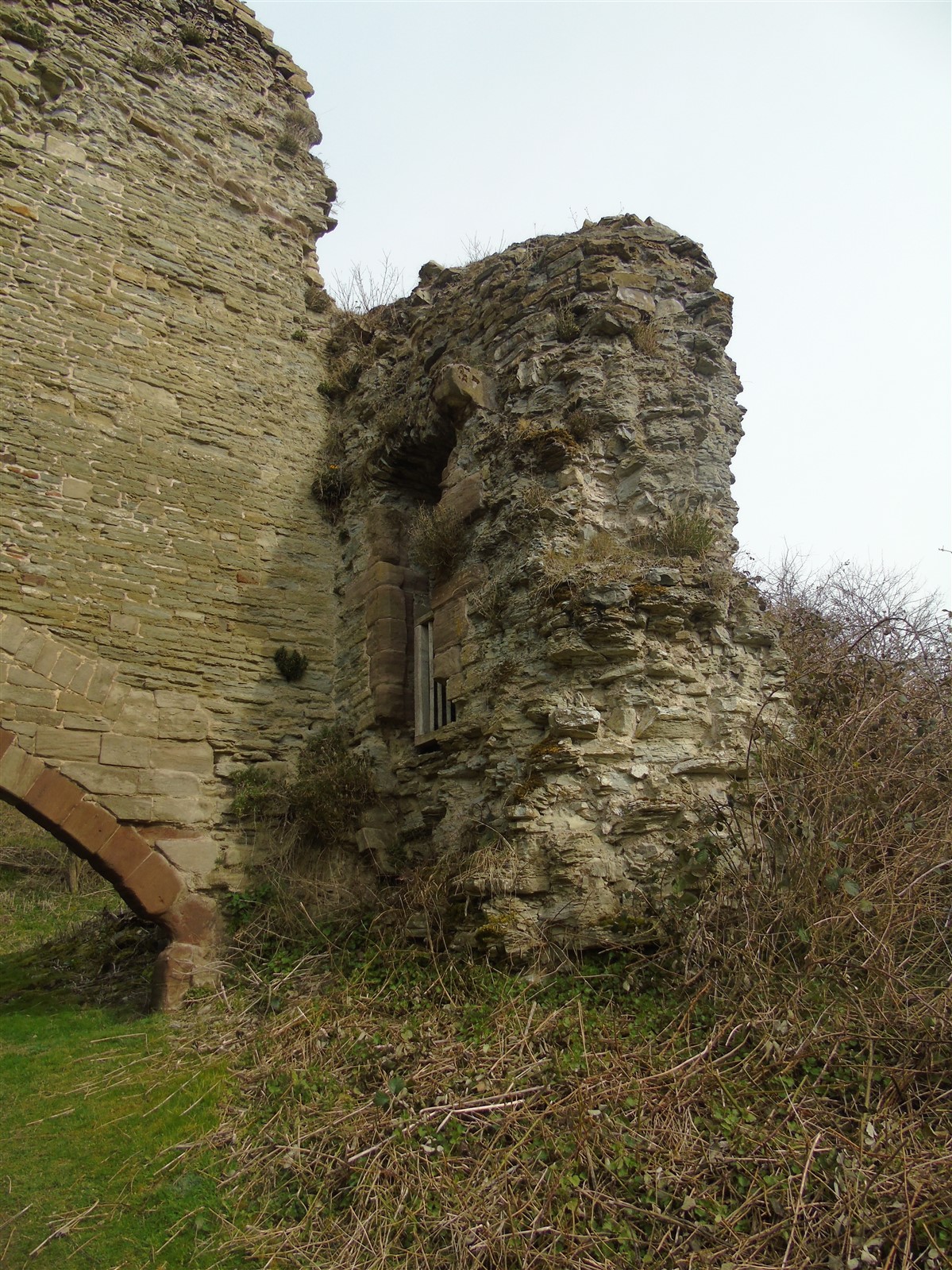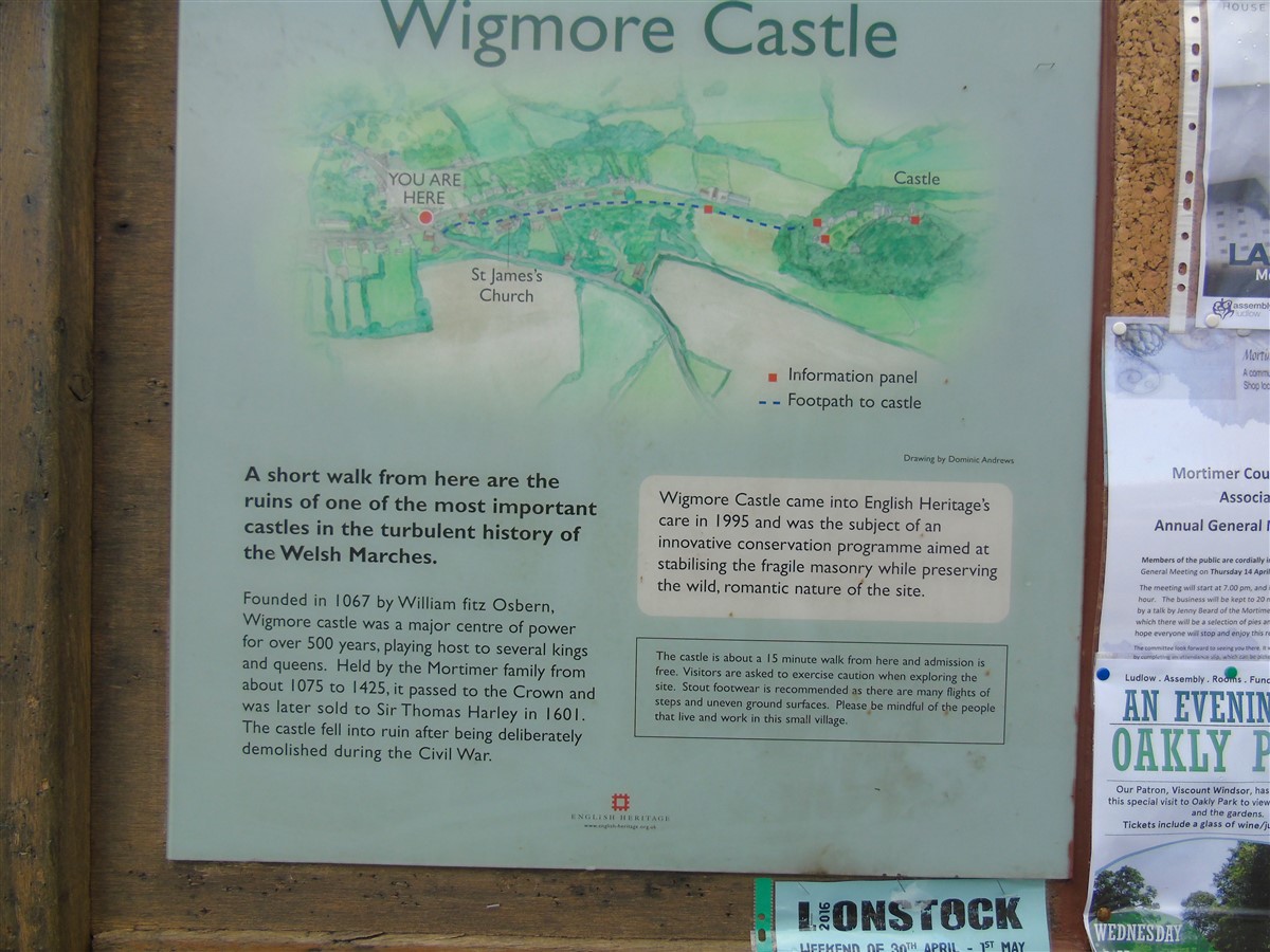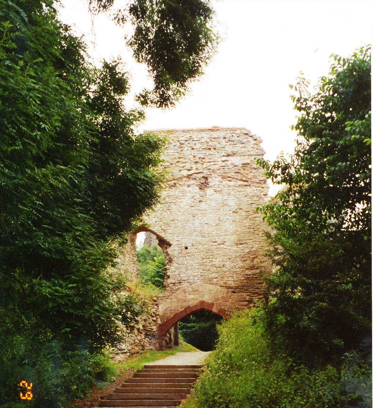 Multi-phase stone-built castle. Probable mid-C11 origins built by William Fitzosborn, Earl of Hereford and held by Ralph de Mortimer at the time of the Domesday Book Survey (1086). Some of the masonry is C12 and C13 but the structure was otherwise rebuilt during the early C14, probably by Roger Mortimer. It was repaired during the mid- to late C16 by Sir Henry Sydney and used as a prison. In 1643 it is said to have been dismantled by the Harley family who had bought it in 1601. Sandstone rubble with ashlar dressings. Present ruins consists of parts of the walls of a shell-keep on a mound to the north-west of the site, portions of the enclosing walls of the bailey to the south-east including three towers, a gatehouse and a single fragment of wall near the middle of the enclosure. Keep: roughly oval and entered from east side with a stretch of wall on the north side with a flat buttress and terminating in a second buttress. The upper part of this wall and the rest of the surviving walling of the keep is C14. There was also a south tower, of which the south wall remains with the embrasure of a single-light window, and a west tower, which must have been at least three storeys high and contained a spiral staircase. The main curtain wall carried up to the keep mound at the east end and the south side. North tower: C14. It retains its outward side and plinth and two of the faces have the remains of window embrasures. East tower: probably C13. Circular outward face with plinth survives with large window embrasure and grade-robe shaft. Gatehouse: C14. Only the central portion remains with a four-centred archway (half-choked with debris) of two orders; the outer moulded and the inner order chamfered, and between them is a portcullis groove. East of the archway is the remains of a small room with a west doorway, a right-angled passage and a rubble vault. The wall west of the archway has the remains of a window and door and adjoins a fairly well- preserved section of curtain wall. South tower: C14. Rectangular plan and of at least three storeys with a basement and a moulded plinth; the basement under the east half is approached by a square-headed doorway in the north-west angle down a flight of steps. The ground floor has four windows and a fireplace (the two south windows have cusped pointed heads) and there are four first floor windows. The curtain wall to the west is quite well preserved and adjoins the south-west tower: this was of similar date, plan and height to the south tower. The south wall has a plinth and second and third storey window. The adjoining curtain wall to the north has traces of a window, a chimney flue and an ogee-arched doorway. There are also the remains of a rectangular inner enclosure south-east of the keep mound. An engraving by Buck of 1732 shows little more of the building than presently survives. It was one of the largest castles built along the Welsh border and appears to have been a structure of the first importance. (Listed Building Report)