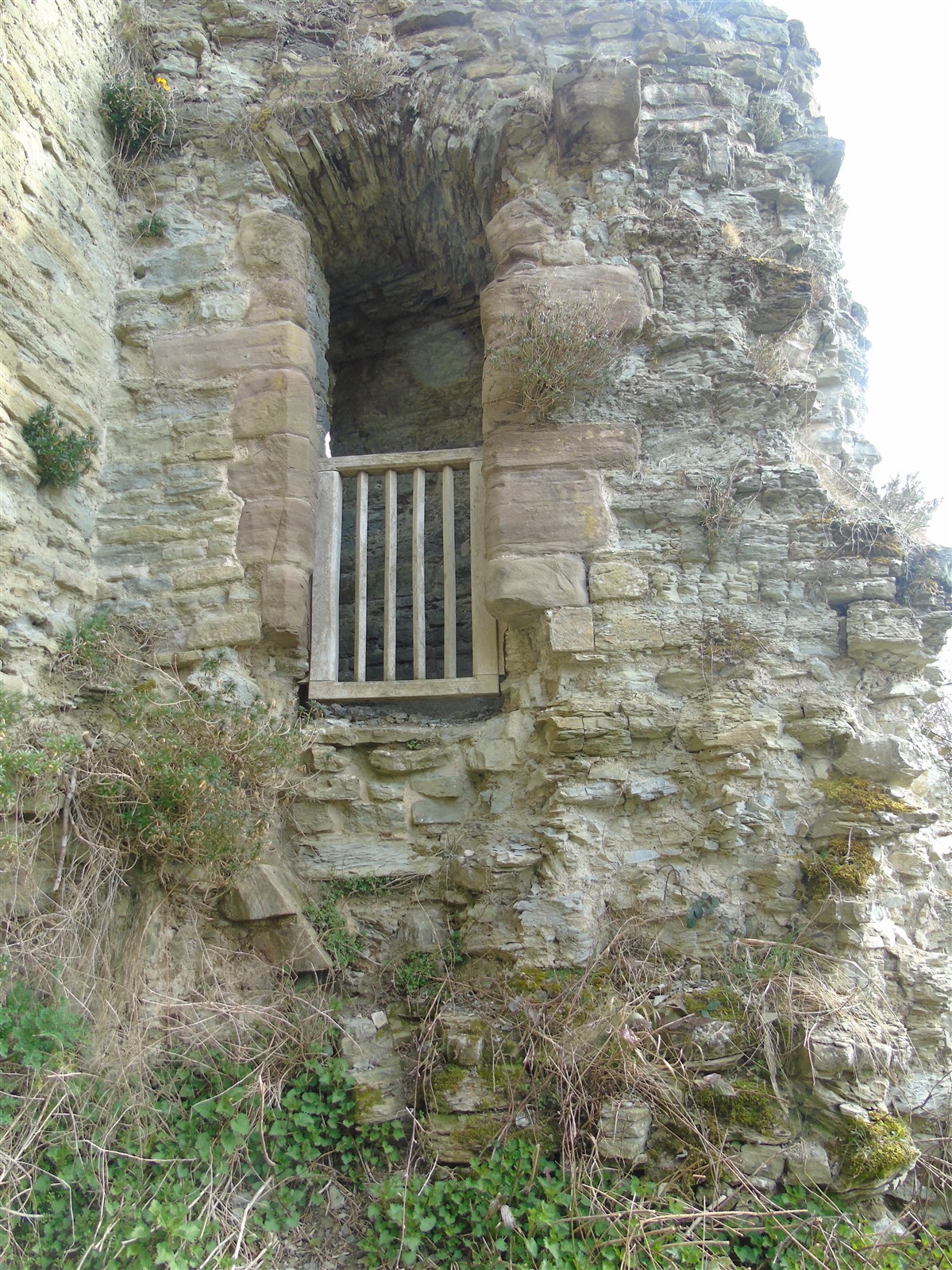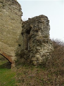 side, with a flat buttress and terminating in the remains of a second buttress; the lower part of the wall is perhaps of earlier date than the rest and consists of courses of squared and much smaller stones; the upper walling with the buttresses appears to be of the 14th century, as is the rest of the surviving walling of the keep. A gap represents the entrance at the E. end, and to the S. of it are the remains of a tower with a plinth-course and with the embrasure of a single-light window or loop; higher up is part of the embrasure of a second window, to the floor above. Only fragments remain of the S. wall of the keep, but at the W. end is the lofty fragment of a tower, at least three storeys high; it contained a spiral staircase and retains the jambs of doorways and windows on its E. and S. sides. The keep no doubt had a series of buildings abutting against the inside of the enclosing wall and probably with a small open court in the middle. The main curtain-wall of the castle was carried up the keep-mound at the E. end and on the S. side. A portion of this wall adjoins the keep at the E. end and contains the remains of an embrasure and a shaft, probably from a former garde-robe. The N.E. Tower (Plate 185) retains only its outward side with four faces and a plinth; two of the faces have broken window-embrasures. On the inner face is a corbel of the former first floor, and higher up are remains of a window. The tower is of the 14th century. The curtain between this and the E. tower is largely destroyed except for a length adjoining the latter, which has a chamfered plinth. The E. Tower (Plate 185) is probably of the 13th century and has a rounded outer face with a plinth. There is a large broken window embrasure on the S. side and a garde-robe shaft at the junction with the S. curtain; the inner face of the tower has fallen. Some of the curtain between this tower and the gatehouse is standing and has a plinth. The Gatehouse (Plate 185) retains only its central portion, astride the line of the curtain, the outer and inner parts being destroyed. It is a 14th-century structure with a central gateway having a segmental-pointed outer arch formerly of two orders, the outer moulded and the inner chamfered; between them is the portcullis groove; towards the N. the arch is rebated for doors. The archway is choked with rubbish to about half its height. E. of the archway are remains of a small room at the first-floor level entered by a door on the W. side with a right-angled passage and a rubble vault. The W. wall, within the gateway, has a set-back of 4½ ft. at the first-floor level with remains of a window on the W. and a doorway on the S. At the junction with the S. curtain is a garde-robe shaft. The adjoining length of curtain is fairly well preserved and contains a second garde-robe shaft. The 14th-century S. Tower (Plate 185) was a rectangular structure (38 ft. by 32 ft. externally), of which the N. wall has been destroyed. It was of at least three storeys and has a moulded plinth and a central cross-wall running N. and S. Under the E. half is a basement with a segmental stone vault and approached by a double square-headed doorway in the N.W. angle and a flight of steps. The ground floor has remains of four windows and fireplaces in the E. and W. walls; the S. windows retain their trefoiled heads. The first floor has similar windows in the S. and W. walls. There are considerable remains of the curtain between this and the S.W. tower. The S.W. Tower is a rectangular structure of the 14th century and appears to have been of three storeys; it is much destroyed on the S. side. In the lowest storey is an unlit room, now open on the E. side. The S. wall has a plinth with remains of a window in the second and third storey. The adjoining curtain on the N. has traces of a former window, a chimney flue and a doorway with an ogee head and a chamfered rib in the thickness of the wall; the outer face is broken away. An isolated fragment of curtain survives on the S. slope of the keep-mound. Within the bailey, to the S.E. of the keep-mound, are traces of a rectangular inner enclosure, with fragments of masonry exposed at certain points. Within this enclosure, a bank at the back of the N.E. tower may indicate the lines of a destroyed building.