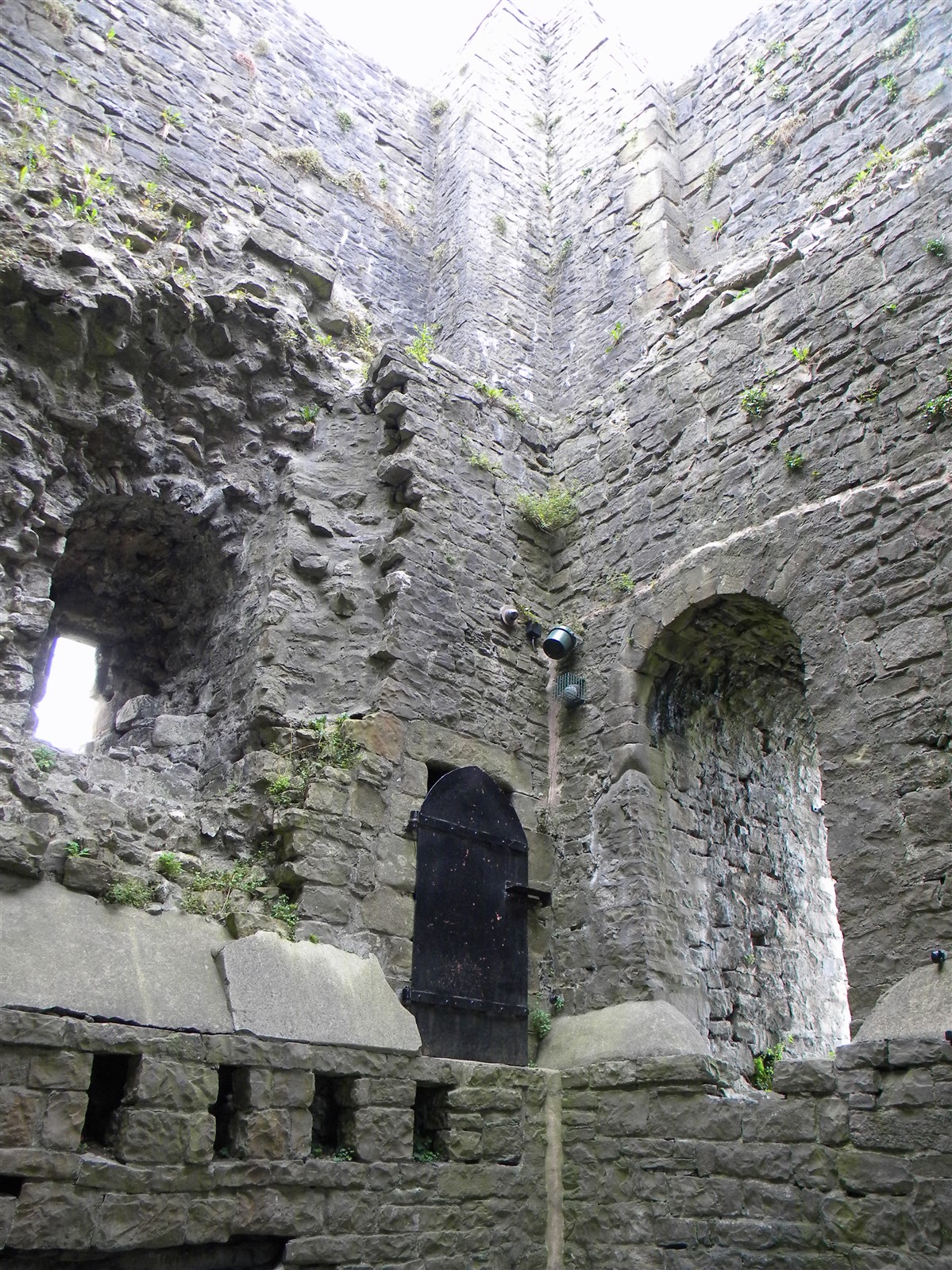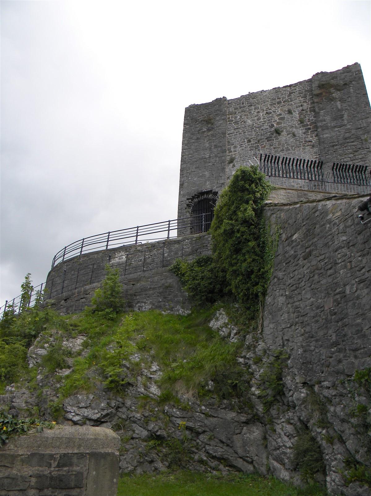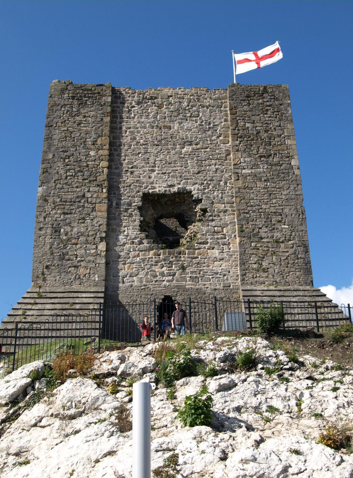 The castle is on top of an isolated crag, rising in the middle of the vale down which the River Ribble runs. The Castle consists of a circular walled keep on the northern and highest part of the crag. Within which stands a tall, square tower. To the south of this and at a lower point of elevation of the slope, lies an oblong bailey. The mound is apparently a natural, semi-circular rock, possibly scraped artificially in places. It is most precipitous on the north and west. The top is truncated and nearly circular, with a diameter of c.80ft and is at least 22ft higher at the north end of the bailey. The mound has a wall on every side except the south where the bailey abuts it. The encircling wall is 12ft from the inside and 6ft thick, built of limestone rubble. On the southern half of the summit area a square tower is built inside the wall. Possibly there was an outer court at a still lower level than the bailey. No fosses are now visible, but they did exist. Castle ditches and moats are mentioned in a document of 1304. The ancient entrance to the castle was on the eastern side and the approach on the west seems to be of more recent origin