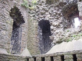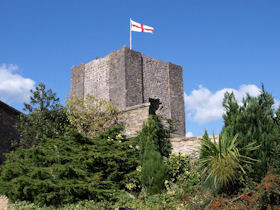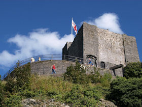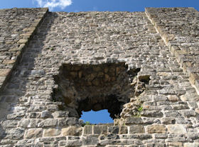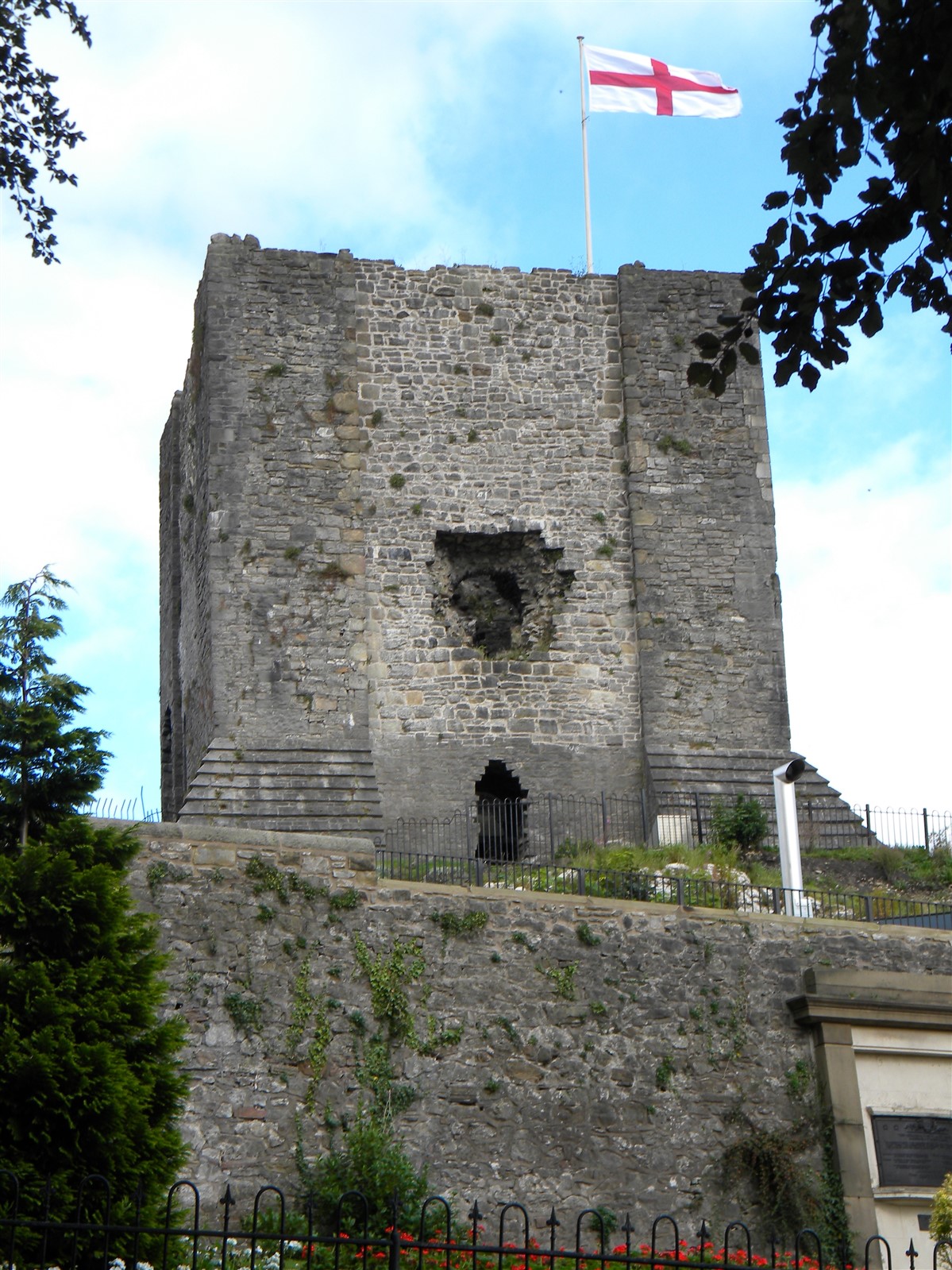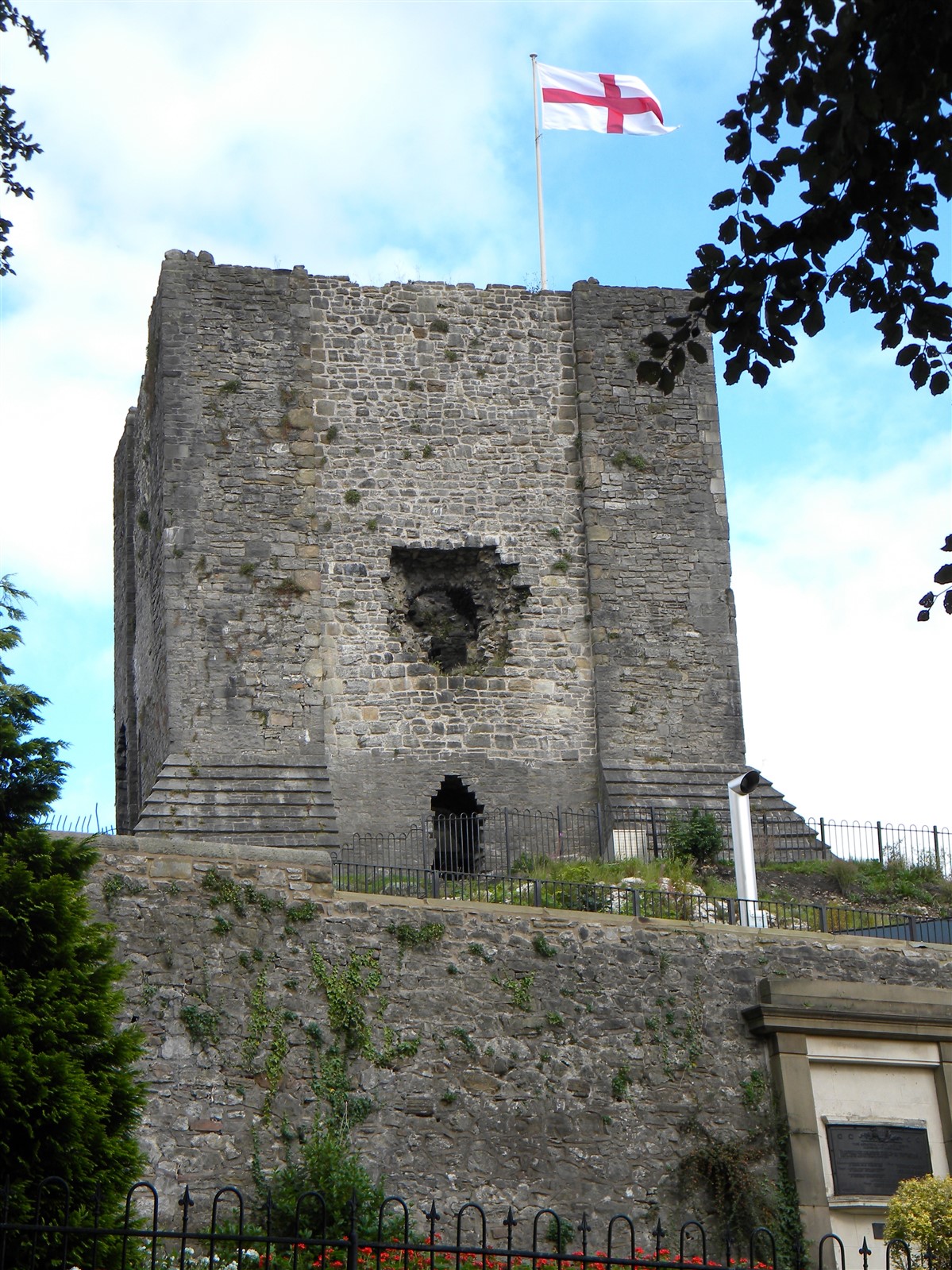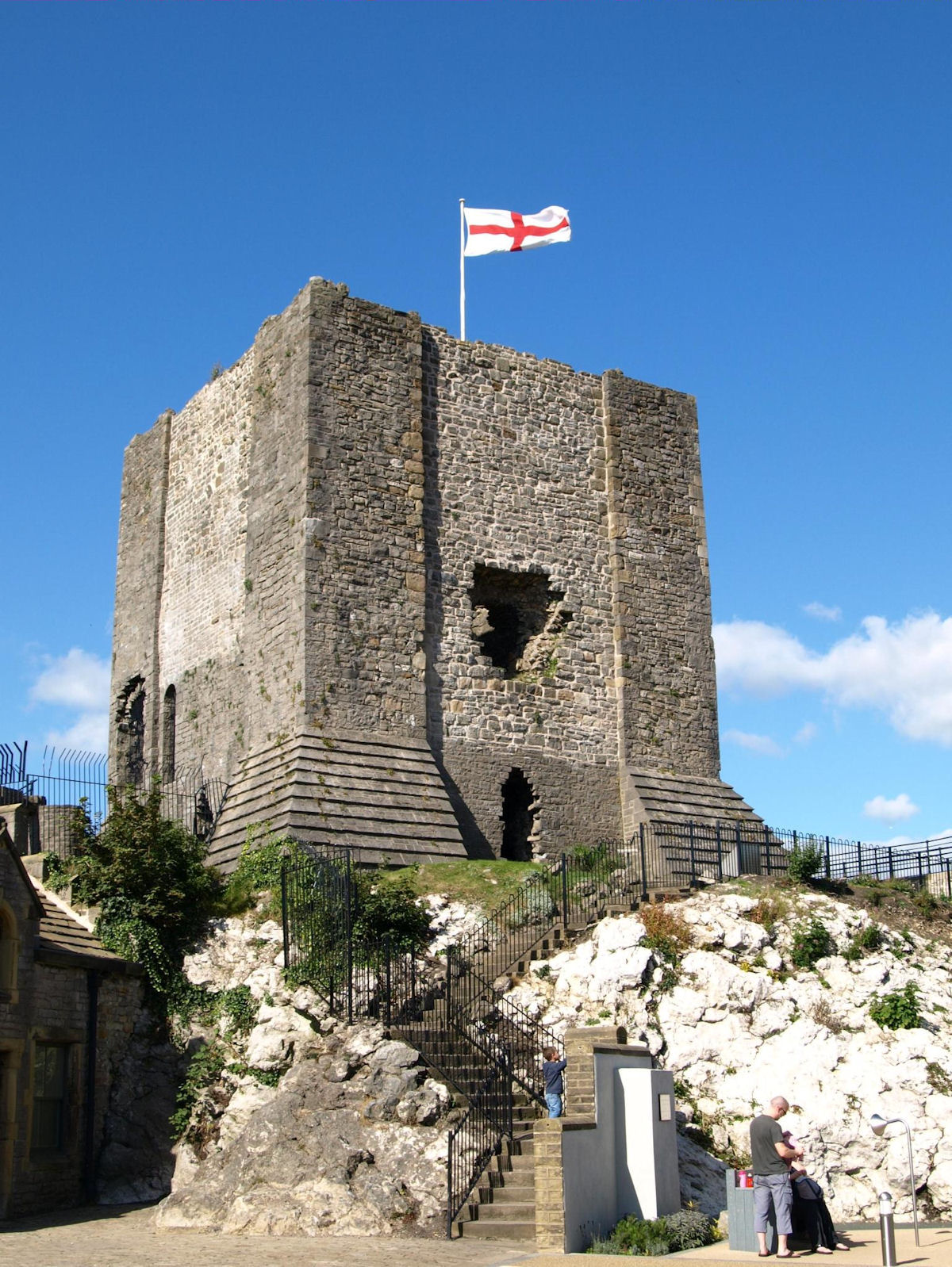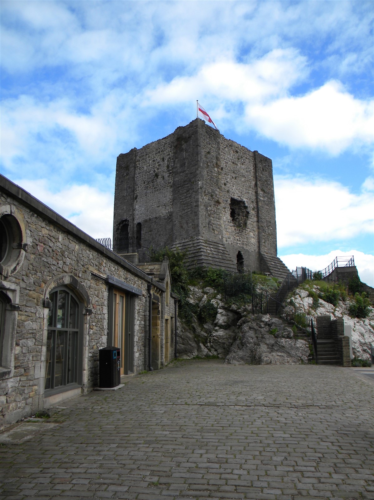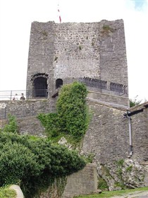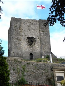 The monument includes the upstanding and buried remains of Clitheroe Castle, an enclosure castle constructed during the late C11 to early C12. The surviving medieval parts of the castle include the stone keep and the adjacent curtain wall which surrounds the keep on all sides except the south. A bailey lies to the south of the keep and was originally surrounded by a curtain wall. The keep is at present (1997) roofless and floorless and was originally a three storied building. Entrance to the bailey was originaly through a gatehouse. This gatehouse has now been demolished but its remains survive as a buried feature. (PastScape)