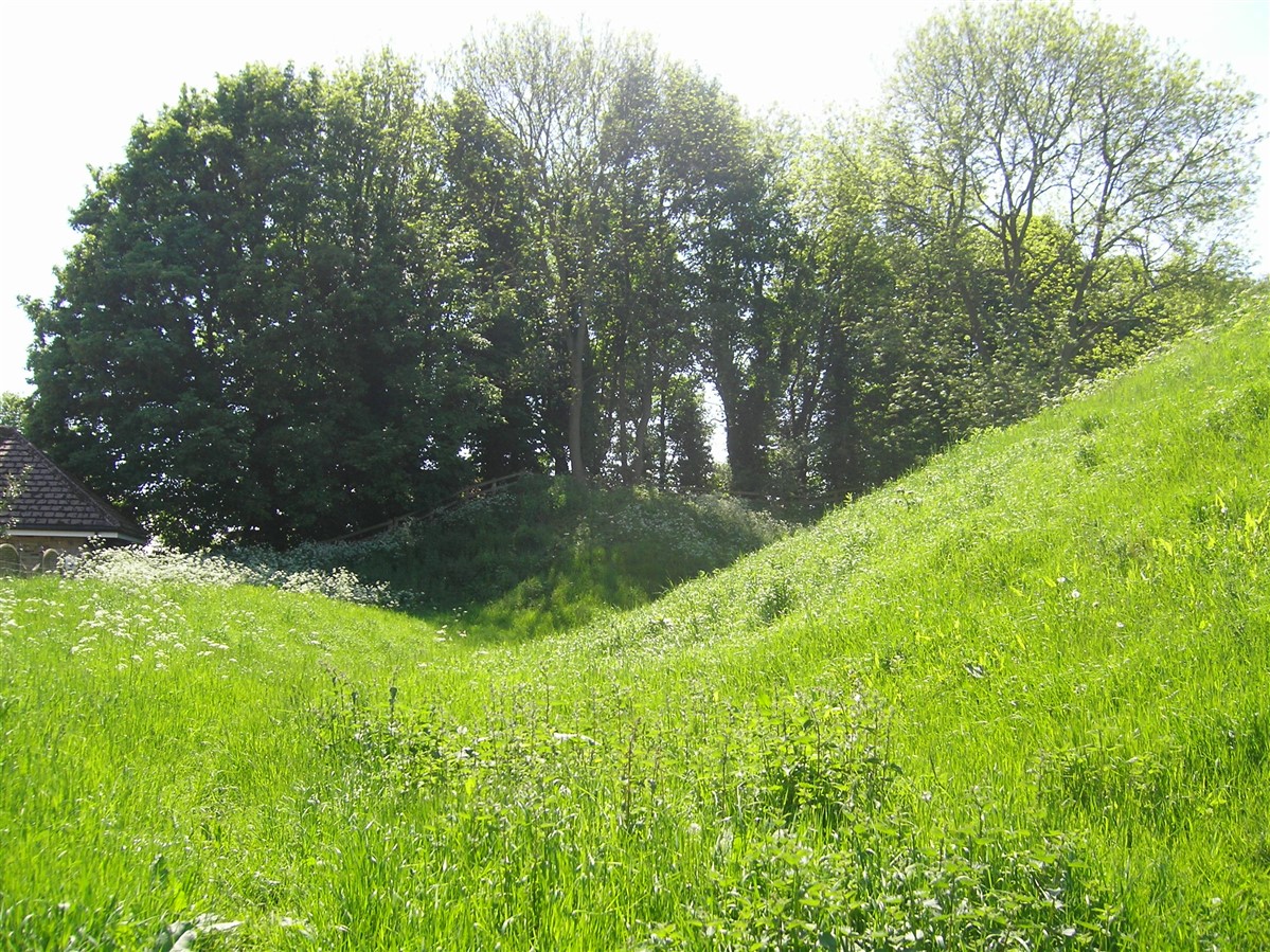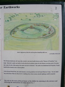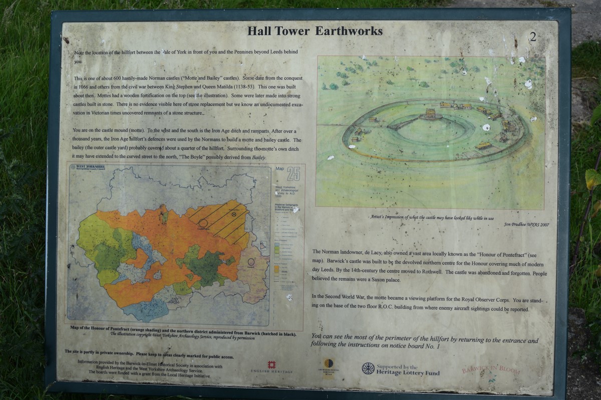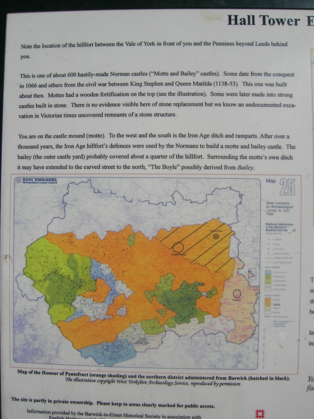The east side of the bailey, which originally extended beyond the limits of the earlier hillfort, has largely been built over by urban development within Barwick in Elmet, but sufficient remains to contain ample buried evidence of the domestic and garrison buildings that formerly occupied it. When the motte was built it would have been crowned by a timber tower and palisade, but there is as yet no evidence that this was ever replaced in stone. The castle was built by the de Lacy family, who held the Honour of Pontefract throughout most of the Middle Ages, and was the administrative centre of the northern part of the Honour; a role it took over from the ringwork castle at Kippax. The de Lacys also held the motte and bailey castle at Almondbury which, coincidentally, was also built inside a hillfort. (Scheduling Report)