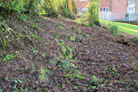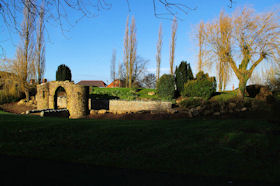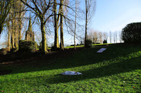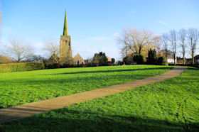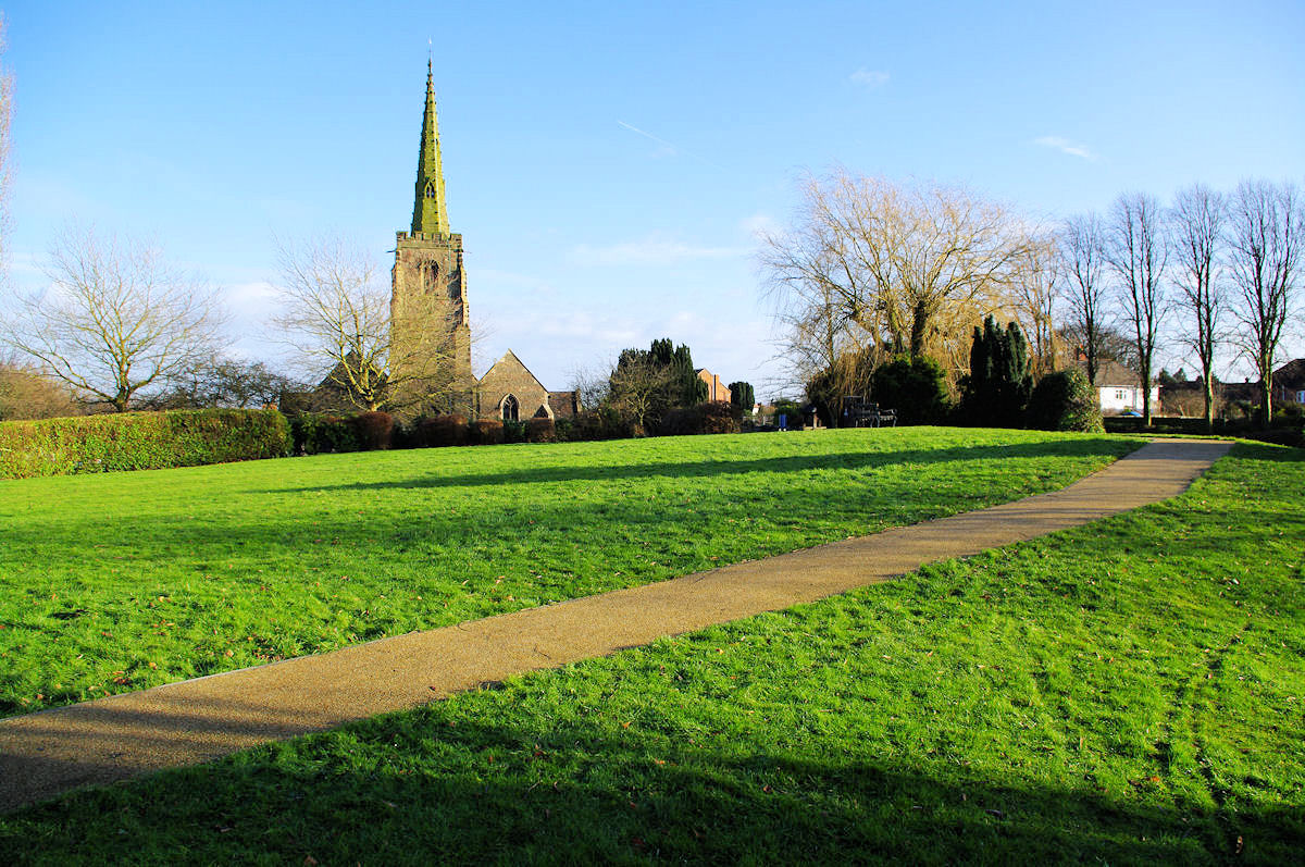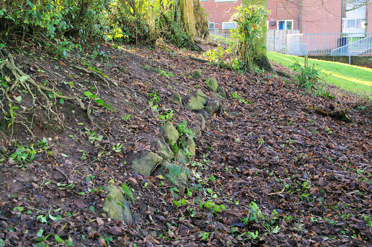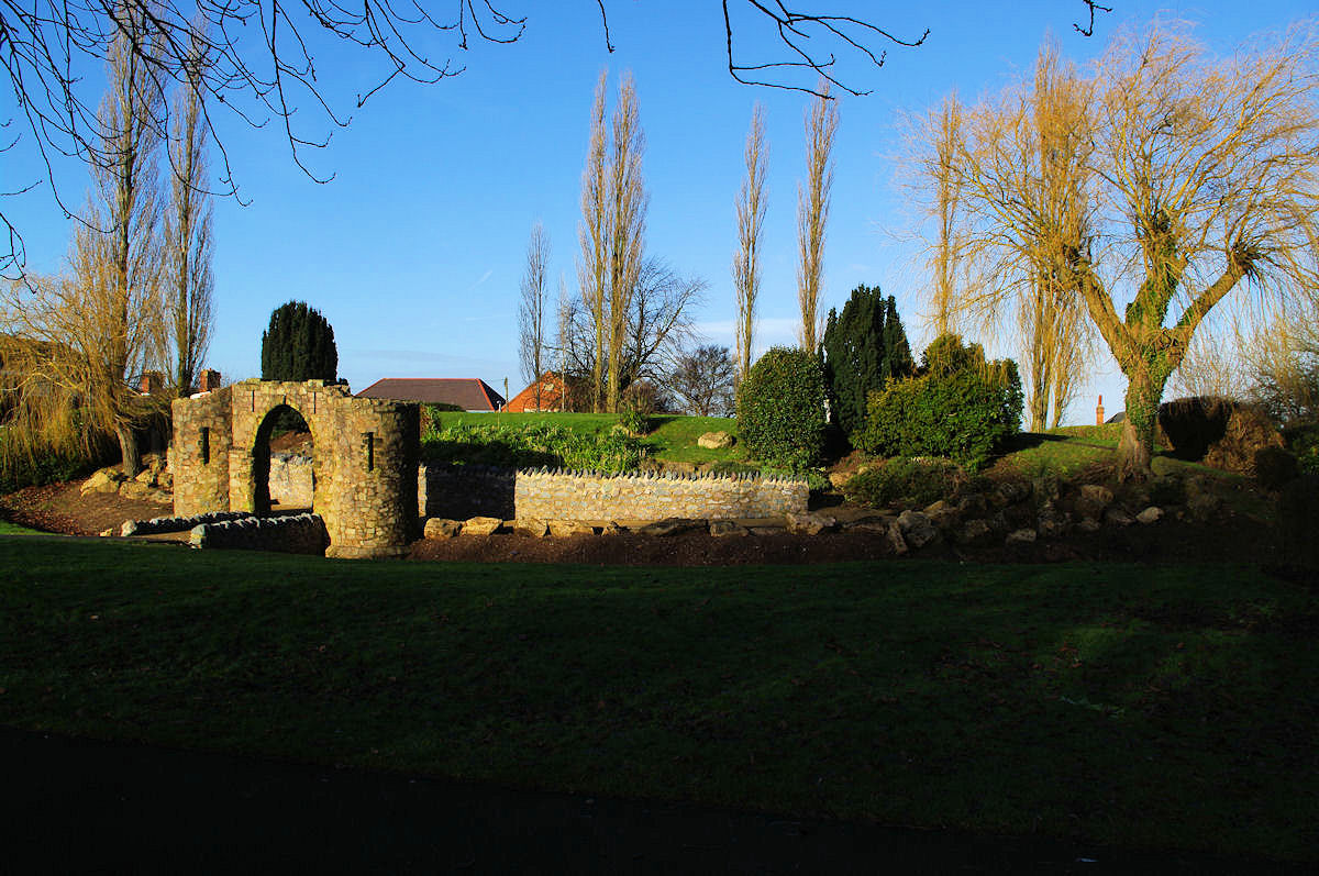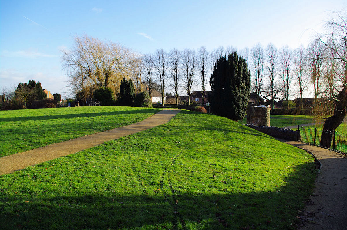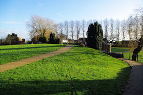 The 'Castle Yard' contains the mount (a complex escarpment of 18ft), on which a castle of Simon de Montfort stood. The slightly hollowed top of the mount is still discernible but is now a kitchen garden. Originally much larger, the moat (nearly obliterated by buildings) is 6ft wide and 4ft deep, with an entrance at the south-east. The bailey was enlarged and adapted to a manorial residence. (VCH). The castle mound now situated in, and forming part of, a public path. Gardening/landscaping has grossly mutilated the original profile and pseudo drum towers and a footbridge have been constructed over a newly dug ditch in the southern face. The original ditch can be partially traced and attains a max depth of 1.2m; the mound has a height of 3.3m above the original ditch. There is no surface indication of a bailey although the park to south-west and the churchyard to the east are both significant. (Field Investigators Comments-F D Colquhoun/04-JUL-1972/Ordnance Survey Archaeology Division Field Investigator) The circular motte is 50m in diameter. It is 3.0m high on the south side, 1.5m high on the north side, and flat-topped. The remains of the ditch and part of the bailey can be seen on the south side, but are much mutilated. The bailey bank to the south is 50m long and up to 1.0m high. The castle was founded by the Earl of Leicester soon after the Conquest, and demolished in the late C12. (scheduling report). (PastScape)